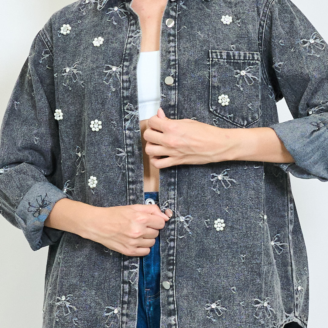 Sticked Bogen und Perlenblume gewaschene Jeanshemd Großhandel