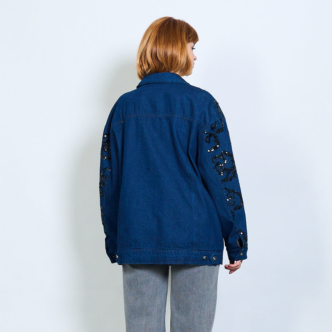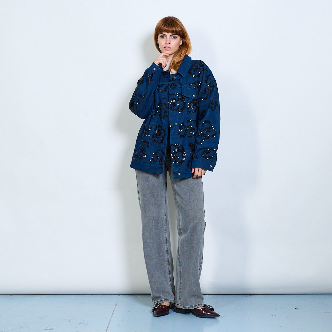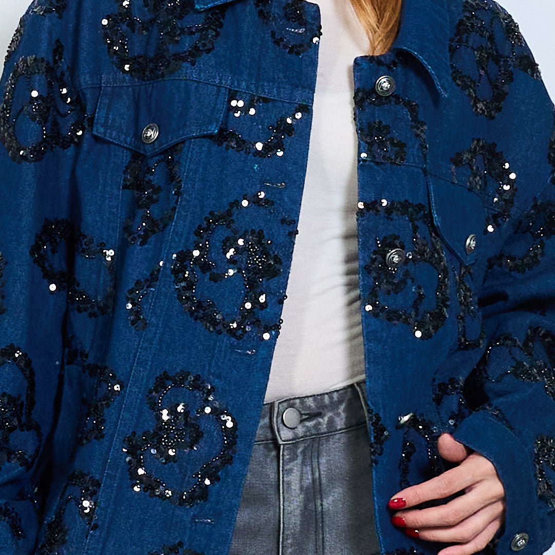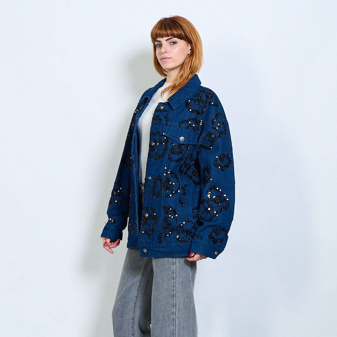 Abstrakte Pailletten bestickte Denimjacke Großhandel