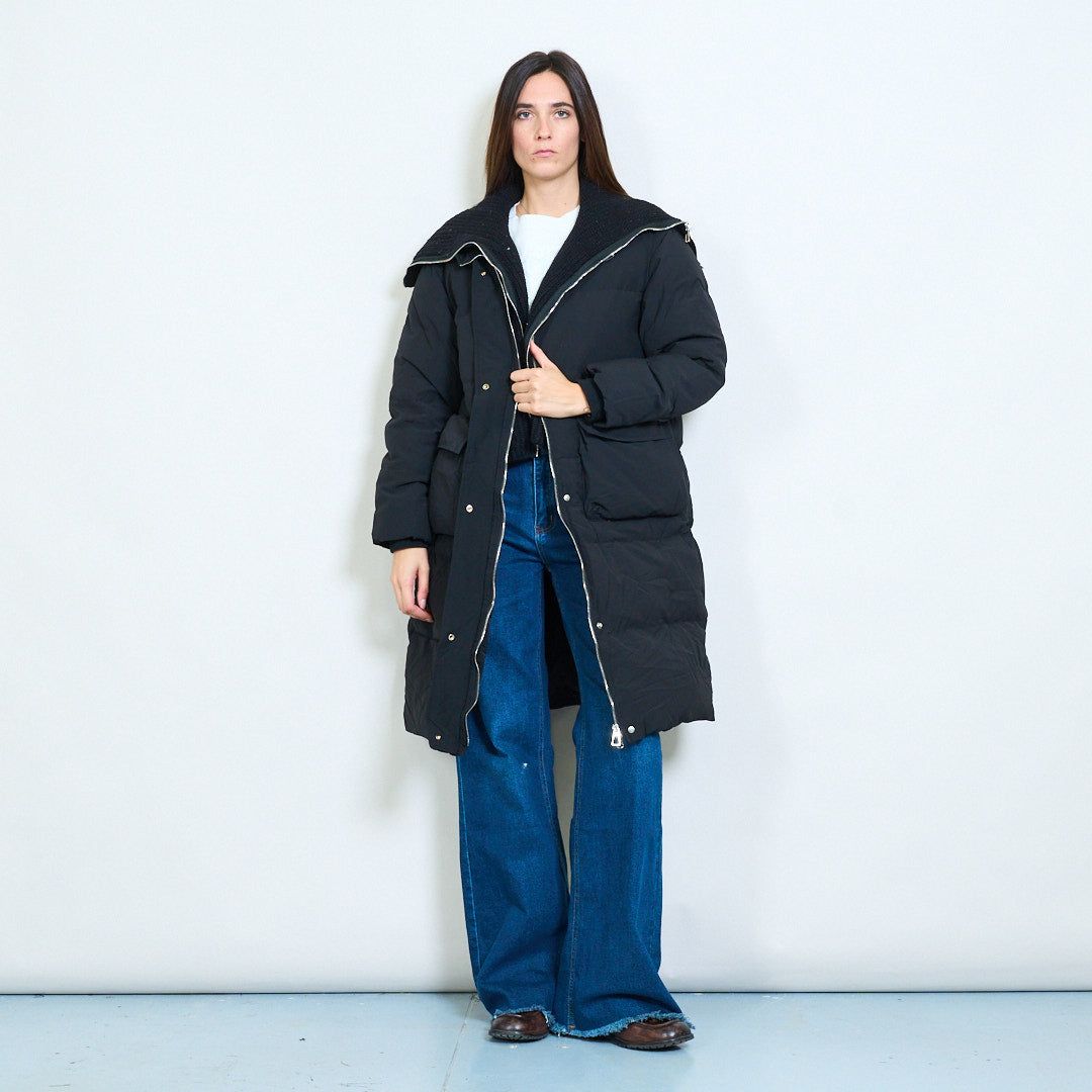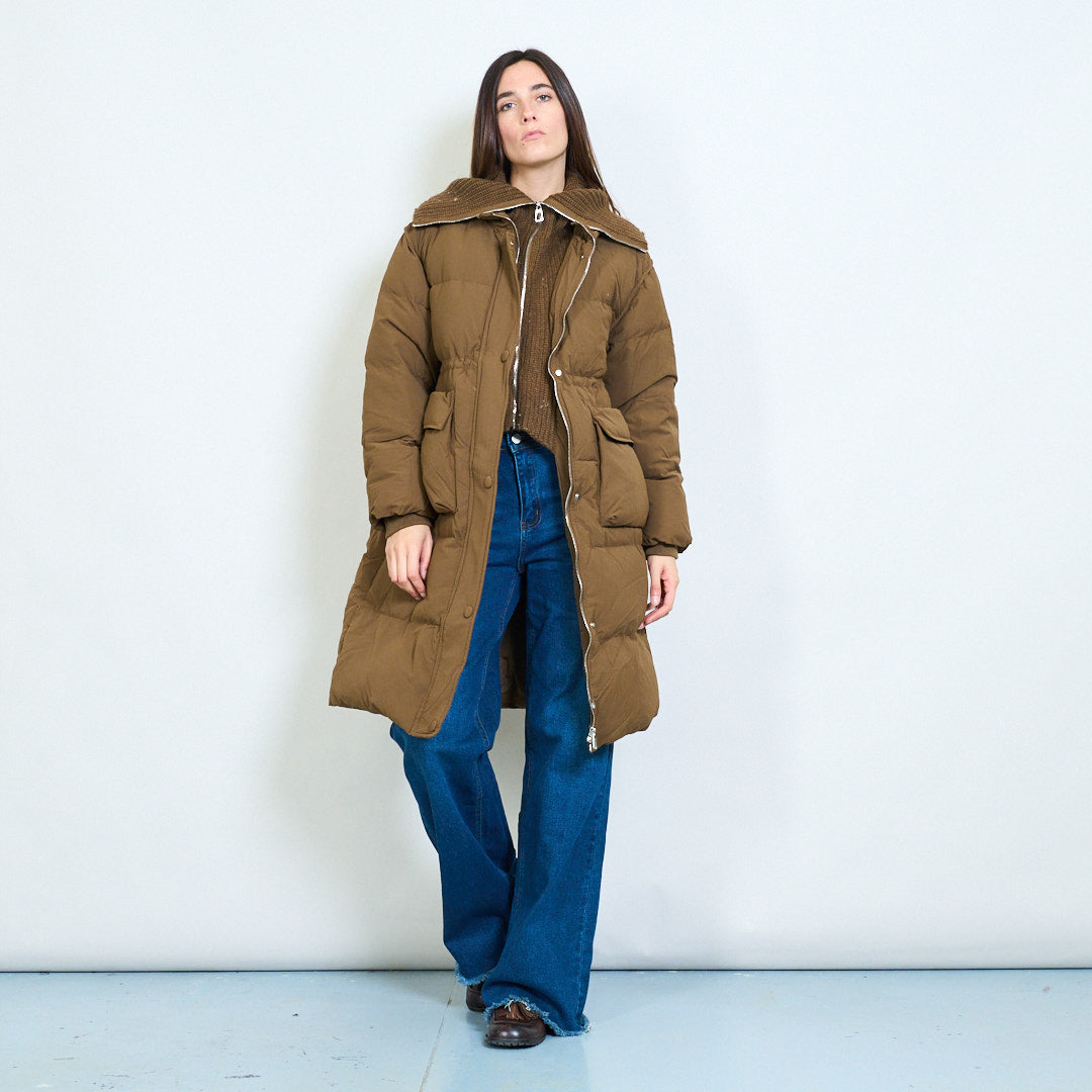 Langer Puffermantel aus Entendaunen mit geripptem Kragen und übergroßen Taschen im Großhandel