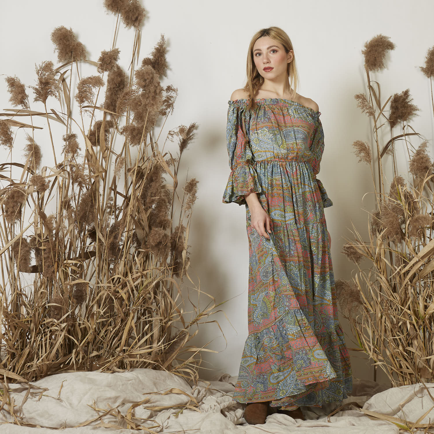 Langes bedrucktes Seidenkleid mit Puffärmeln im Großhandel