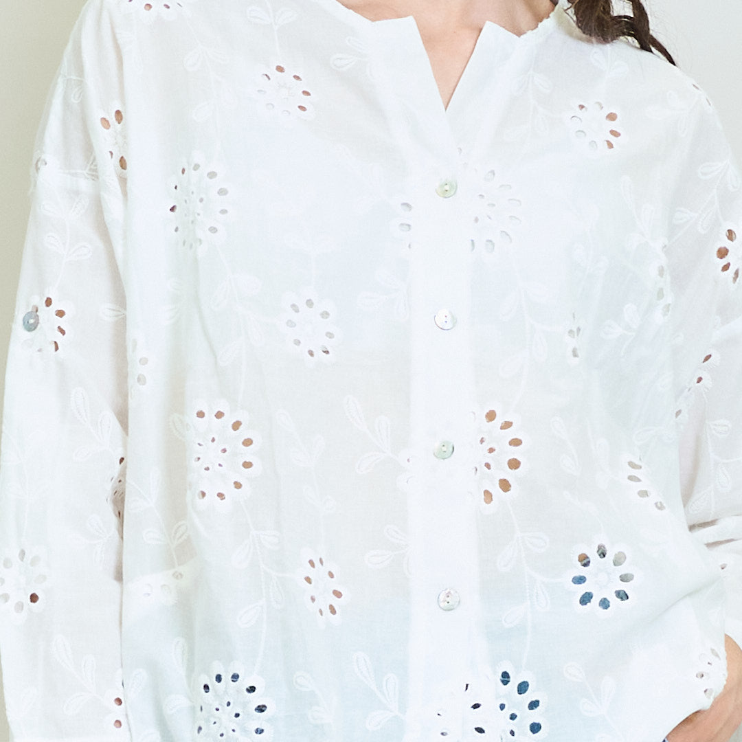 Florale Öse Stickerei Asymmetrischer Button-up Langarmbluse Großhandel