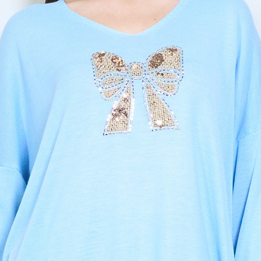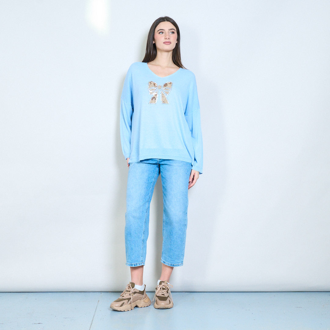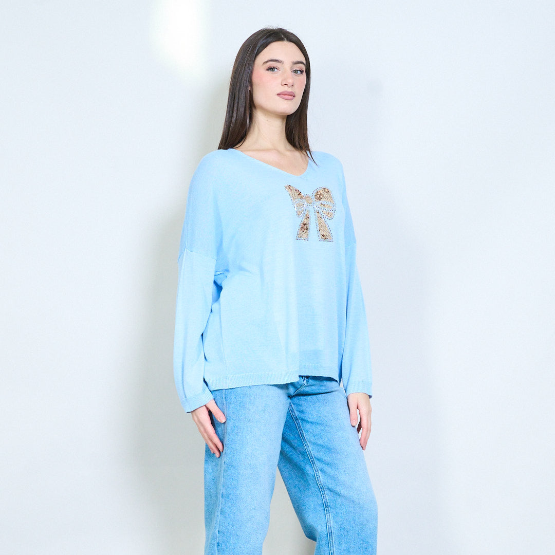 Strickpullover mit V-Ausschnitt und Pailletten-Schleifendetail im Großhandel