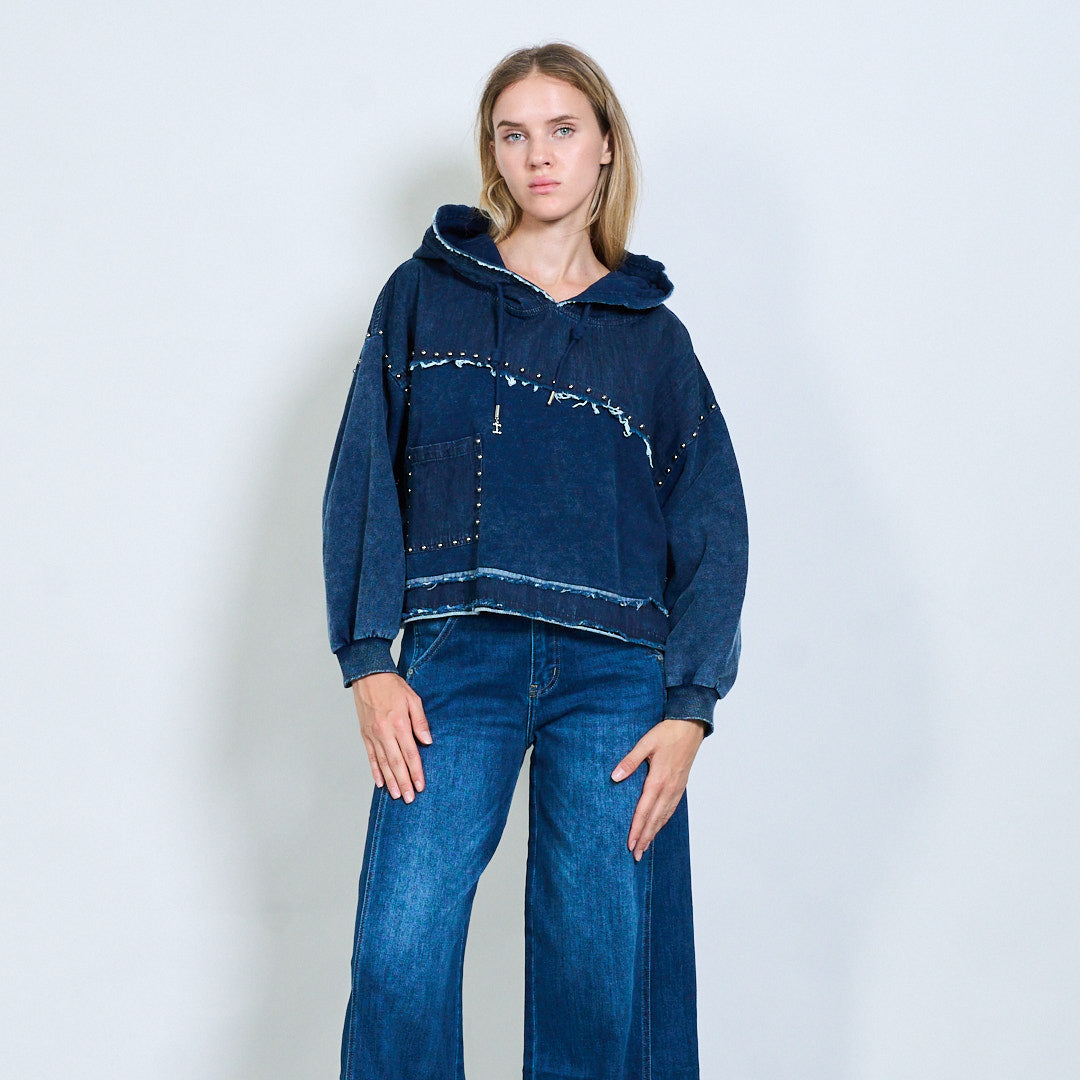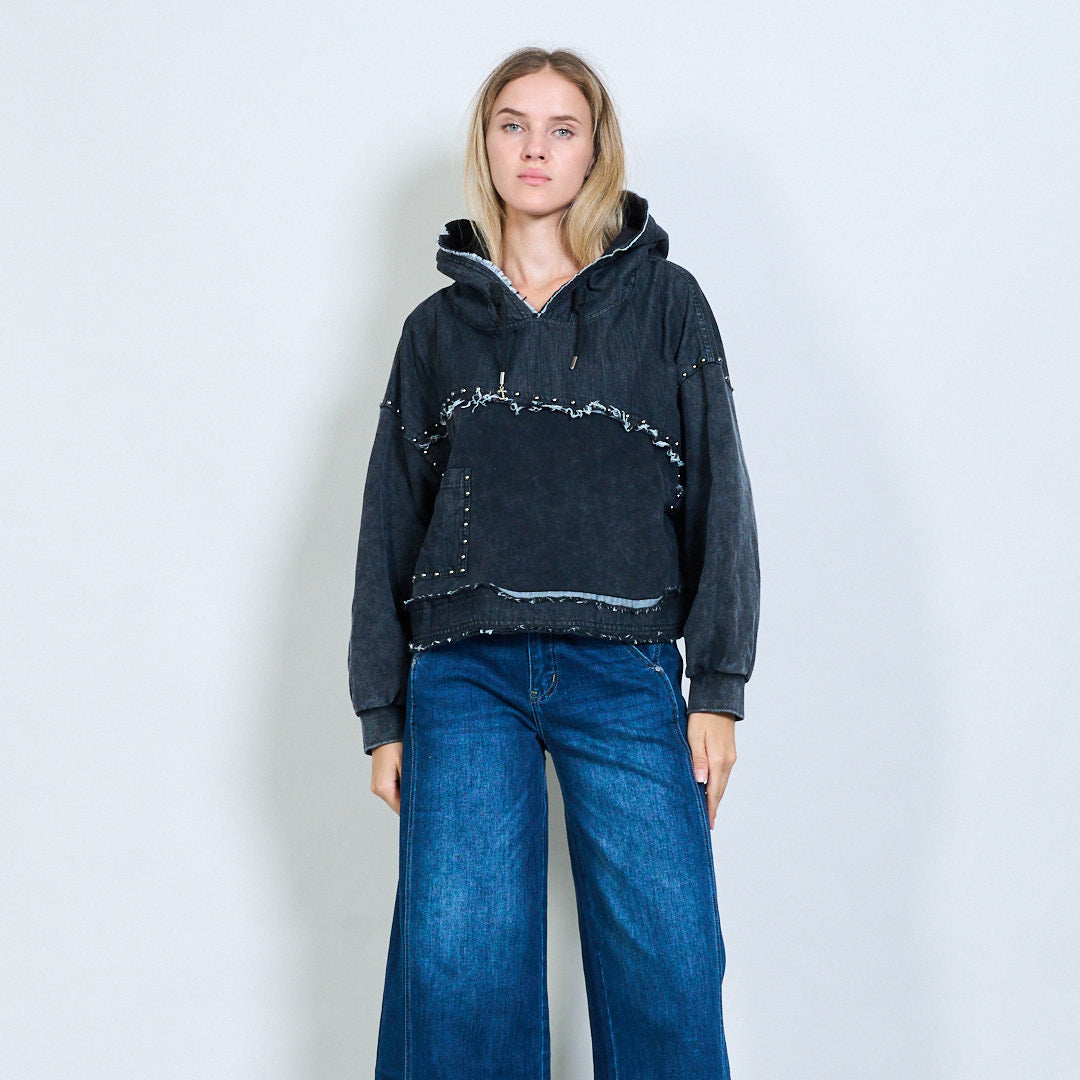 - Diagonale Naht mit ausgefransten Details für einen kantigen Stil