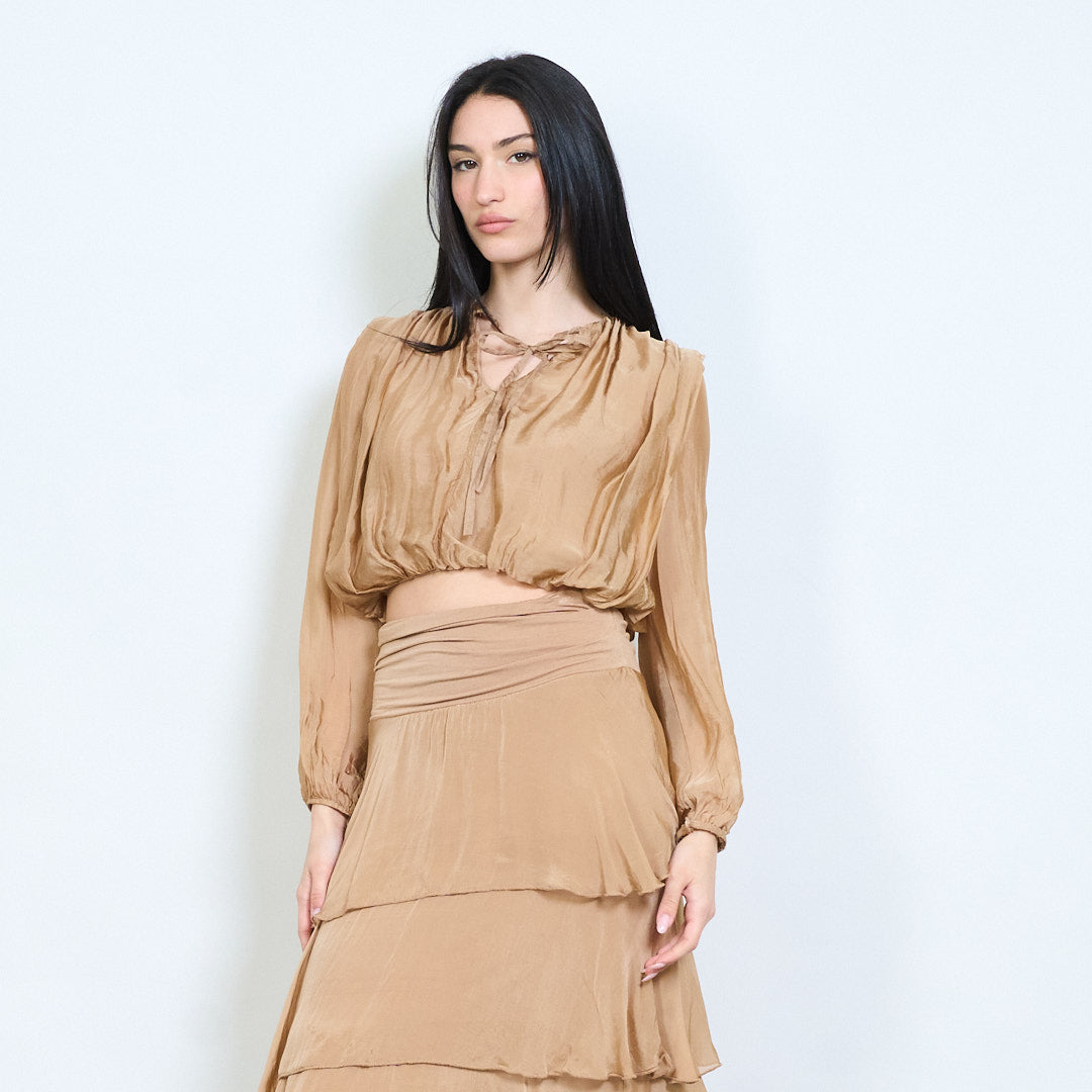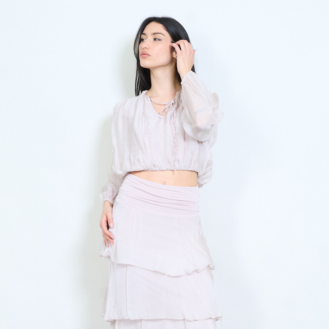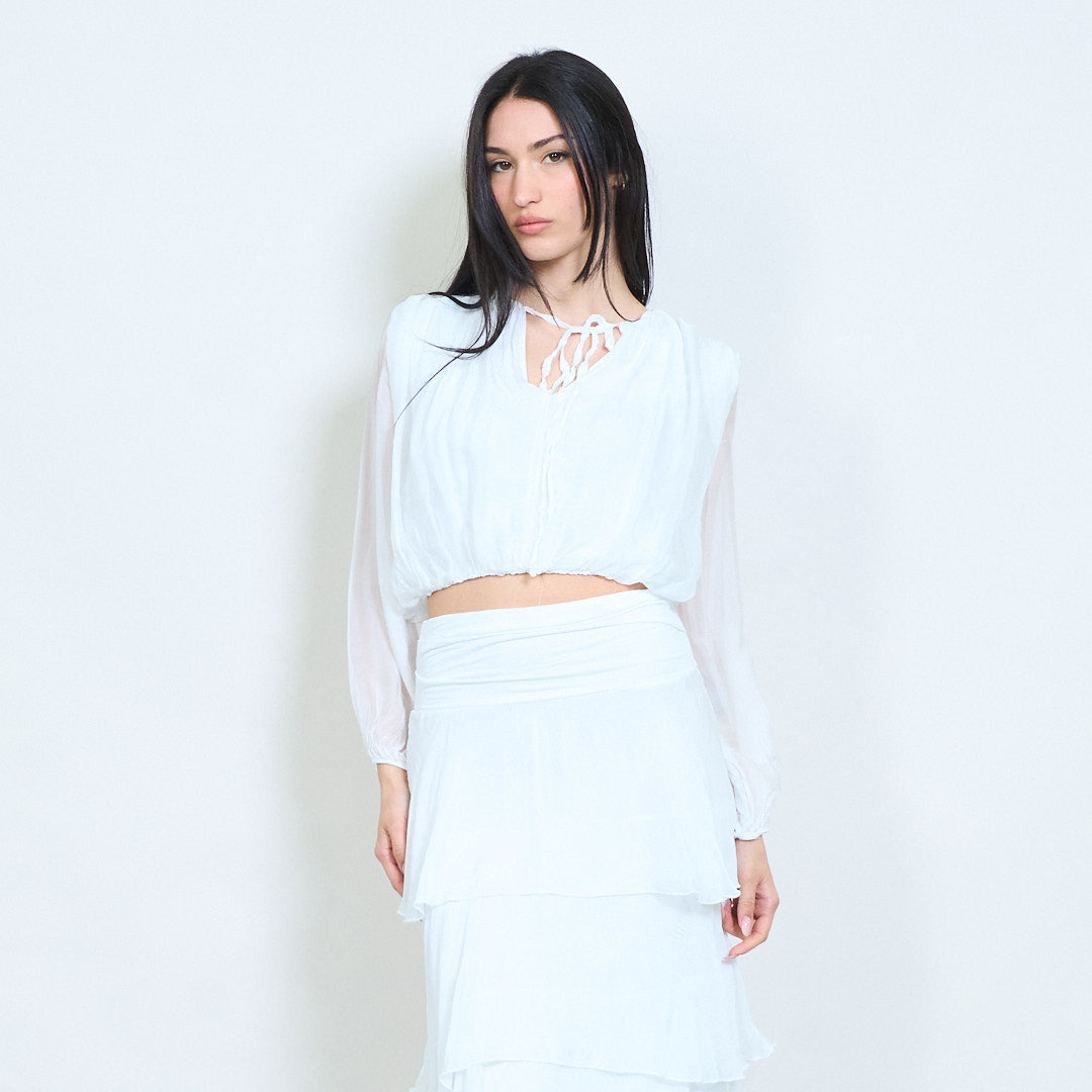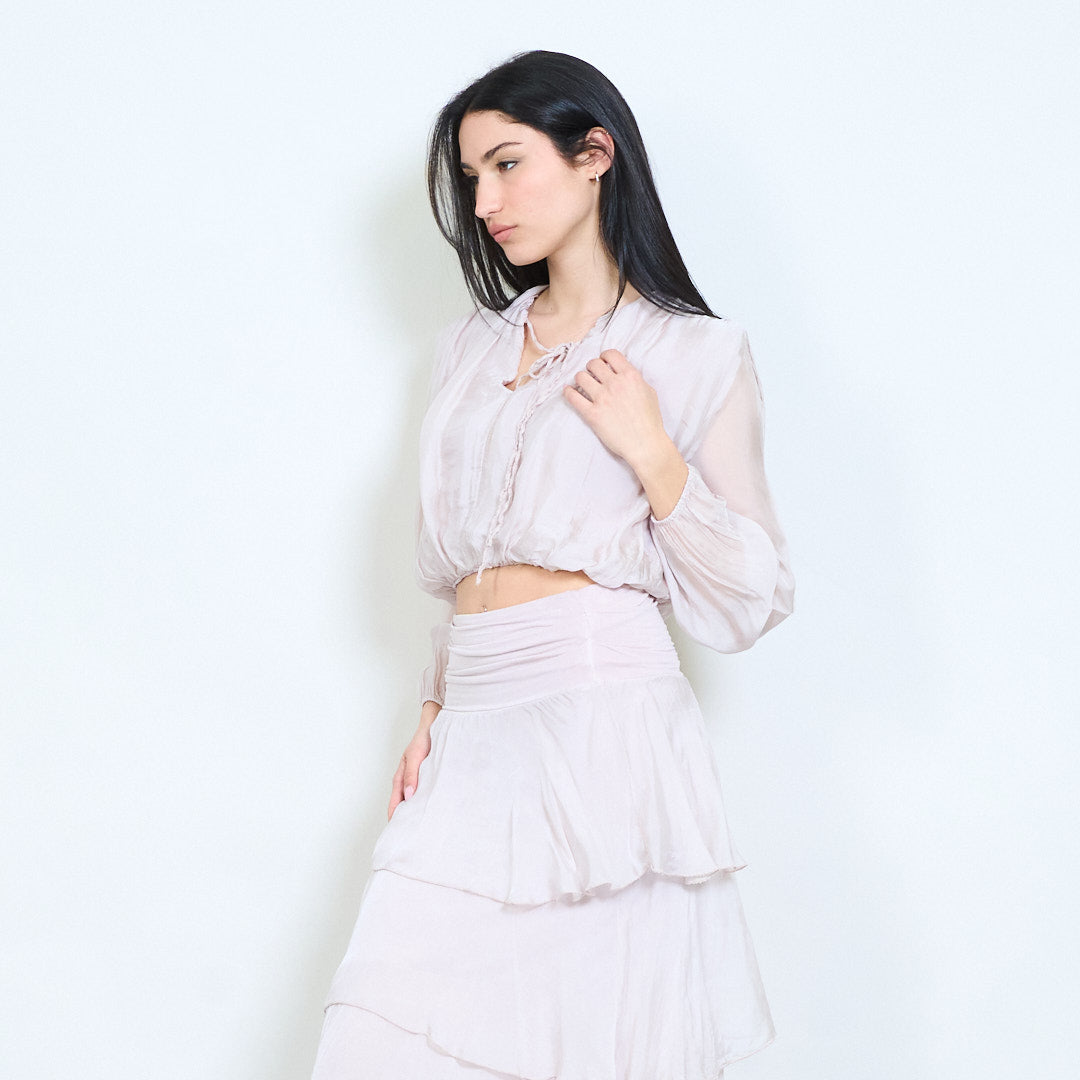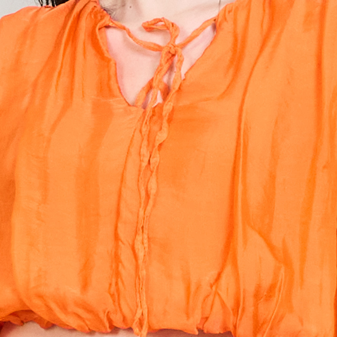Boho geraffte, langärmlige, kurz geschnittene Bluse mit Bindeband vorne im Großhandel