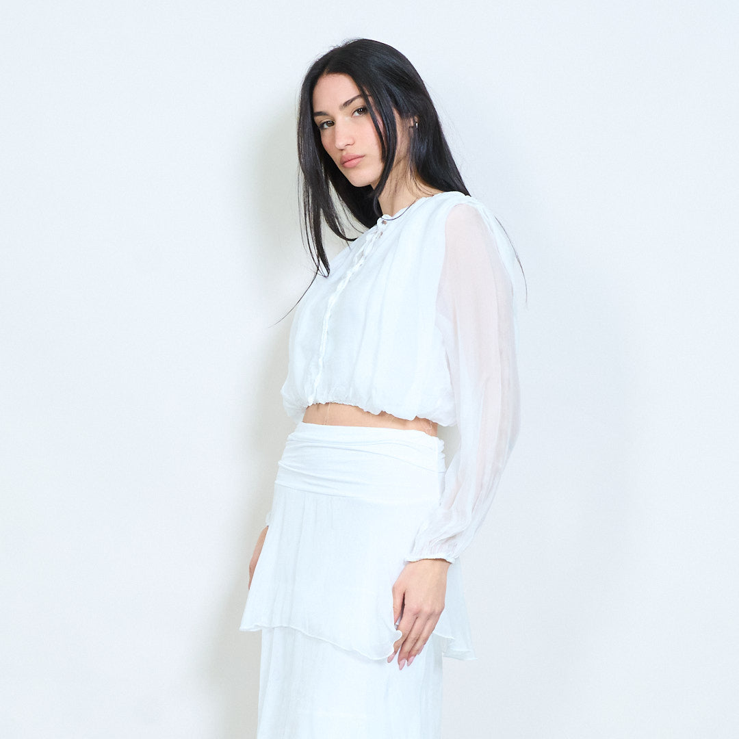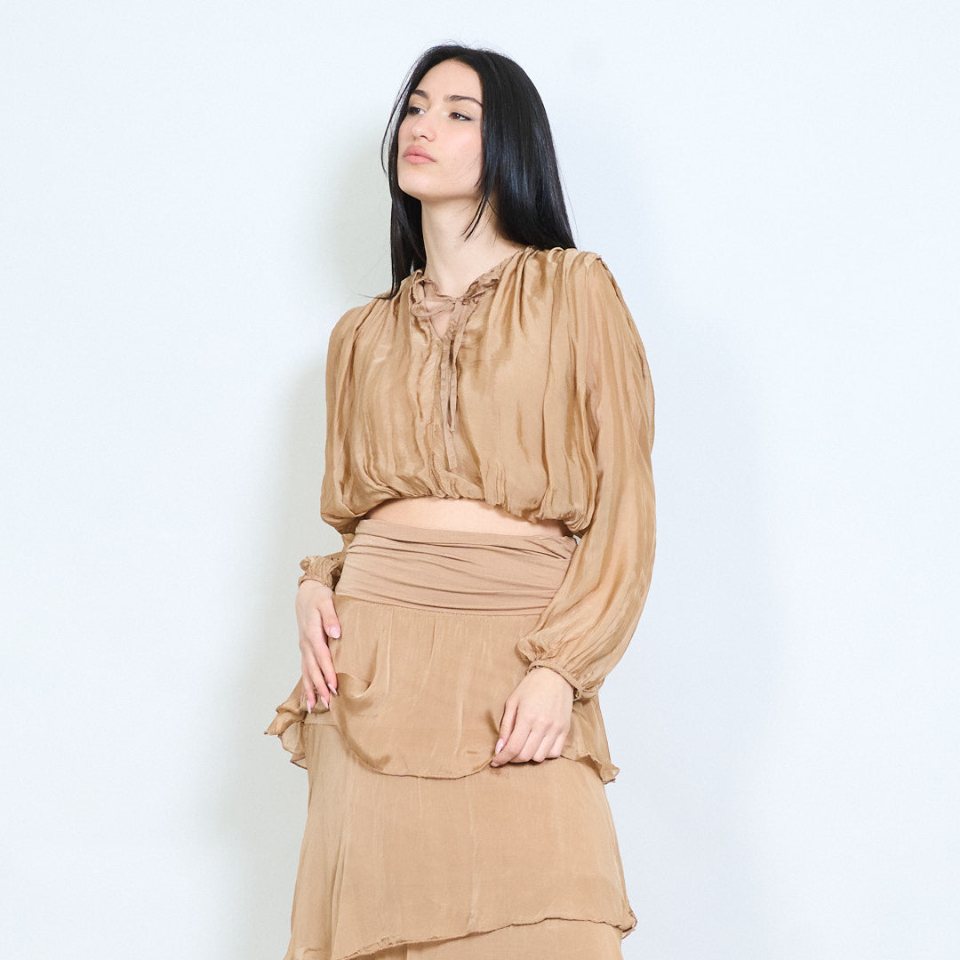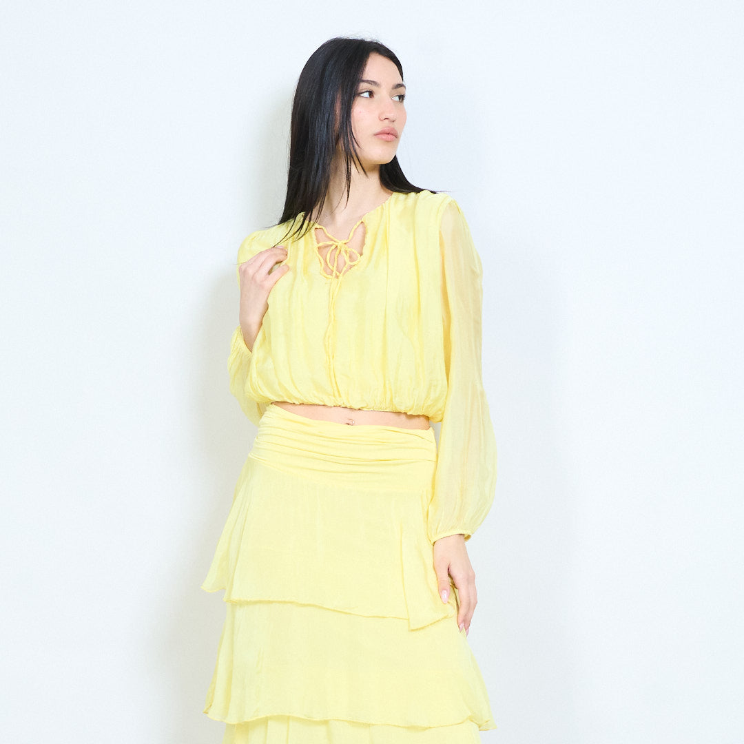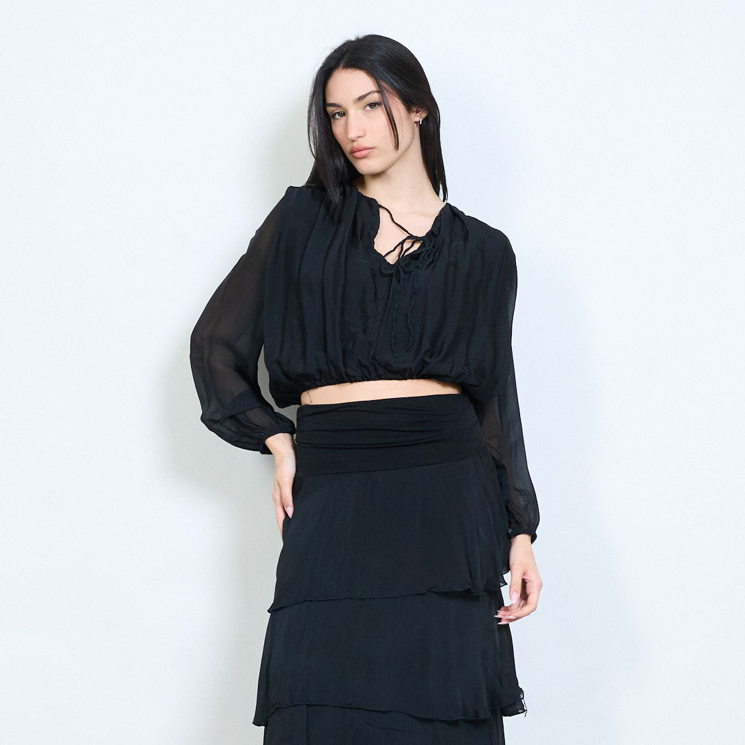 Boho geraffte, langärmlige, kurz geschnittene Bluse mit Bindeband vorne im Großhandel