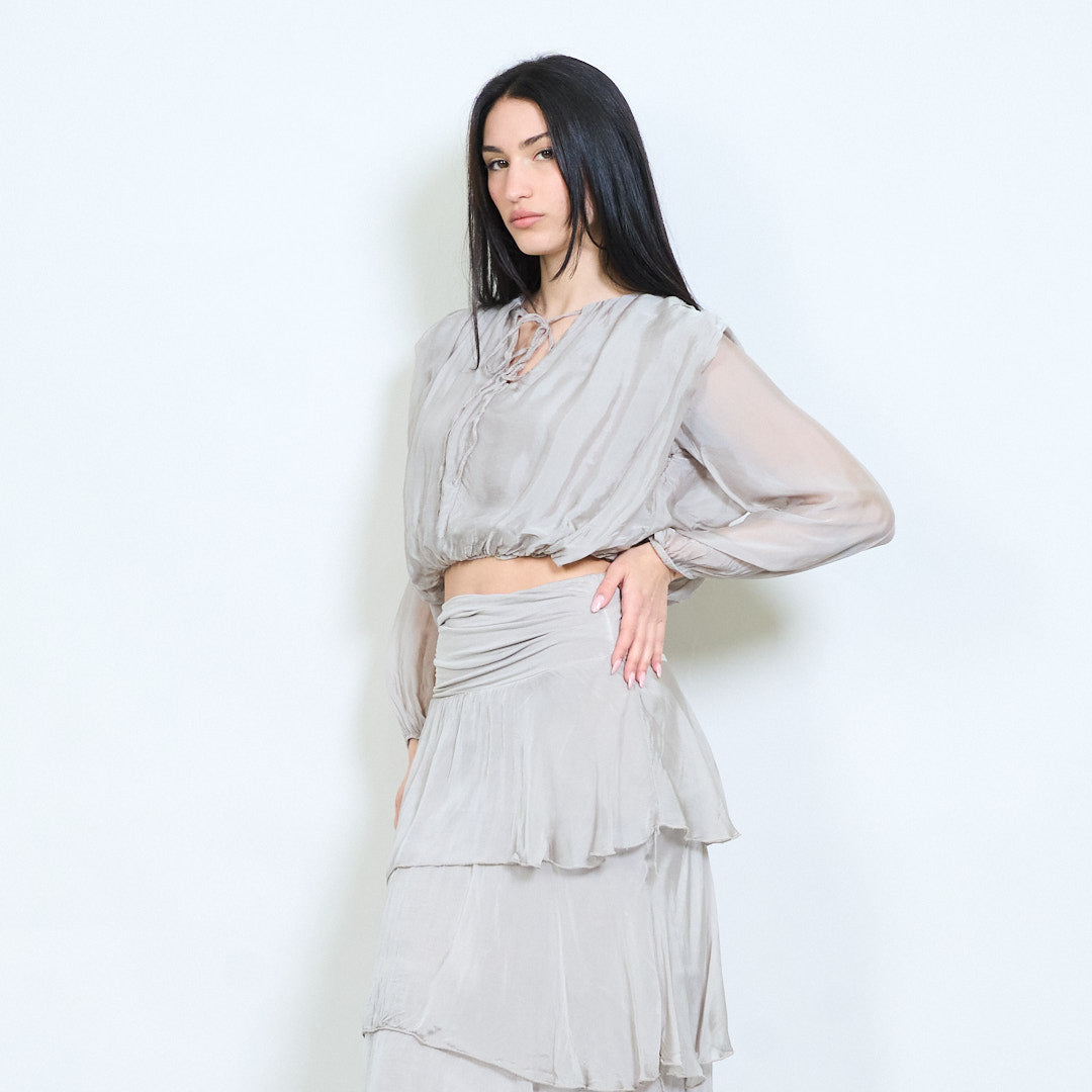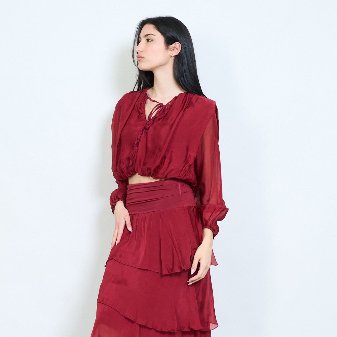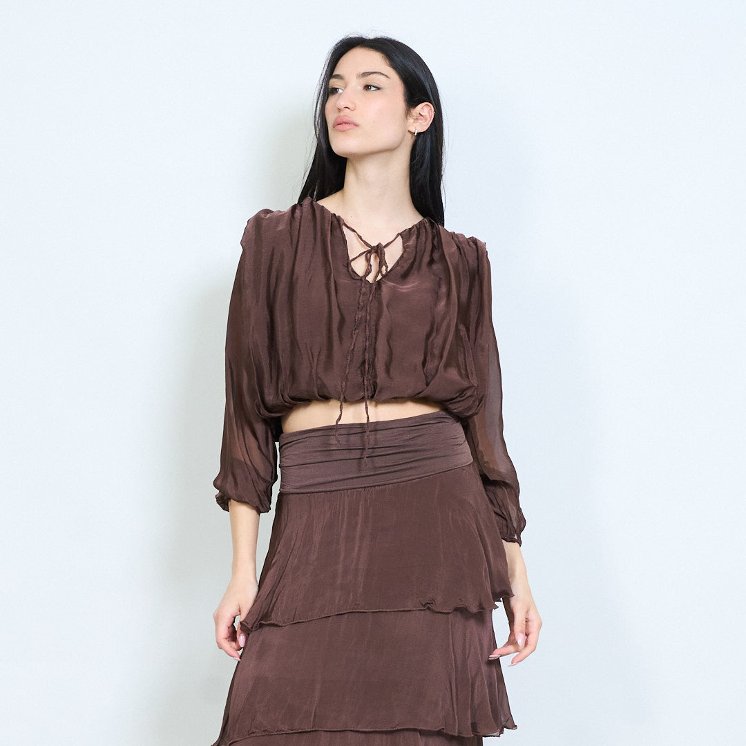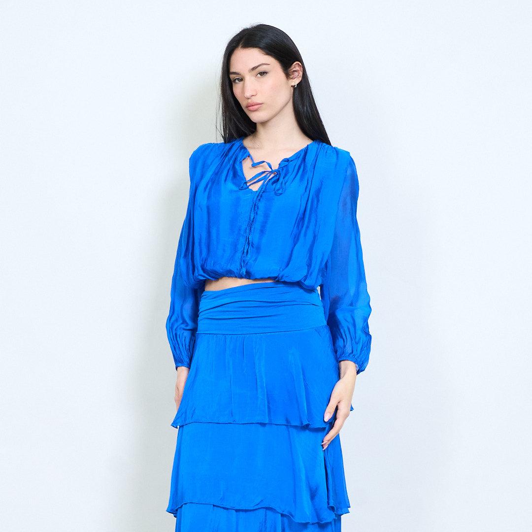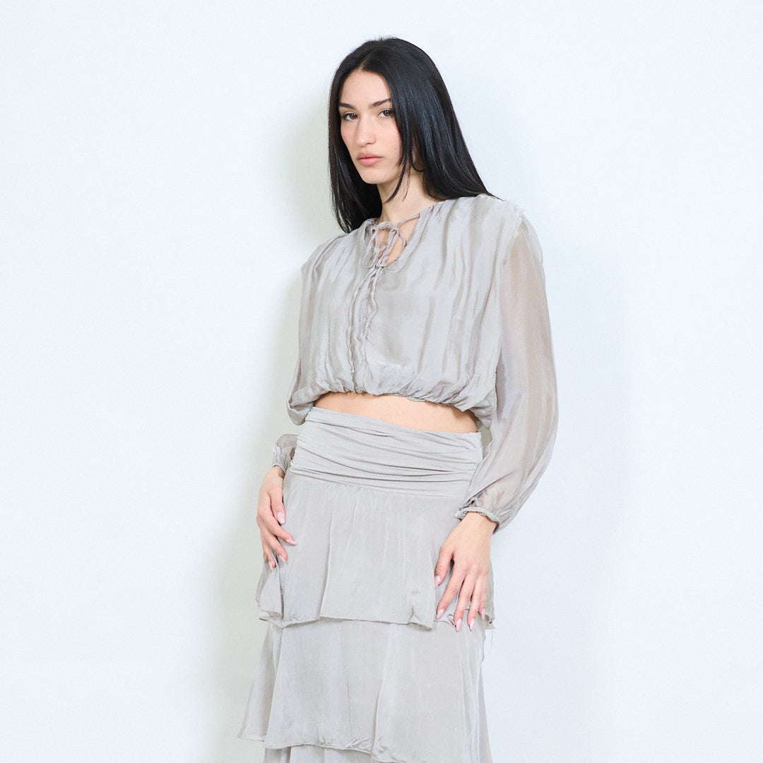 Boho geraffte, langärmlige, kurz geschnittene Bluse mit Bindeband vorne im Großhandel