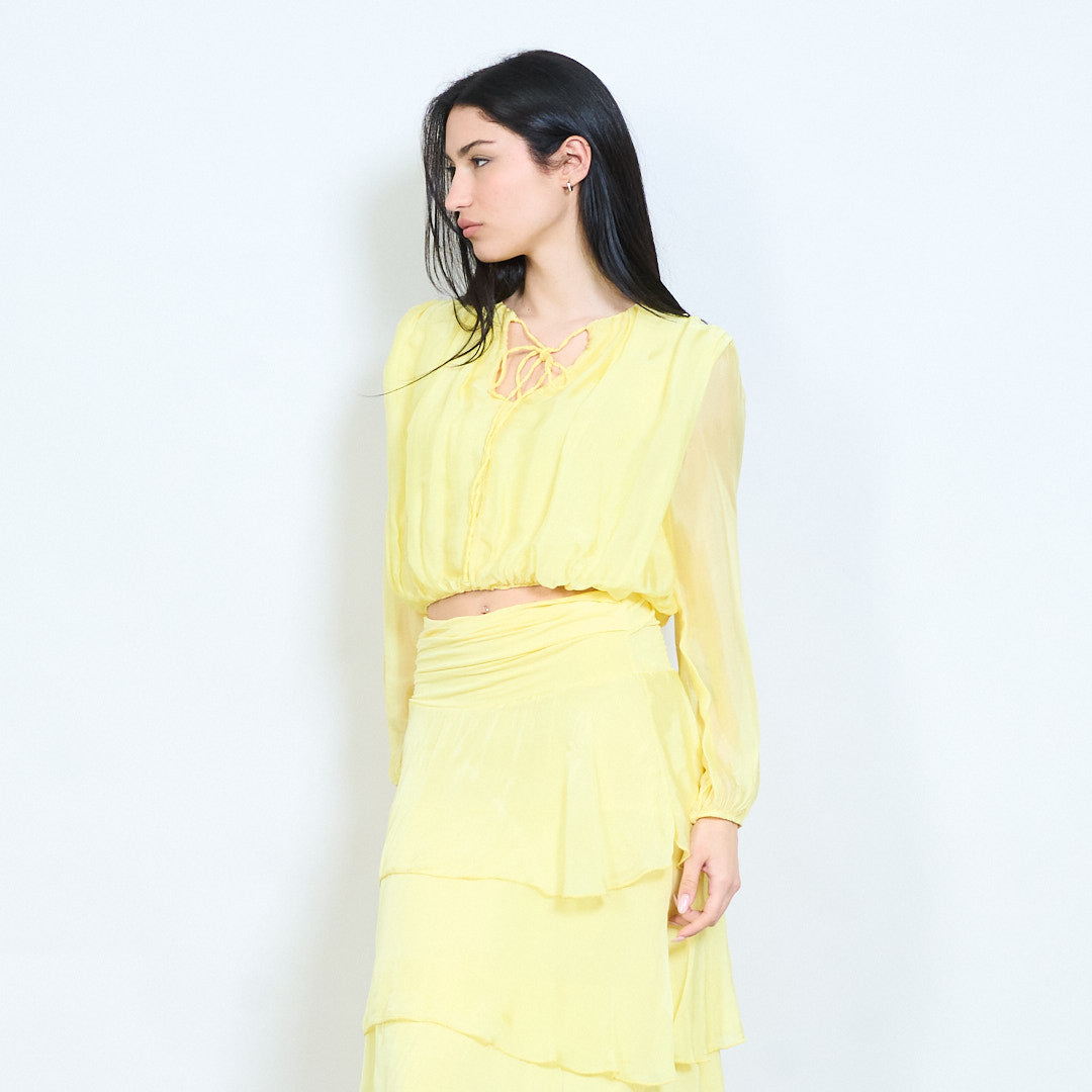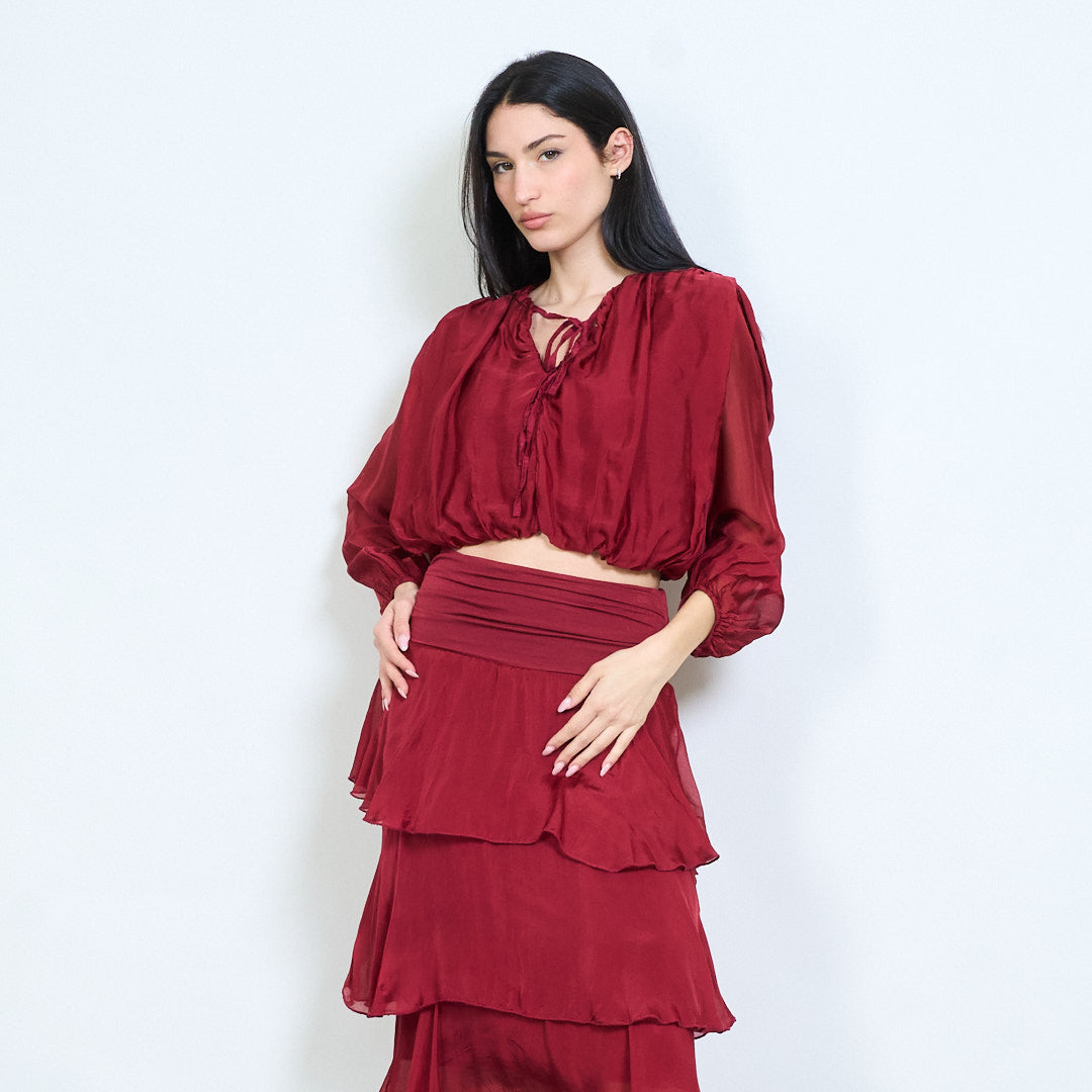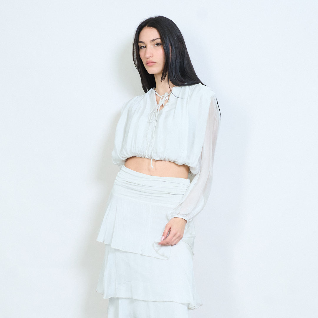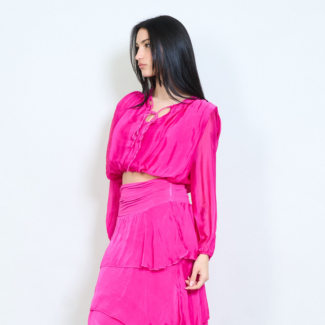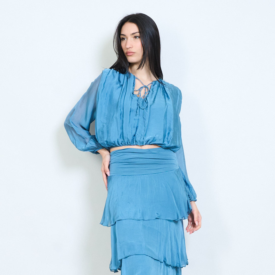 Boho geraffte, langärmlige, kurz geschnittene Bluse mit Bindeband vorne im Großhandel