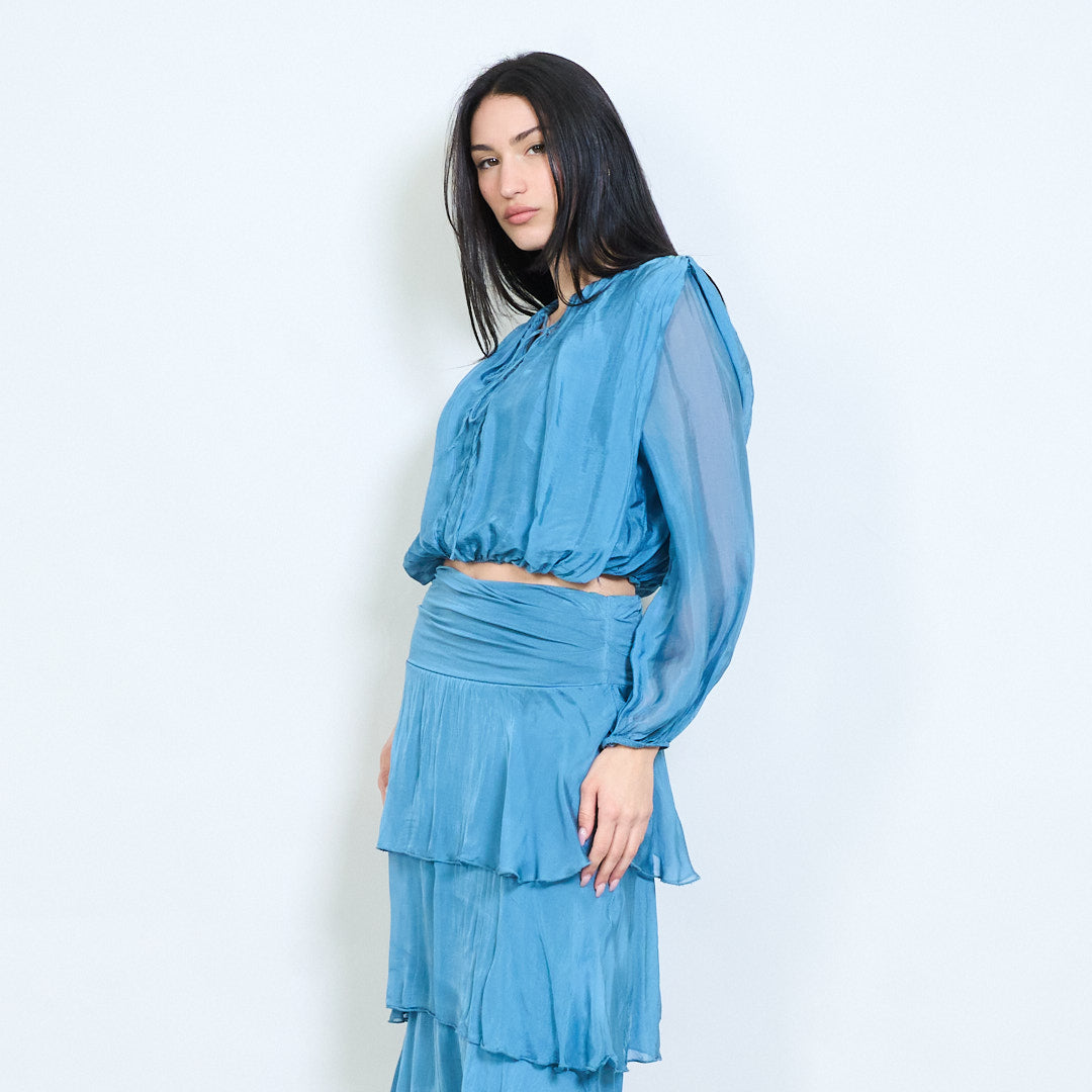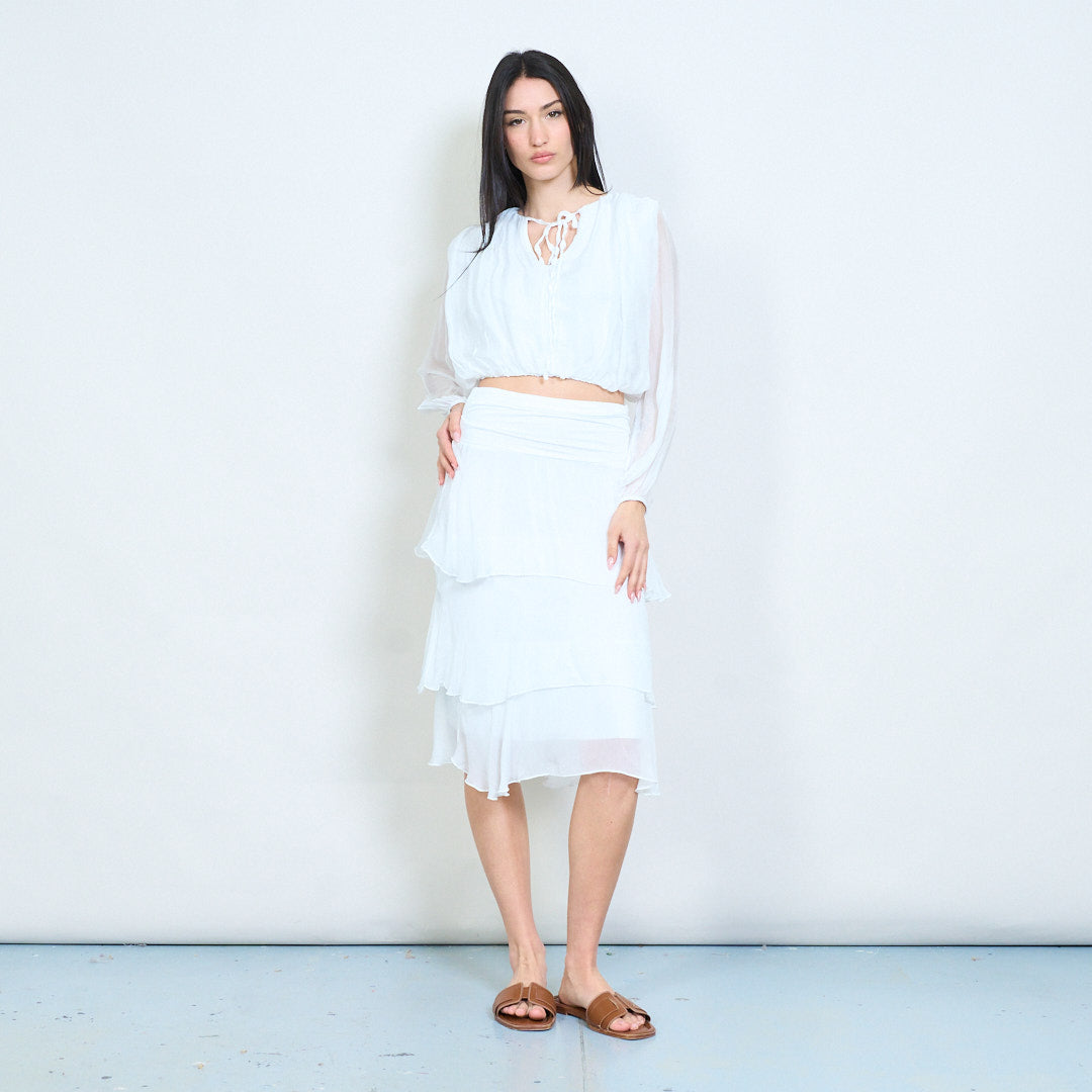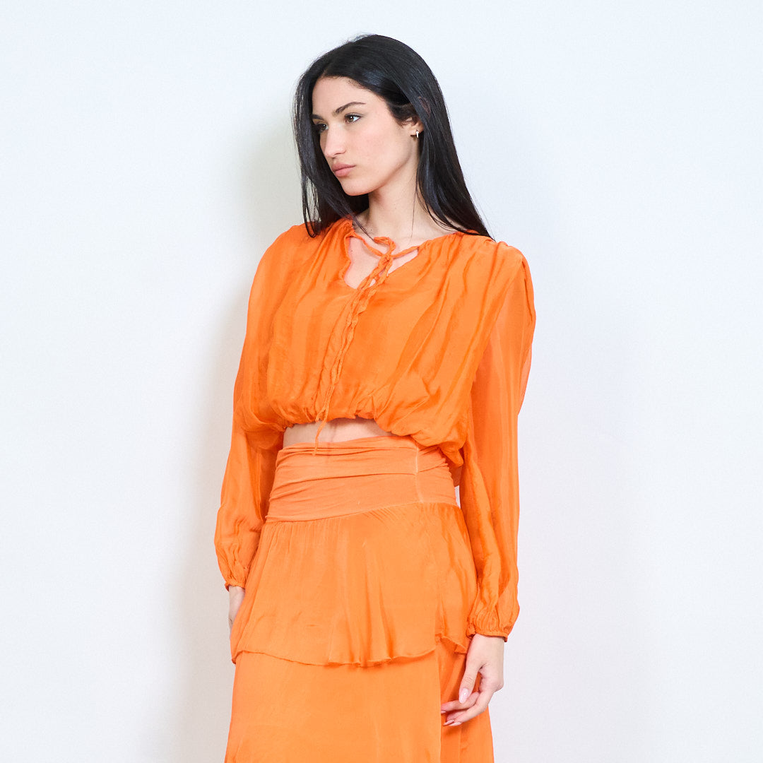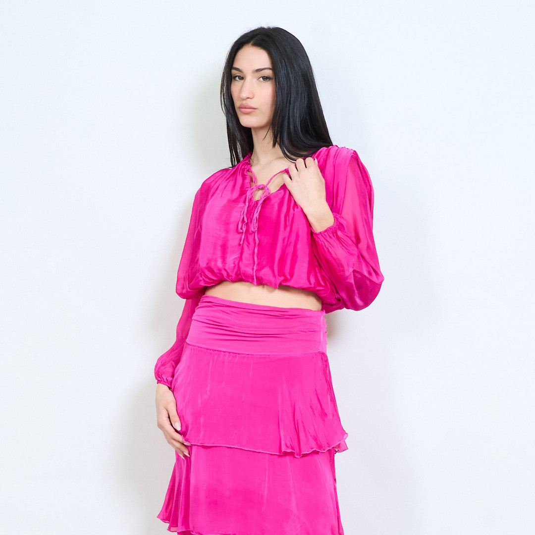 Boho geraffte, langärmlige, kurz geschnittene Bluse mit Bindeband vorne im Großhandel