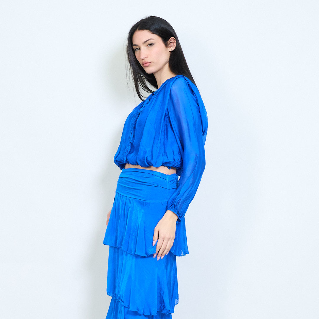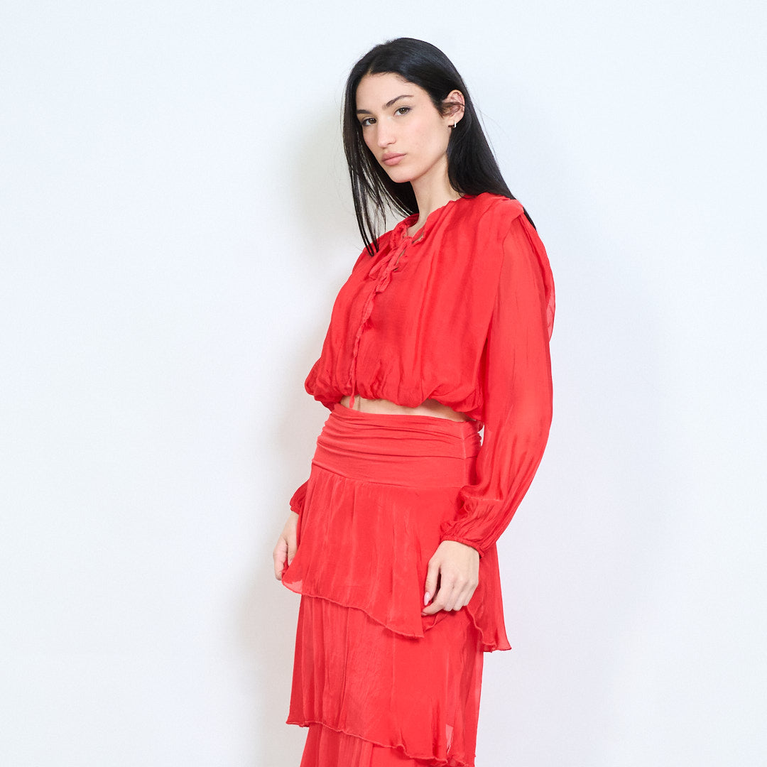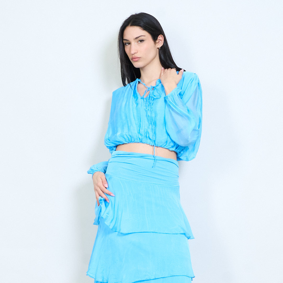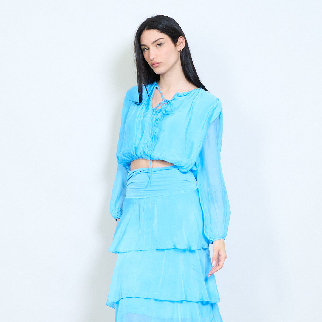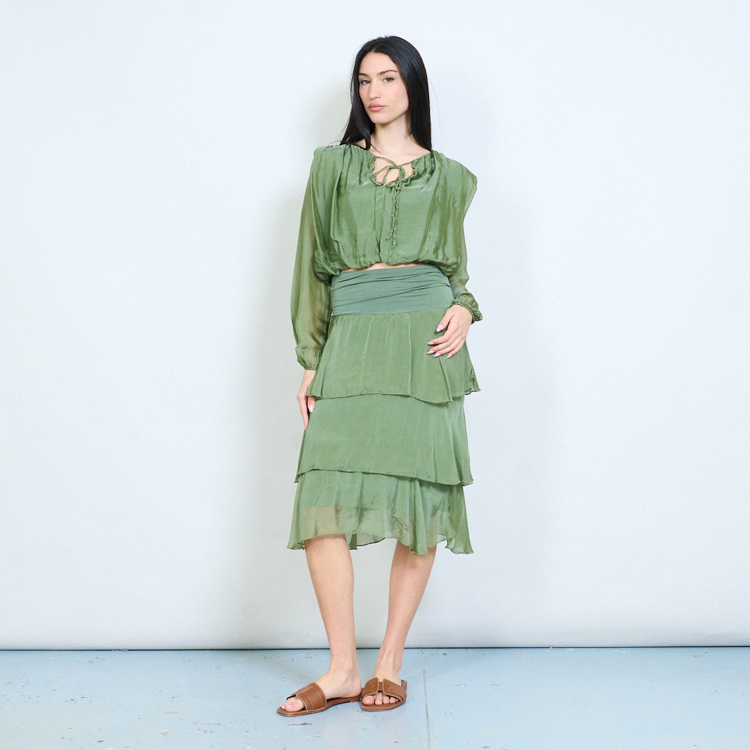 Boho geraffte, langärmlige, kurz geschnittene Bluse mit Bindeband vorne im Großhandel