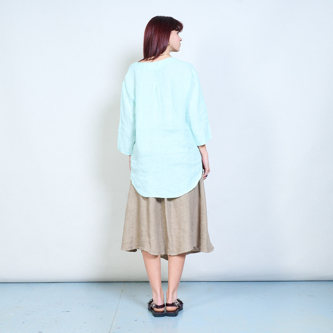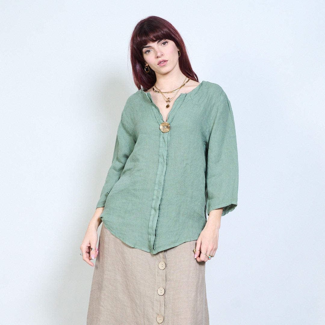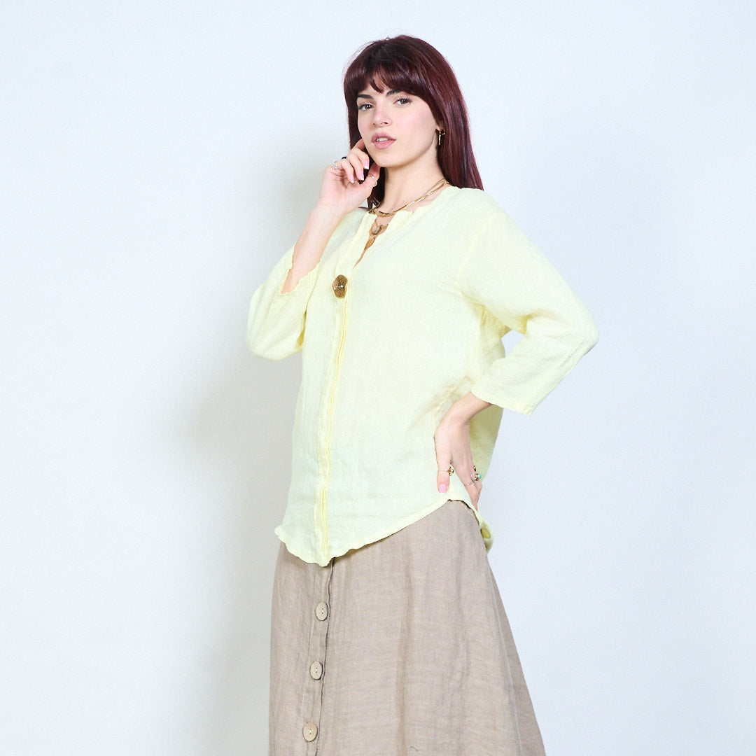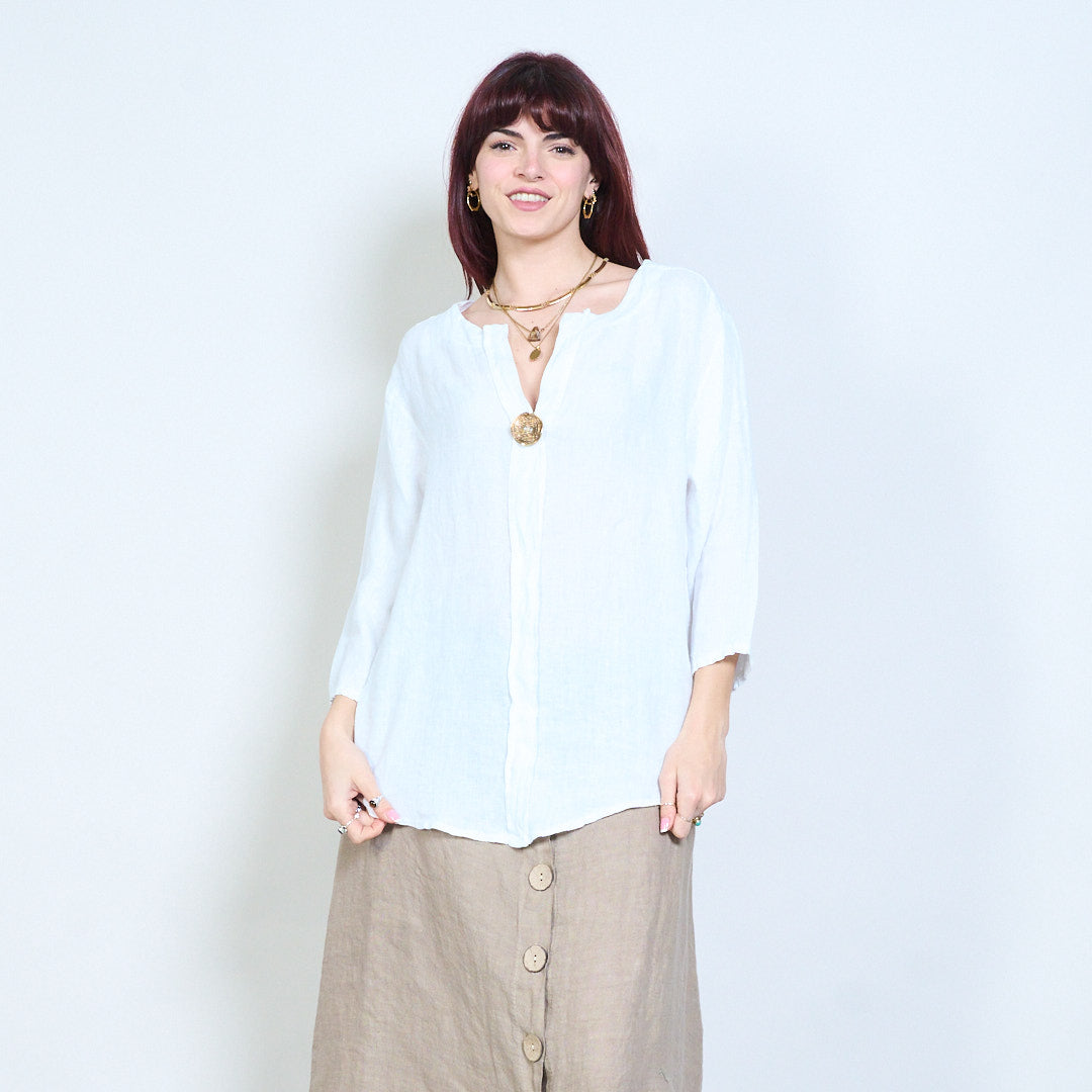 Lässige, langärmlige Leinenbluse mit V-Ausschnitt und einem Knopf im Großhandel