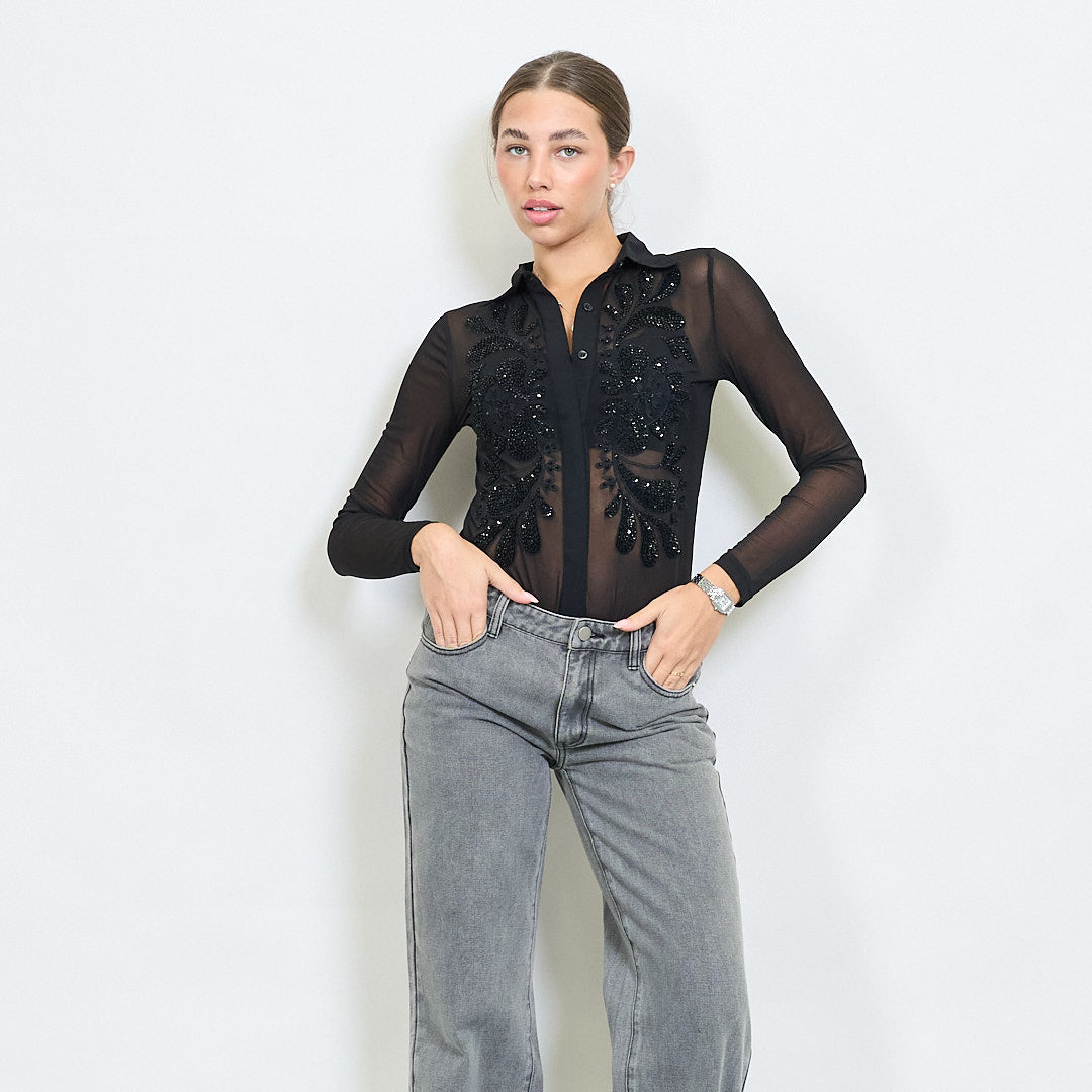 Bloße gestickte Netzbodysuitbluse mit Pailletten Barock Design Großhandel