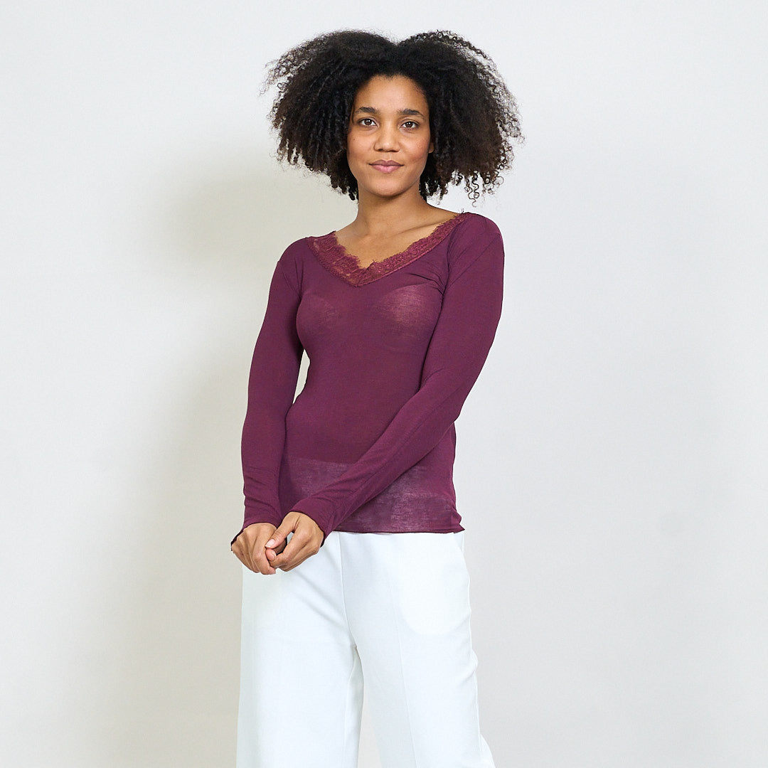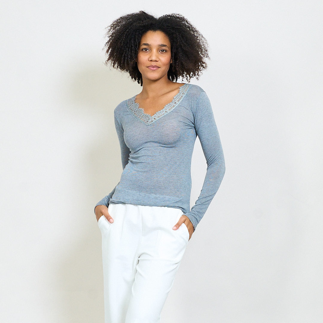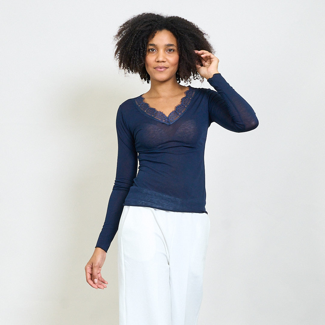 - Deep V-Ausschnitt mit floralen Spitzenverkleidung akzentuiert