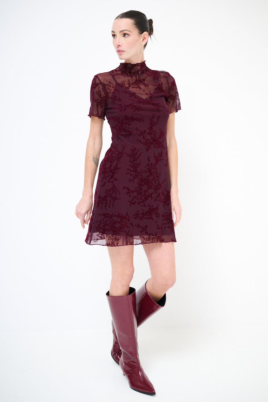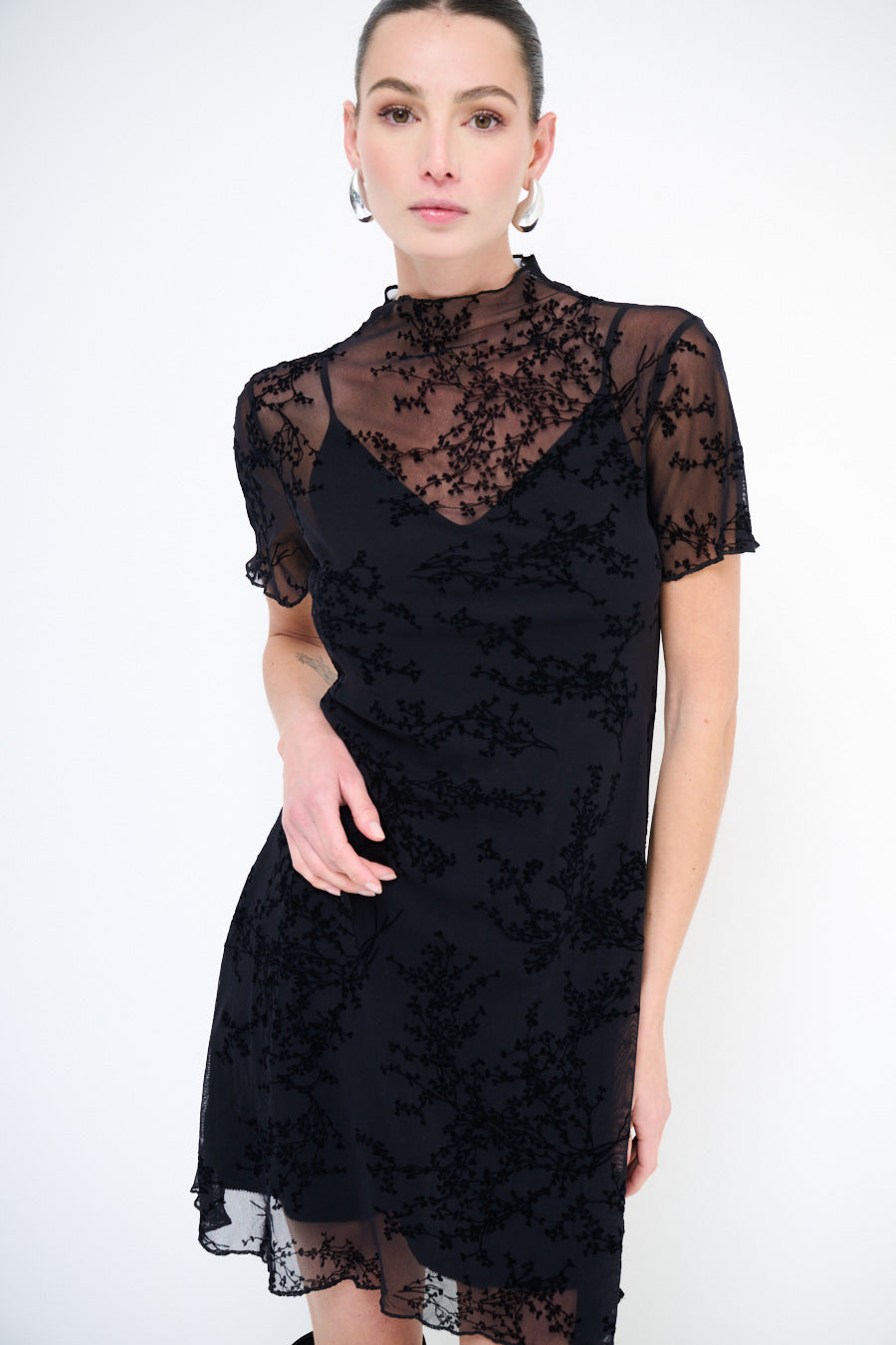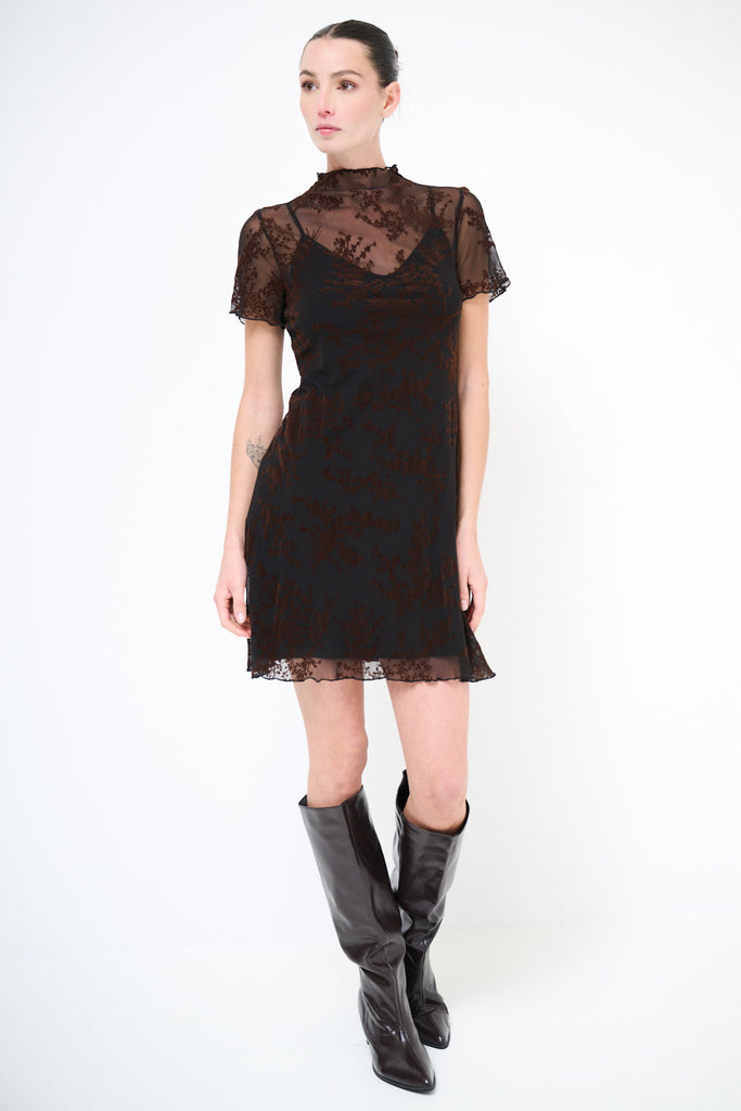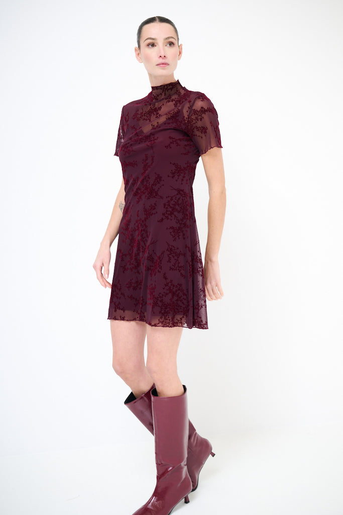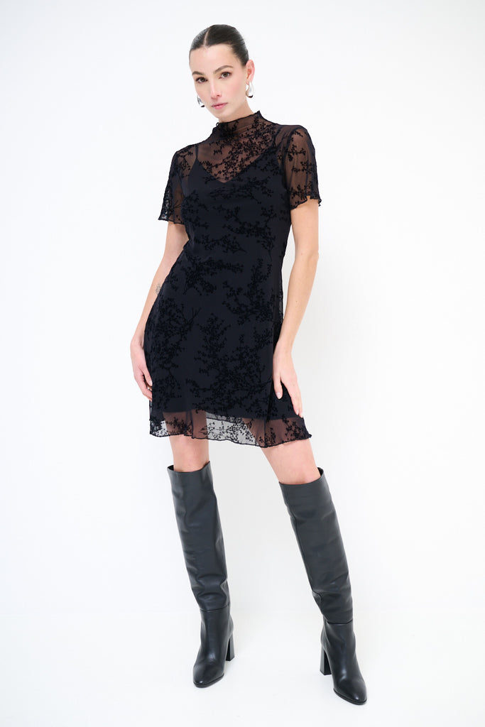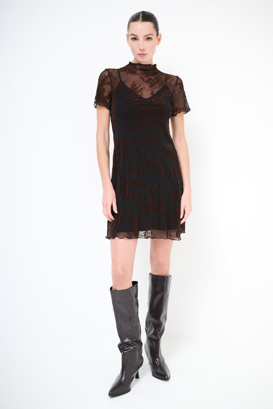 Μίνι φόρεμα με φλοράλ πλέγμα με ψηλό λαιμό, κοντομάνικο, χονδρική