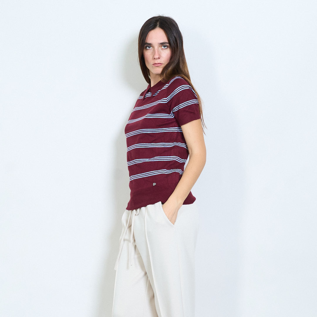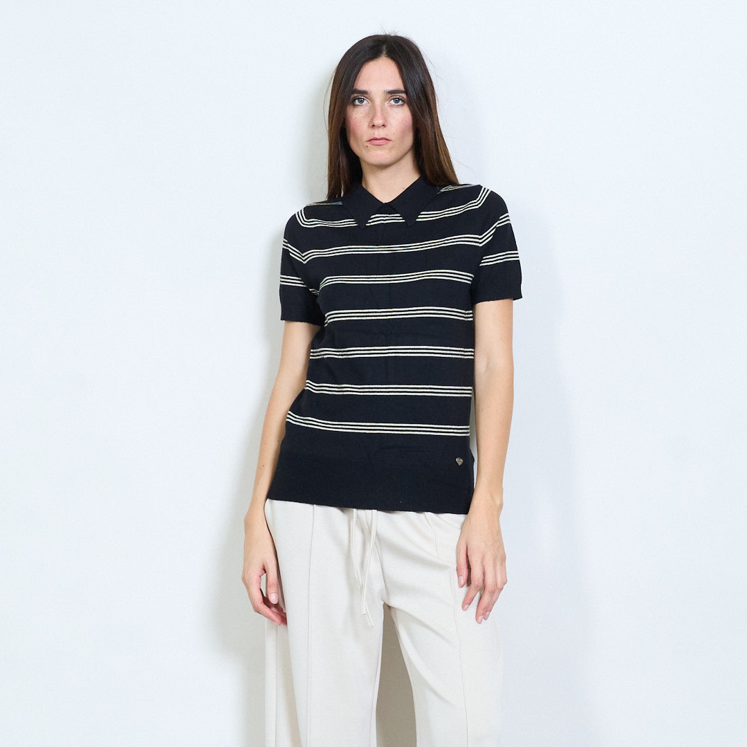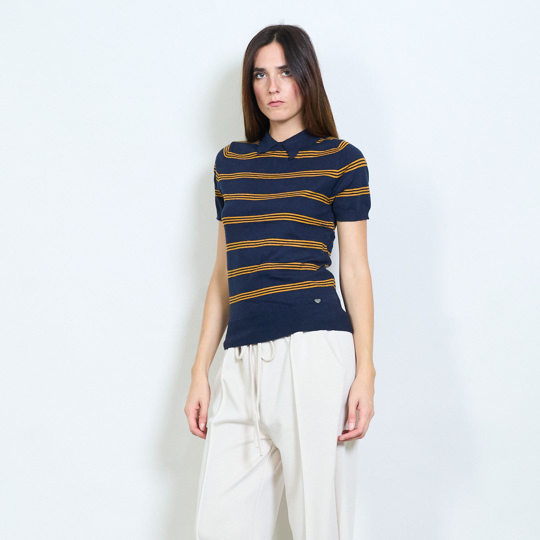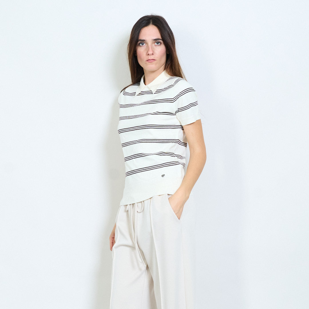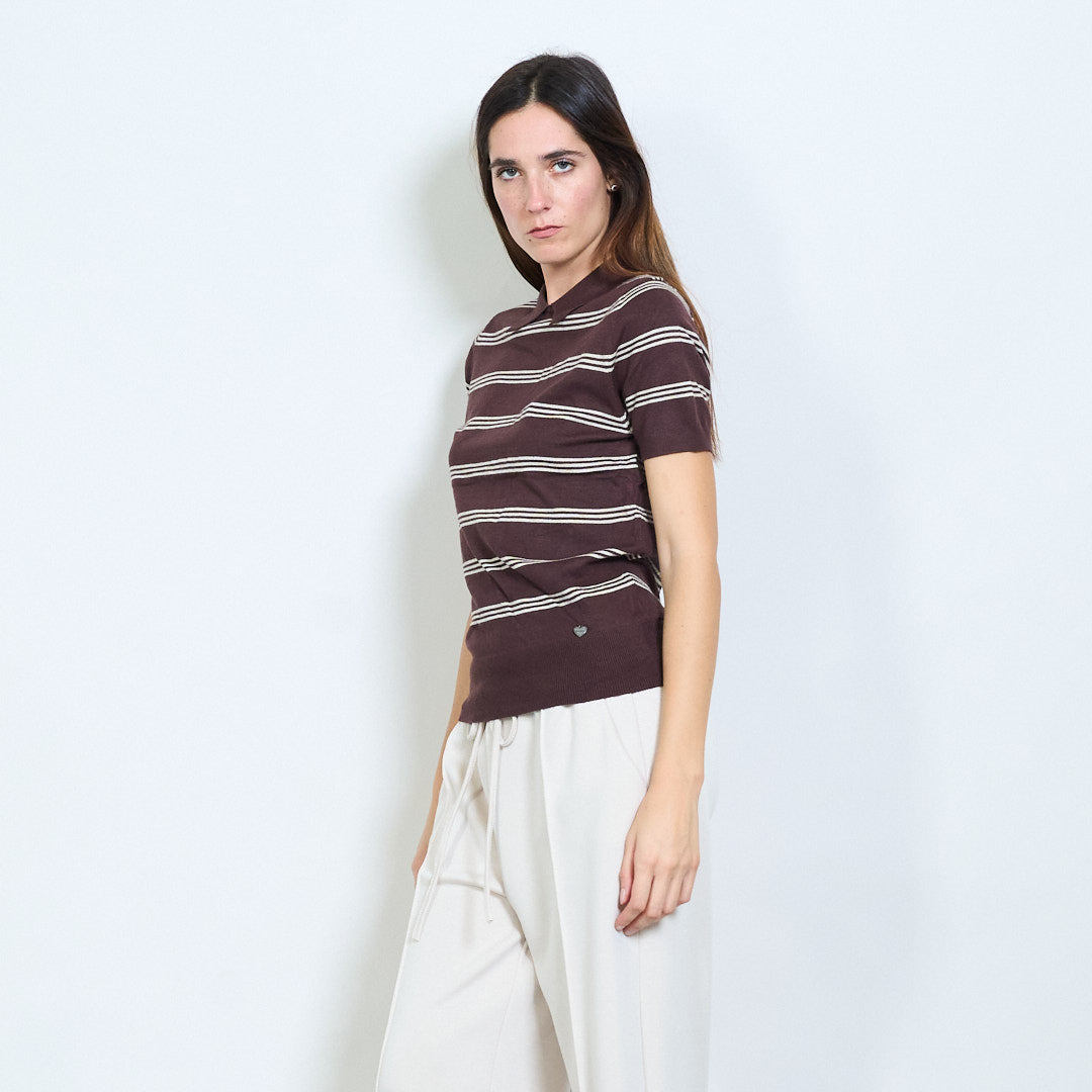 Ριγέ με κοντό μανίκι πλεκτό πόλο κορυφή με καρδιακό έμβλημα λεπτομέρεια χονδρική