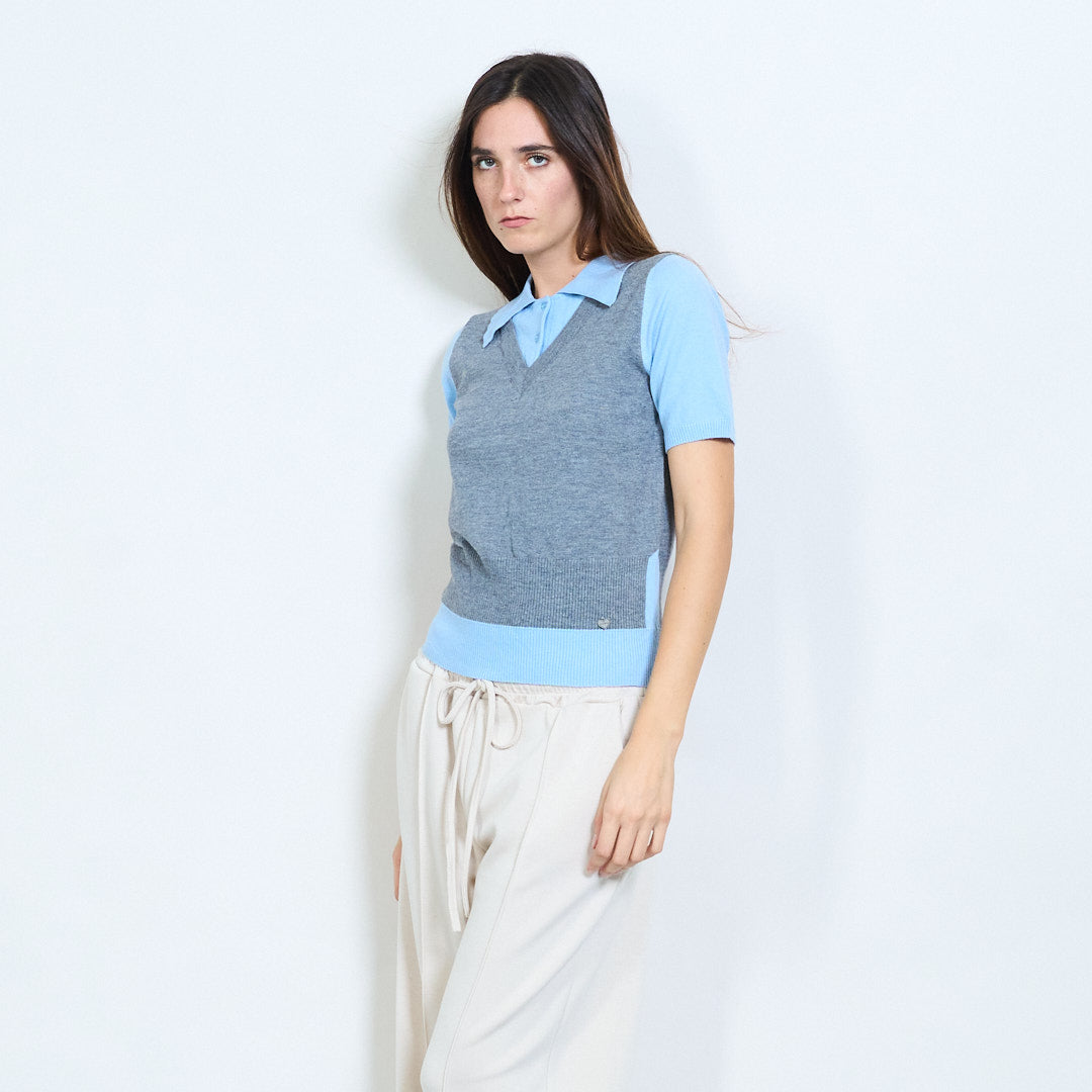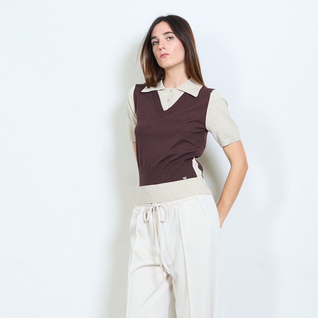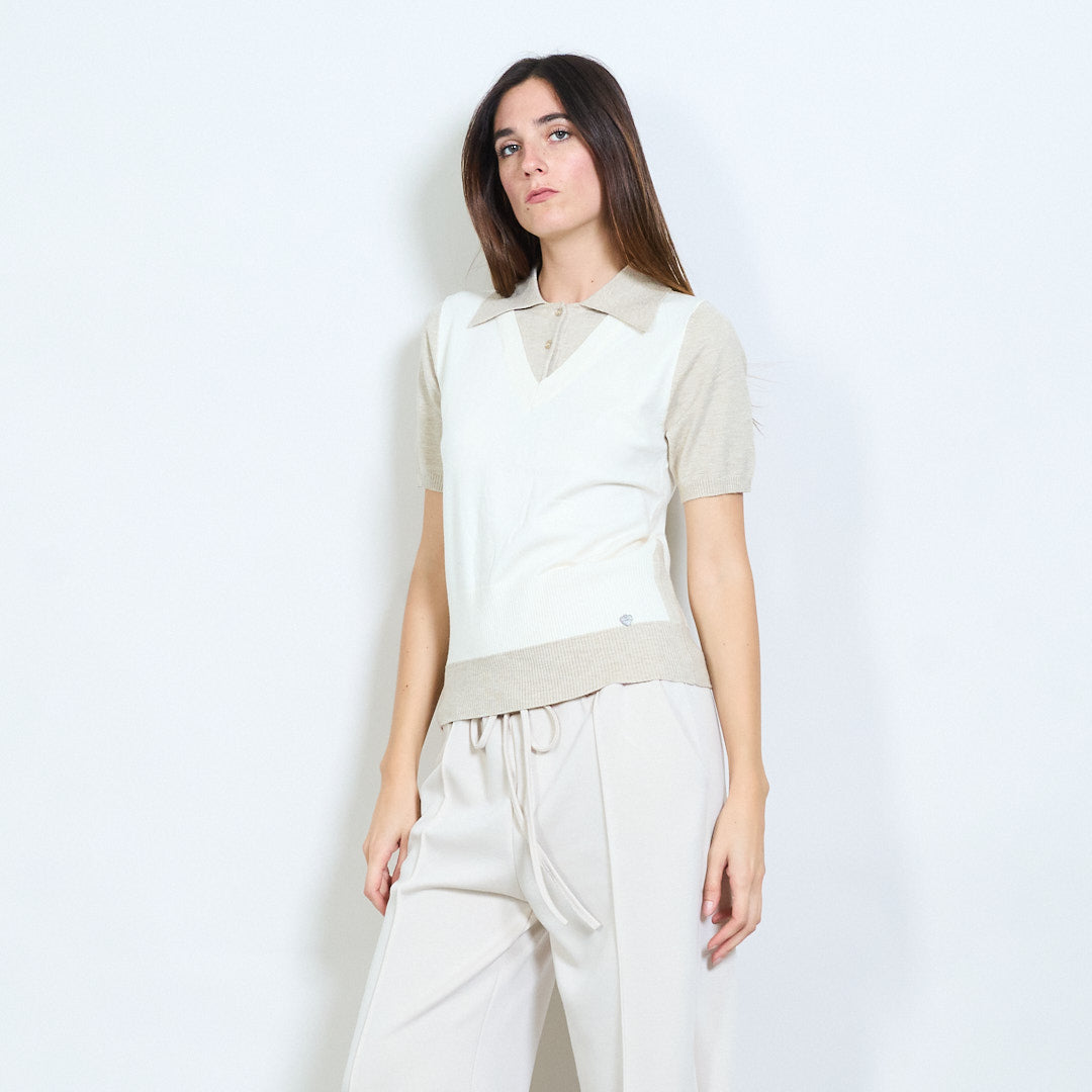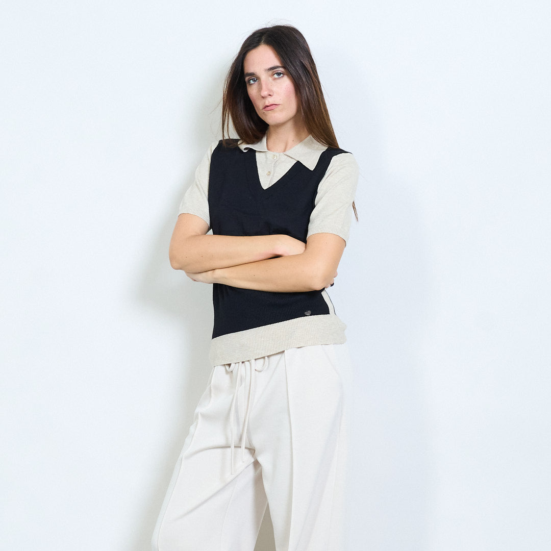 - Μοναδική στρώση με στρώση με κολάρο πόλο και σχεδιασμό V γιλέκο V-neck