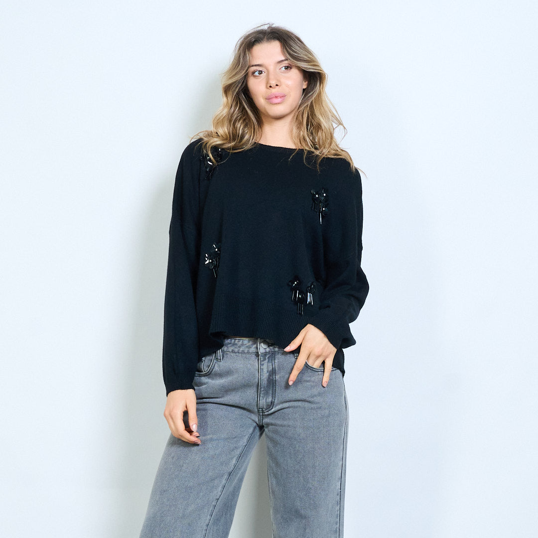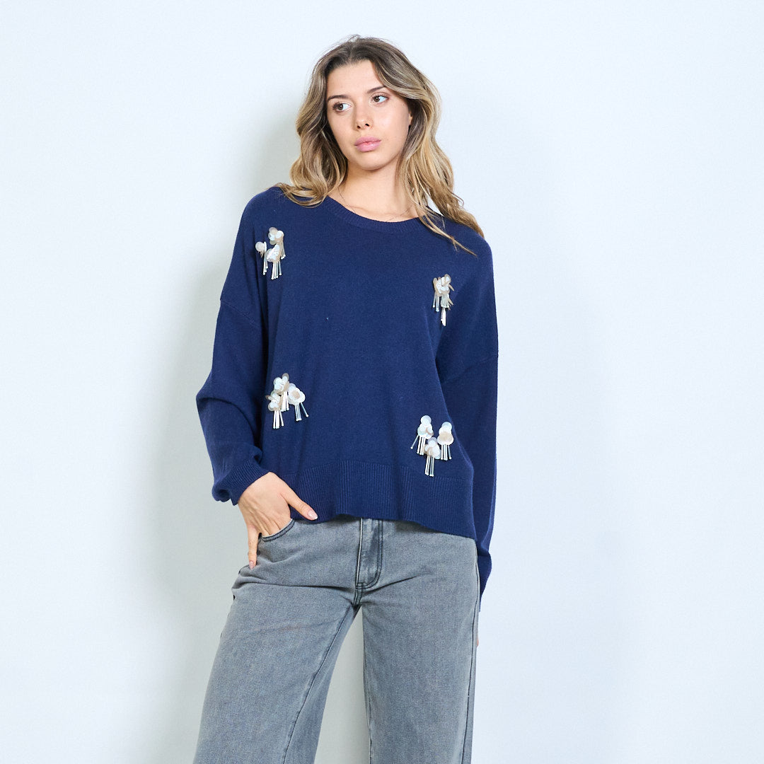 - Το πουλόβερ του λαιμού πληρώματος λεπτομερώς με κομψές χάντρες λουλουδιές διακοσμήσεις