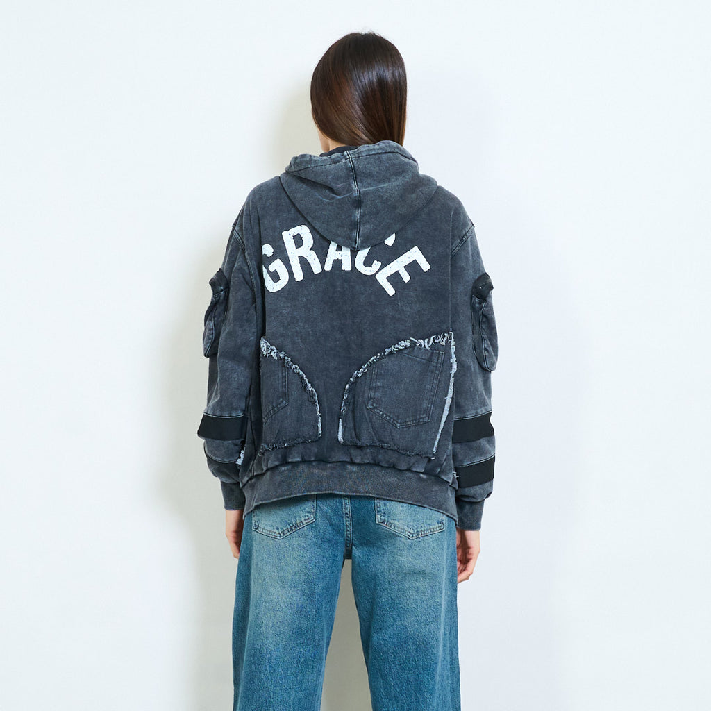 - Μοναδικό μπροστινό συνονθύλευμα με πίνακες denim με γραφικές εκτυπώσεις
