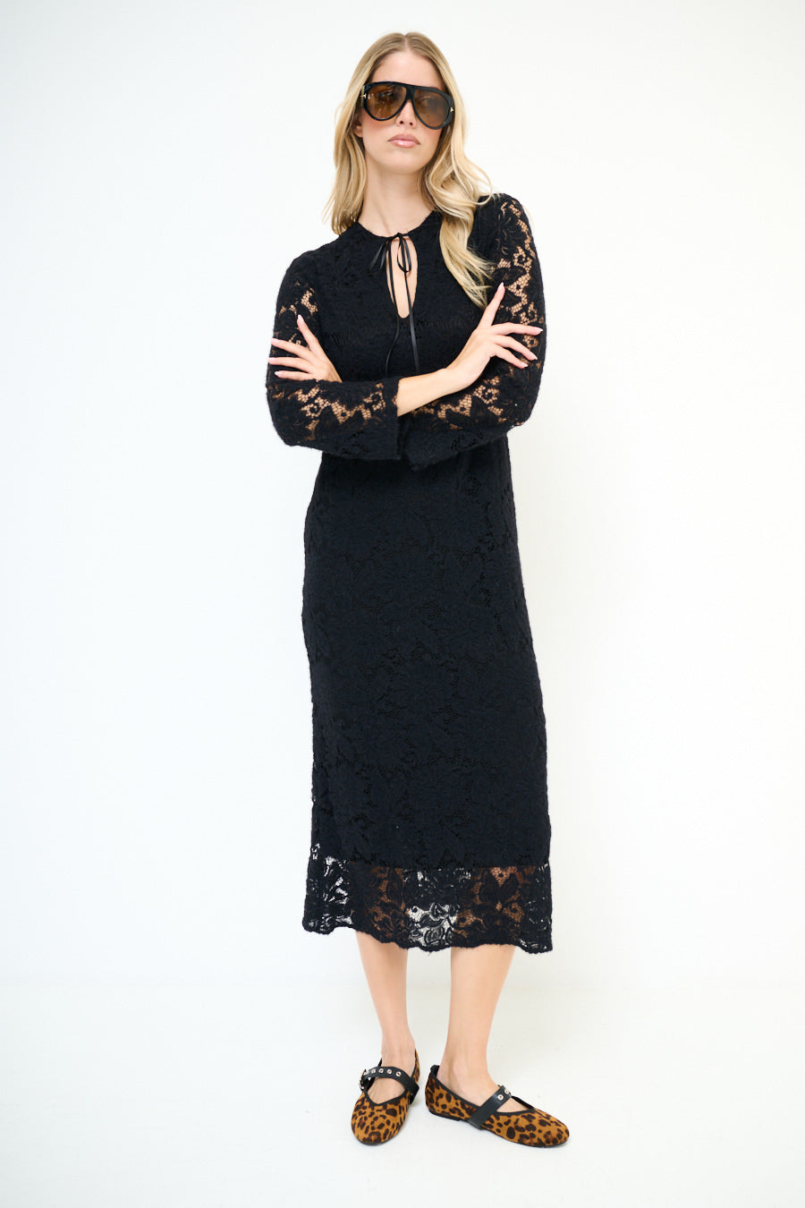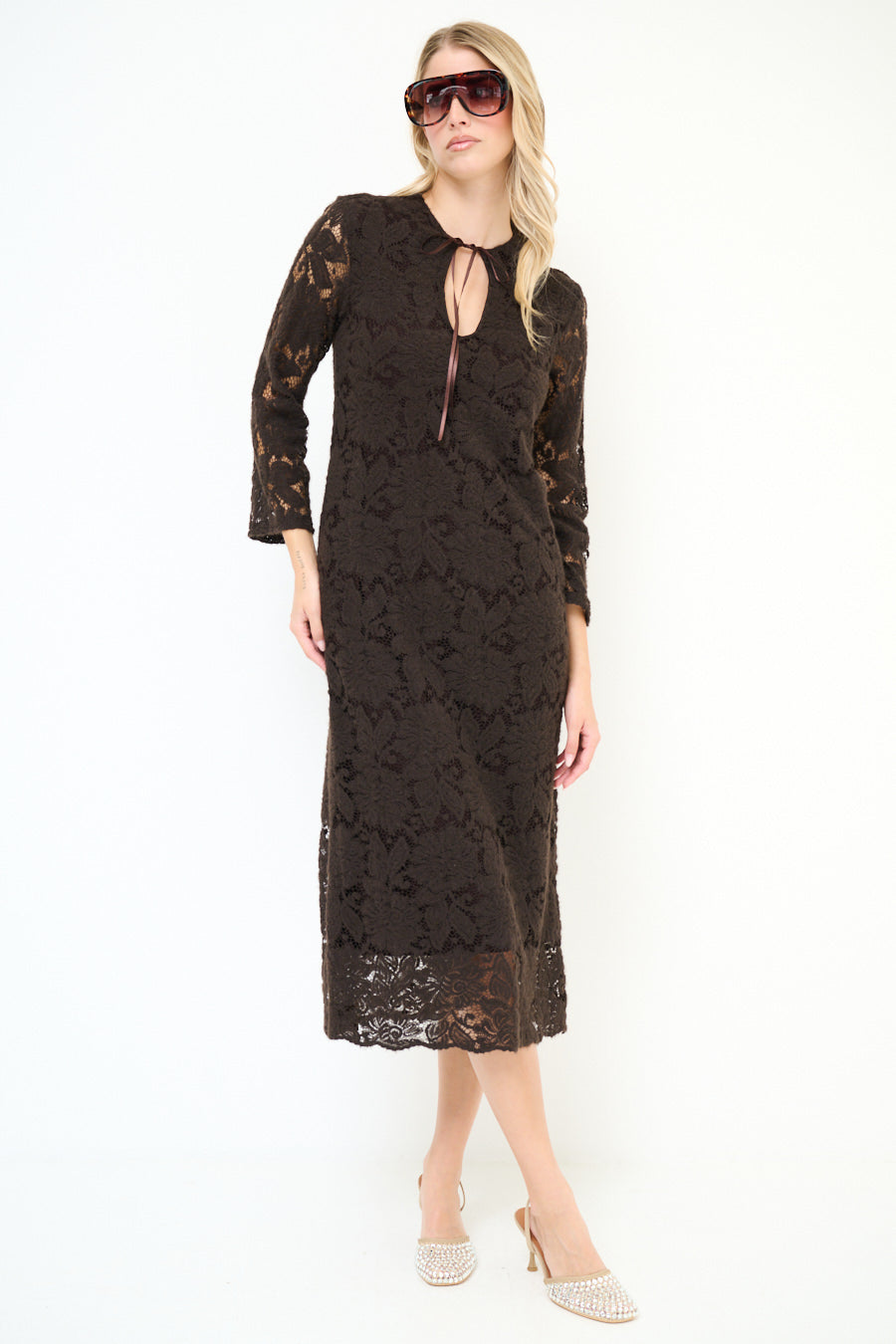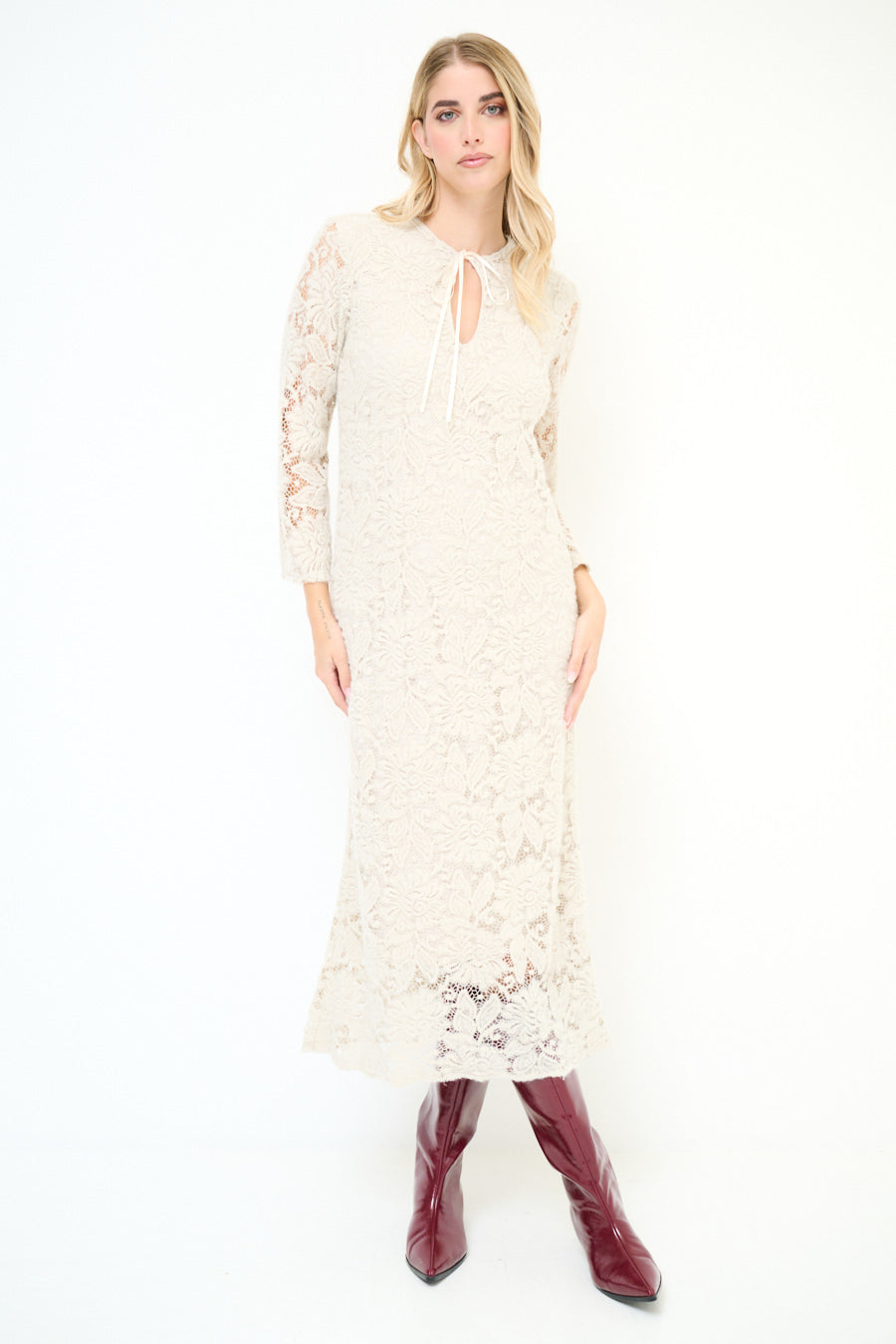 Floral Lace Long Sleeve Midi Φόρεμα με λεπτομέρεια κλειδιών
