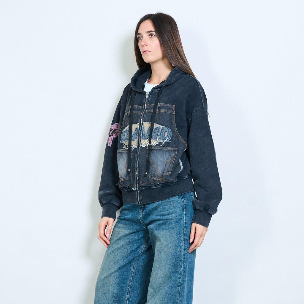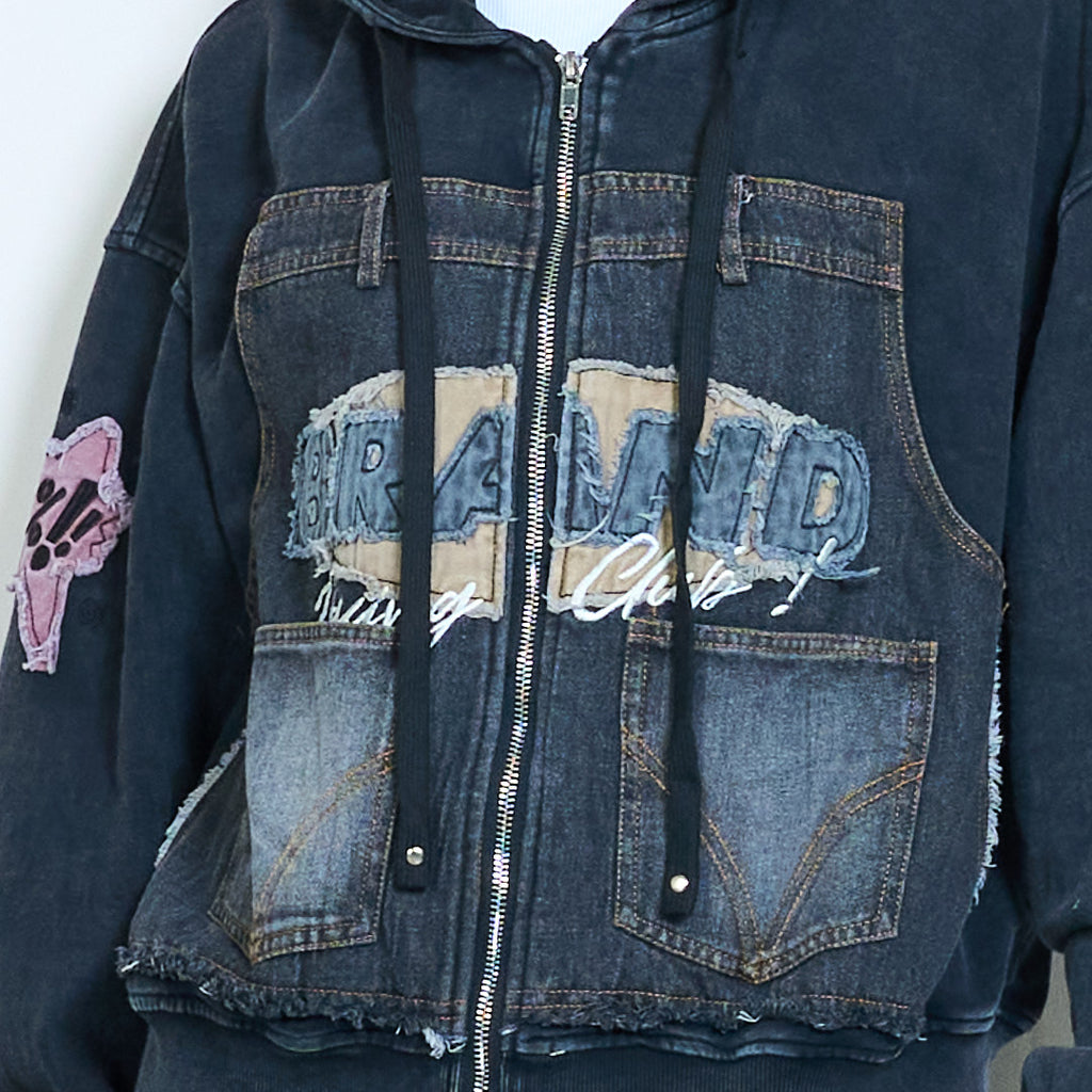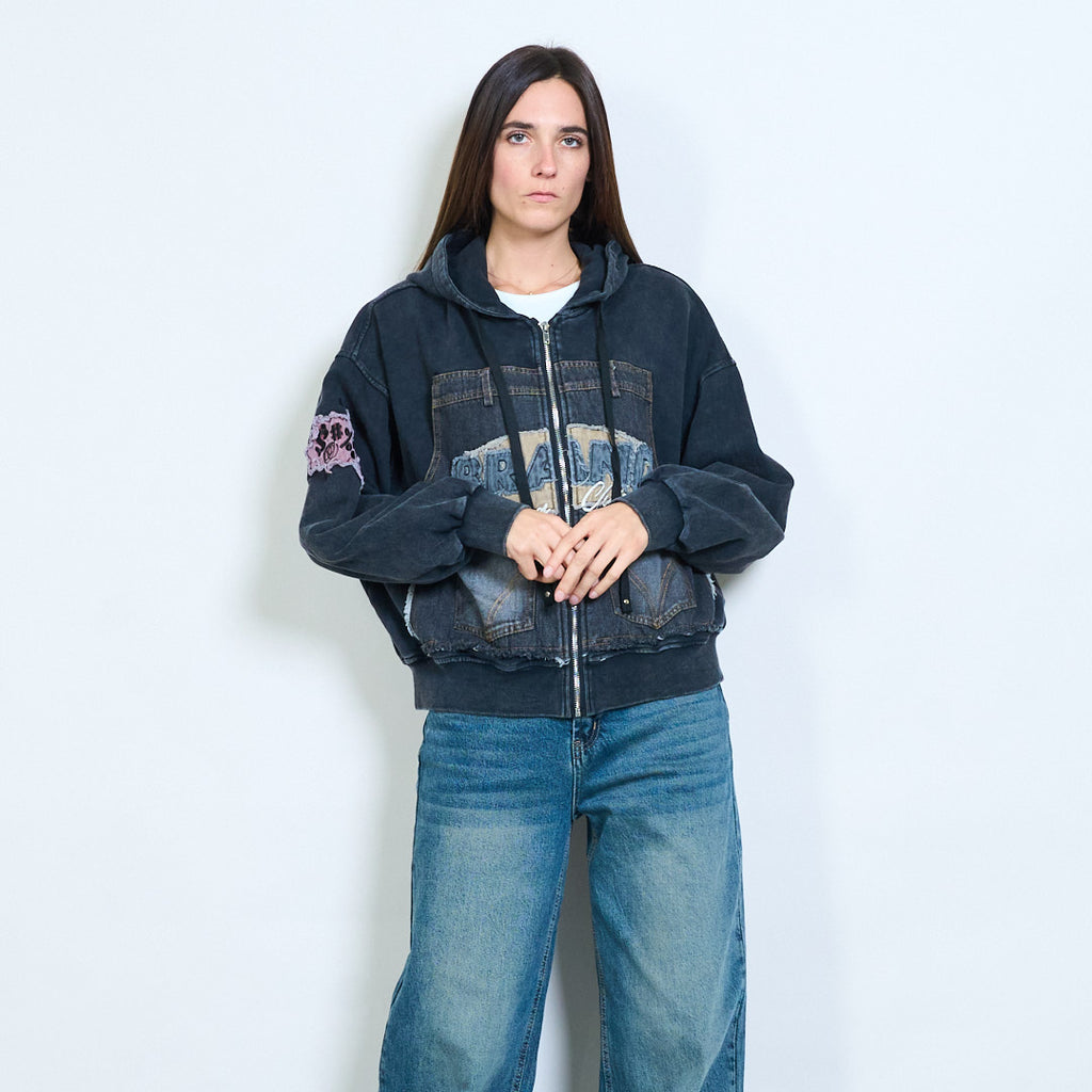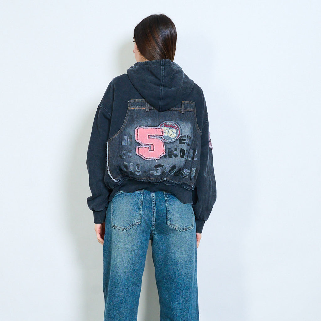 Patchwork denim πίνακα γραφικών hoodie σακάκι χονδρικής πώλησης