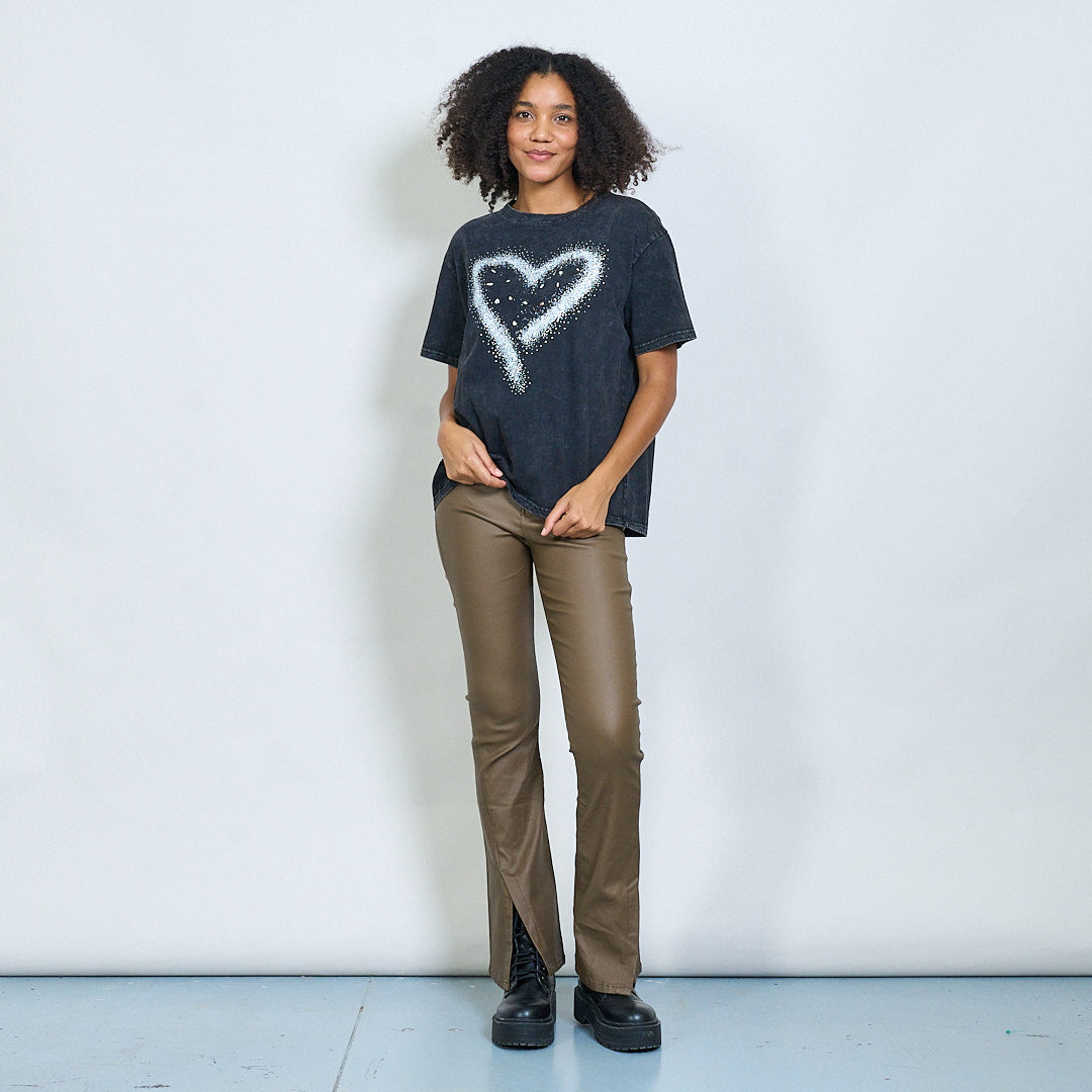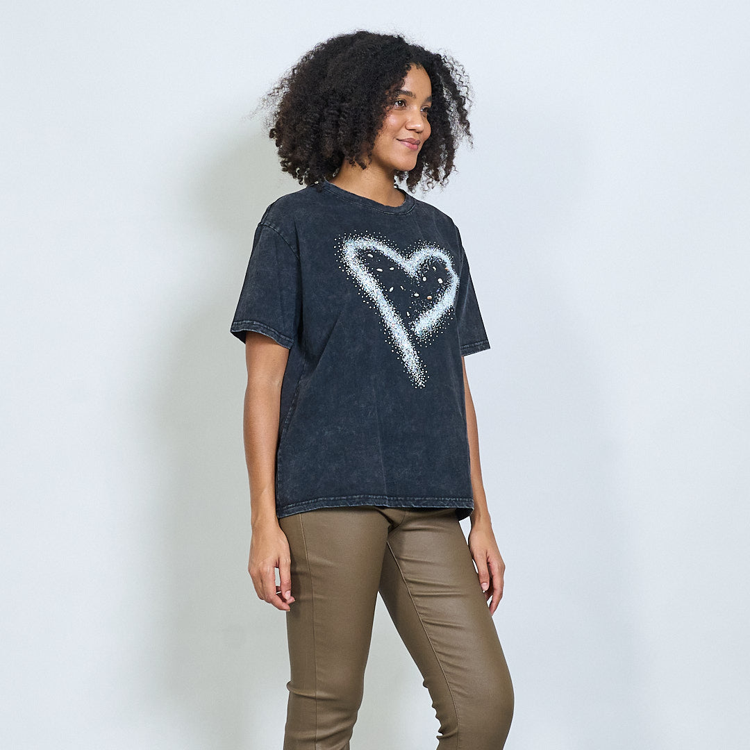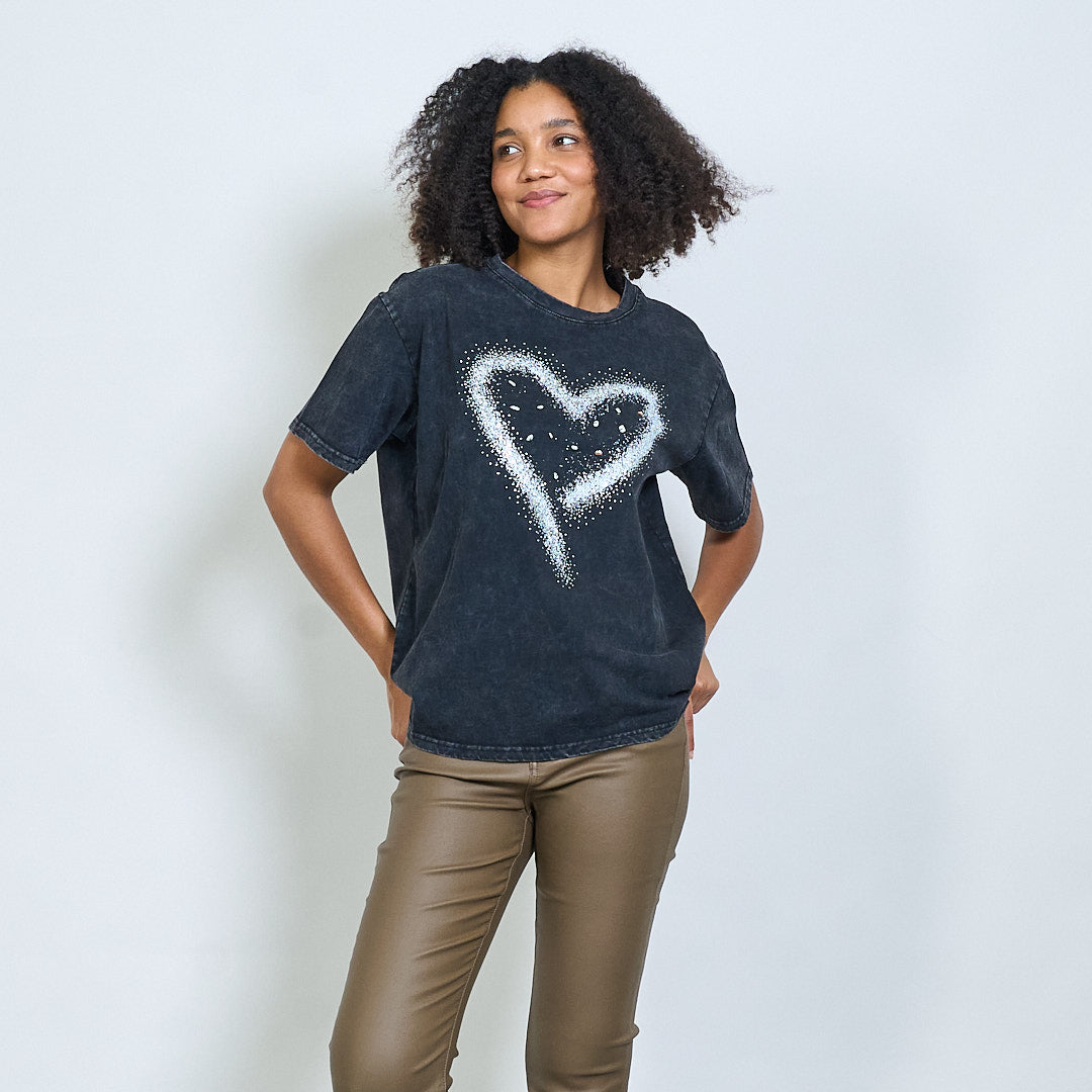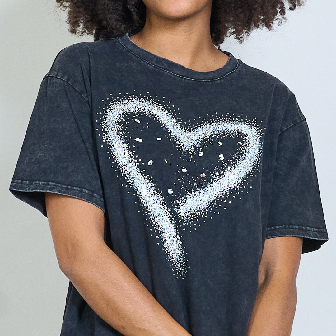Καρδιά γραφικό κρυσταλλικό διακοσμημένο πλυμένο μπλουζάκι χονδρικής