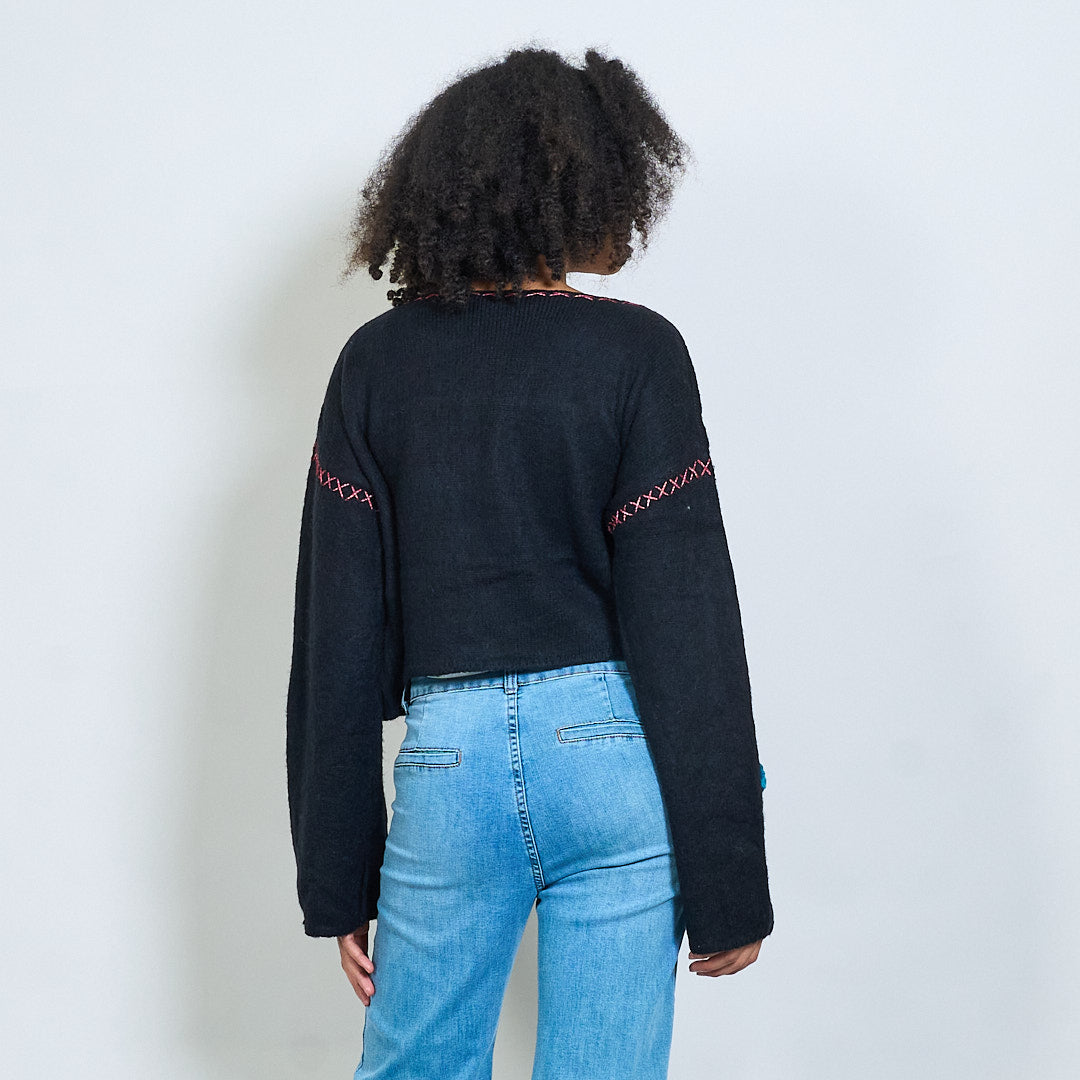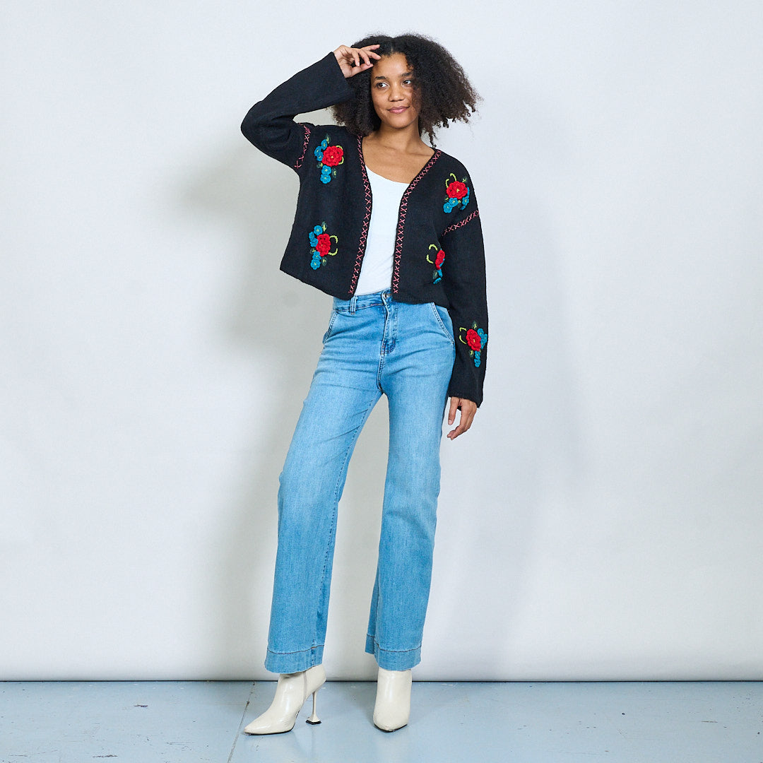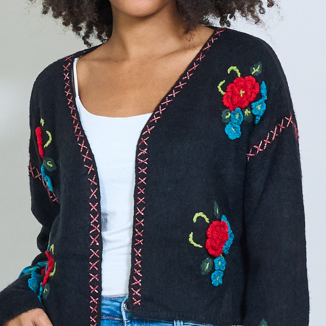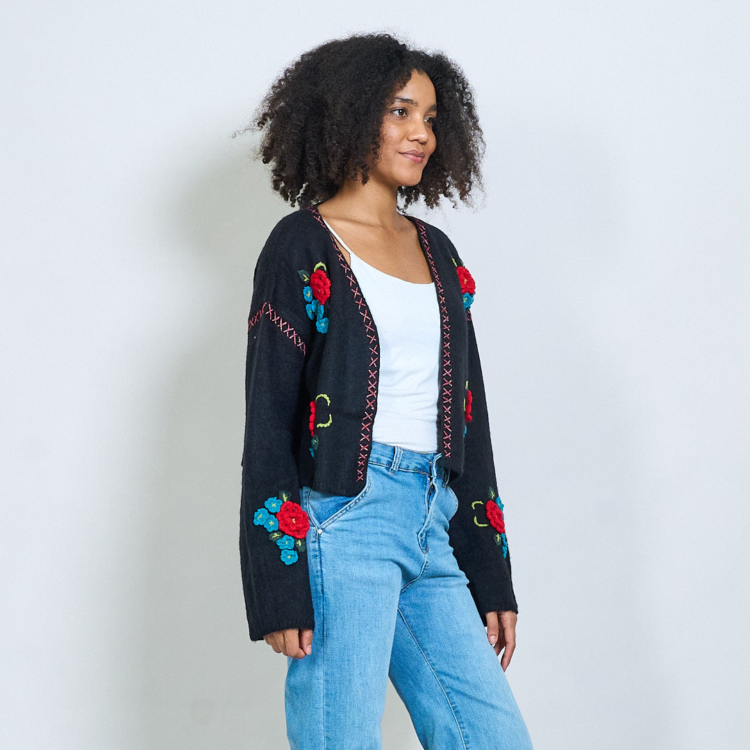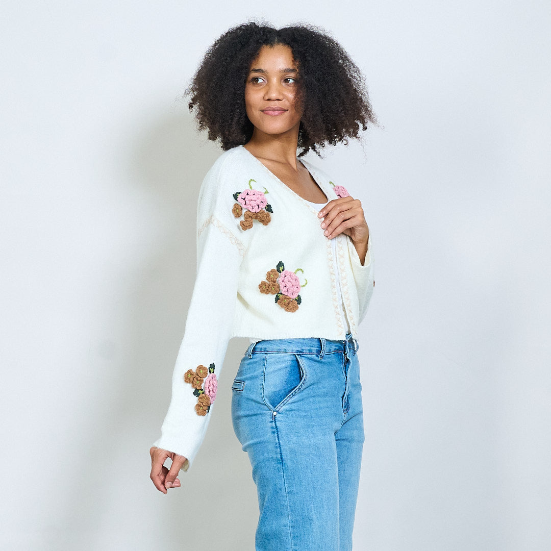 - Μαλακή δεμένη ζακέτα με ζωντανό λουλουδάτο κέντημα
