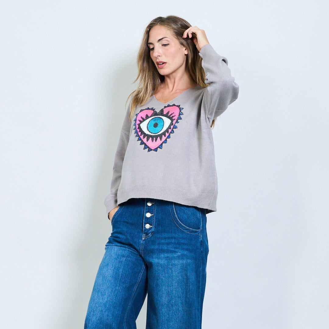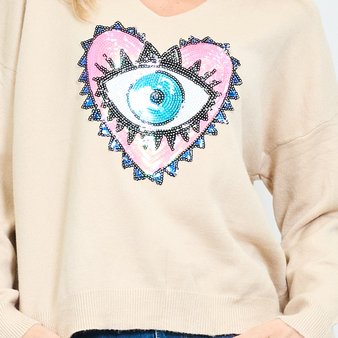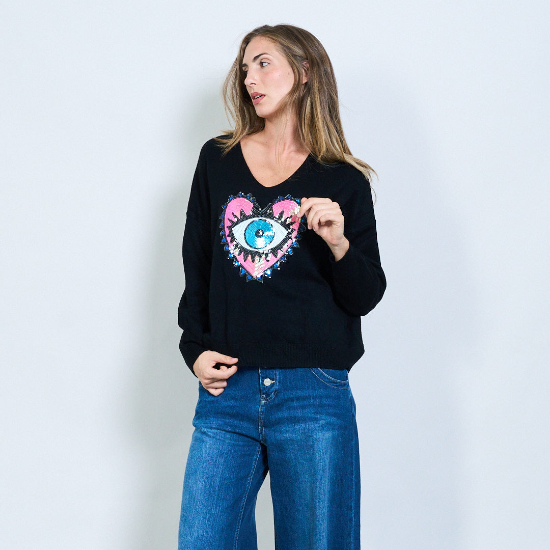 Το πουλόβερ V-λαιμό με το Sequin Heart and Eye Appliqué χονδρικής πώλησης
