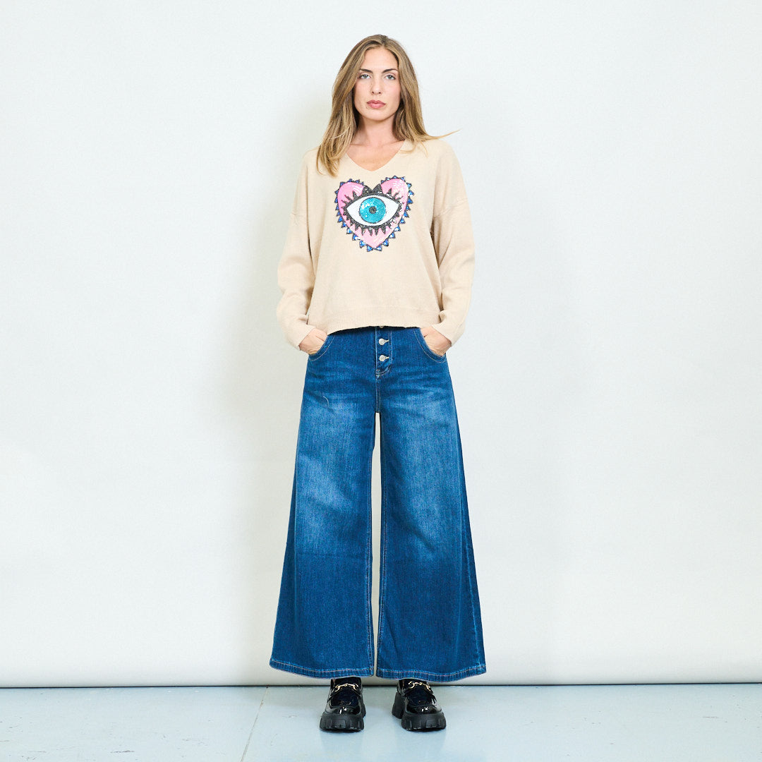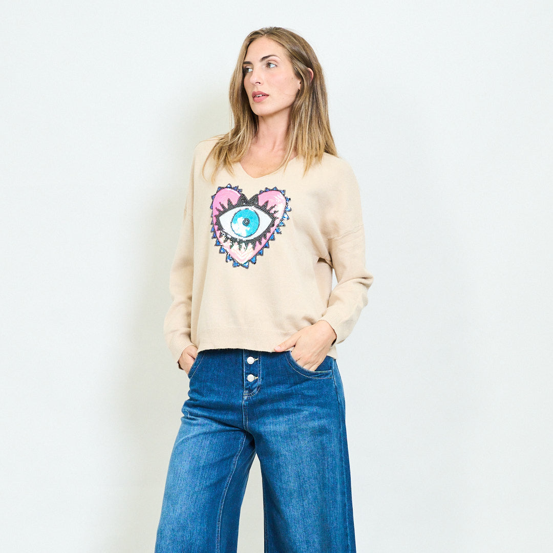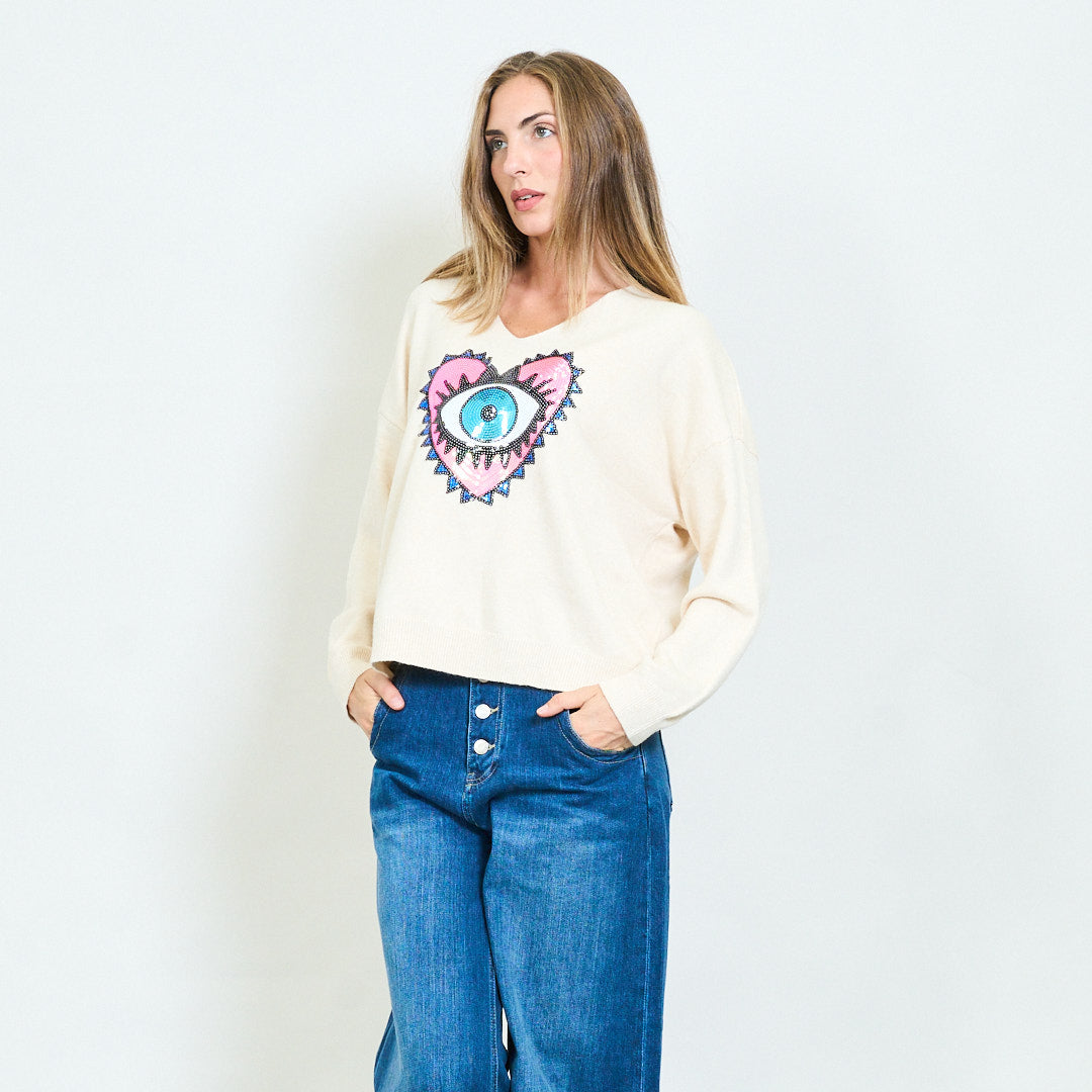 Το πουλόβερ V-λαιμό με το Sequin Heart and Eye Appliqué χονδρικής πώλησης