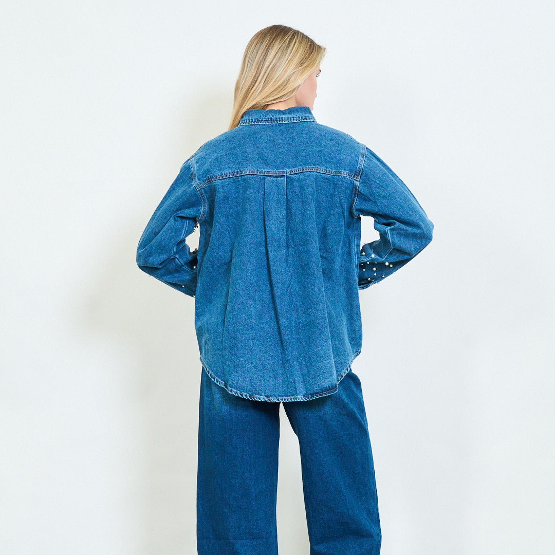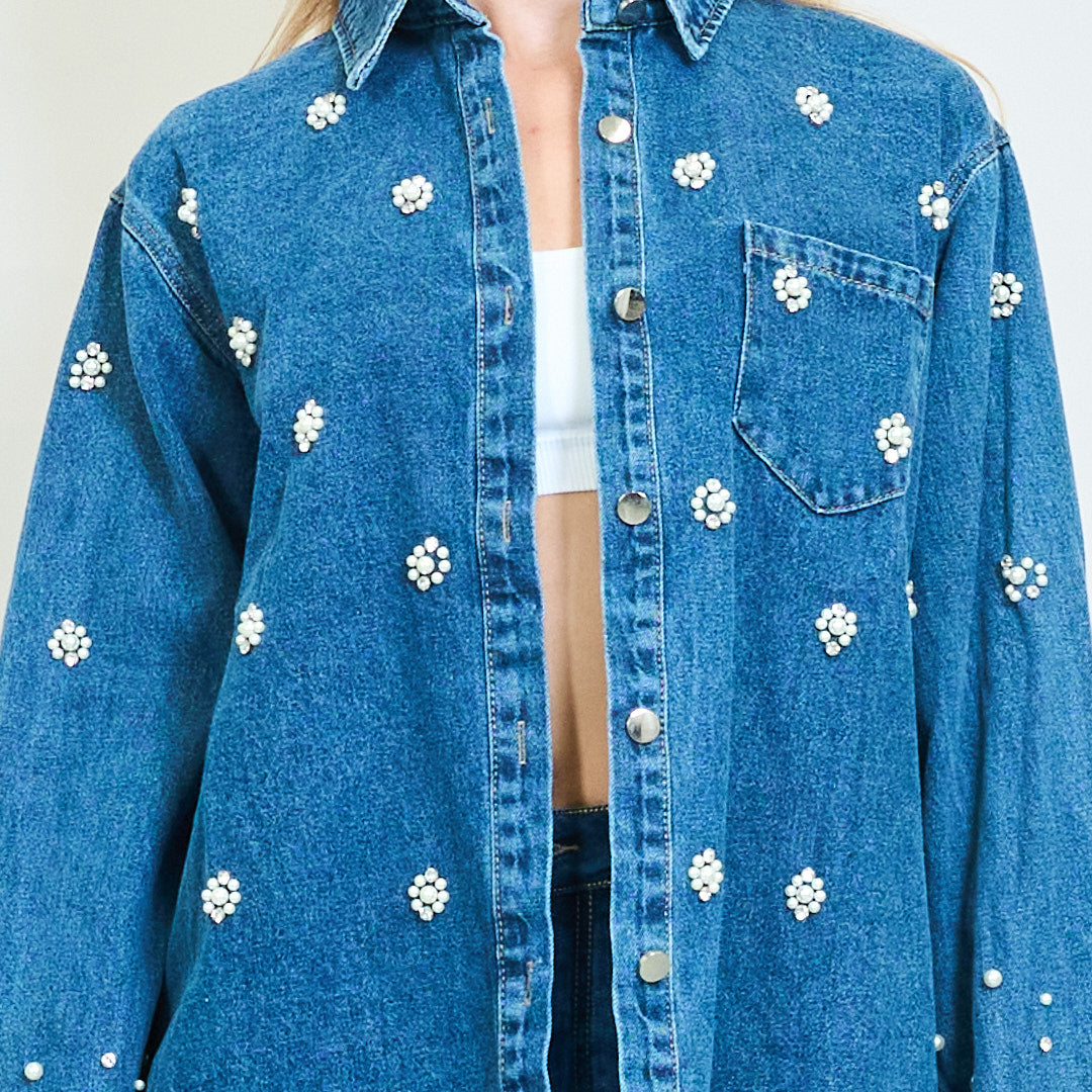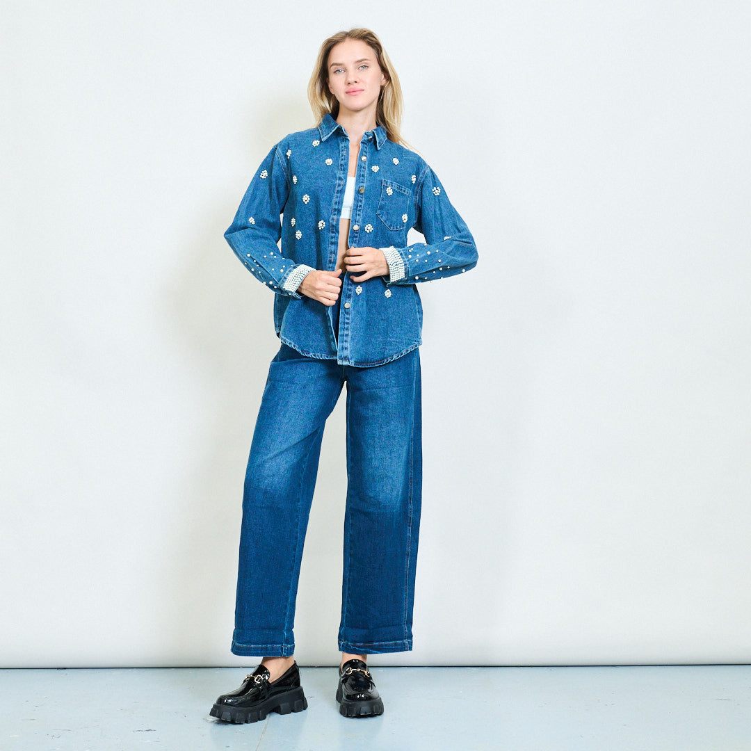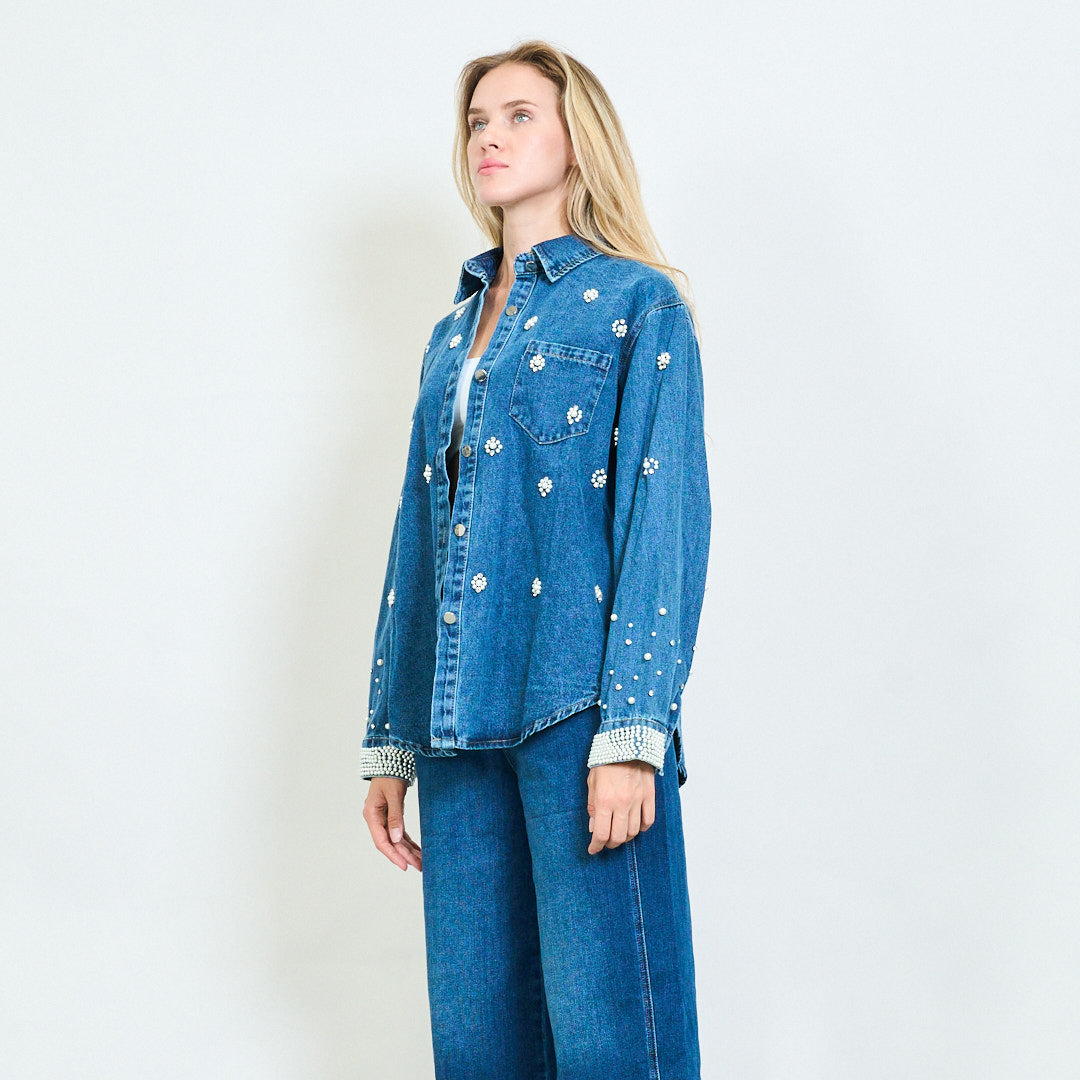 - Denim πουκάμισο διακοσμημένο με μαργαριτάρι χάντρα floral μοτίβα