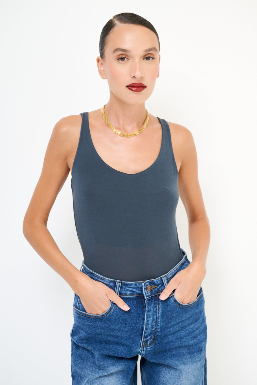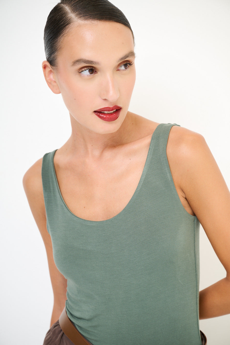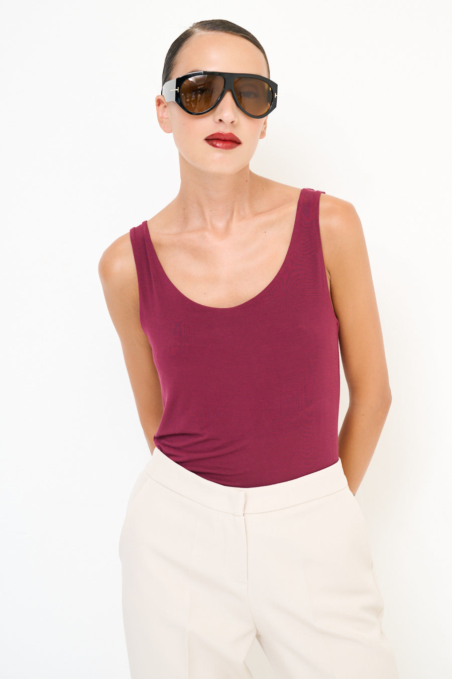 Scoop λαιμό τέντωμα αμάνικη κορυφή χονδρική πώληση
