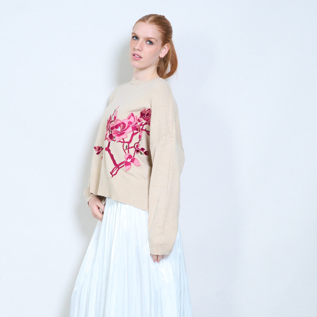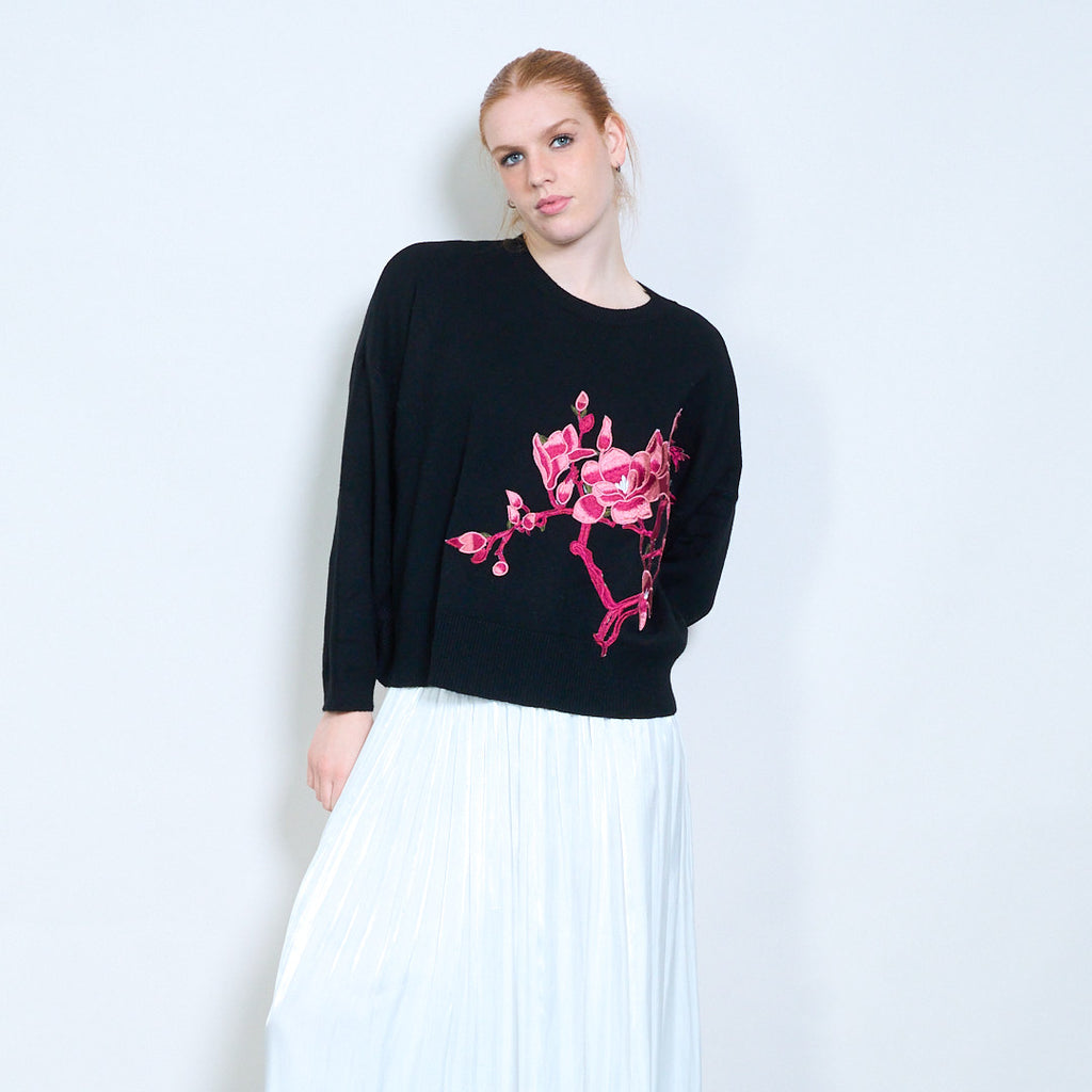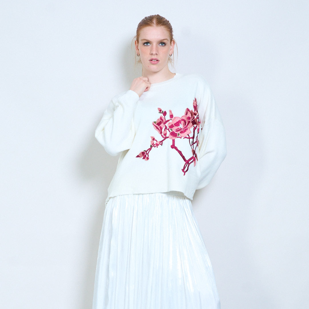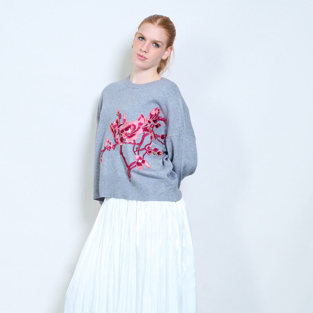 Πουλόβερ με στρογγυλή λαιμόκοψη με κλαδί ορχιδέας με κέντημα φλοράλ χονδρικής