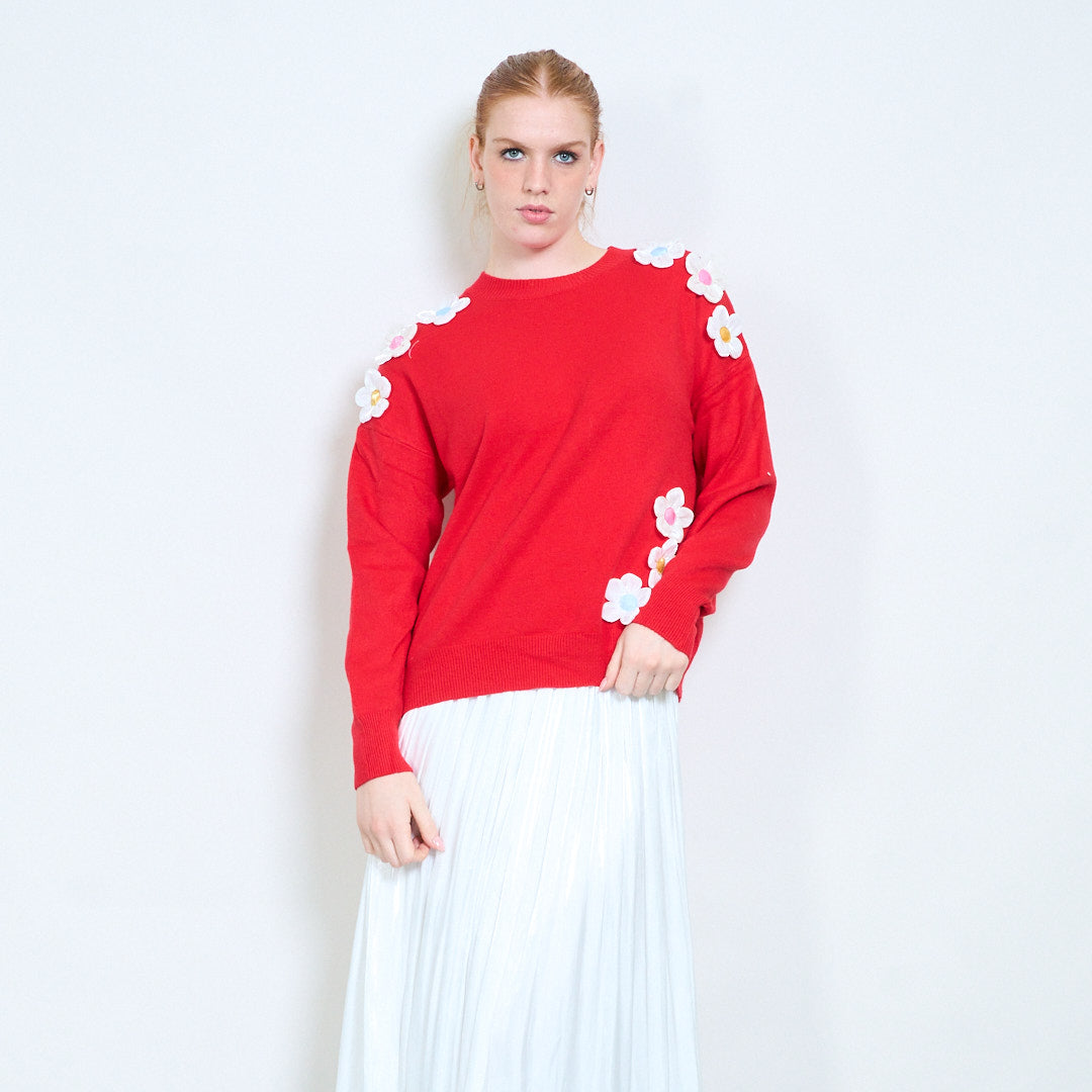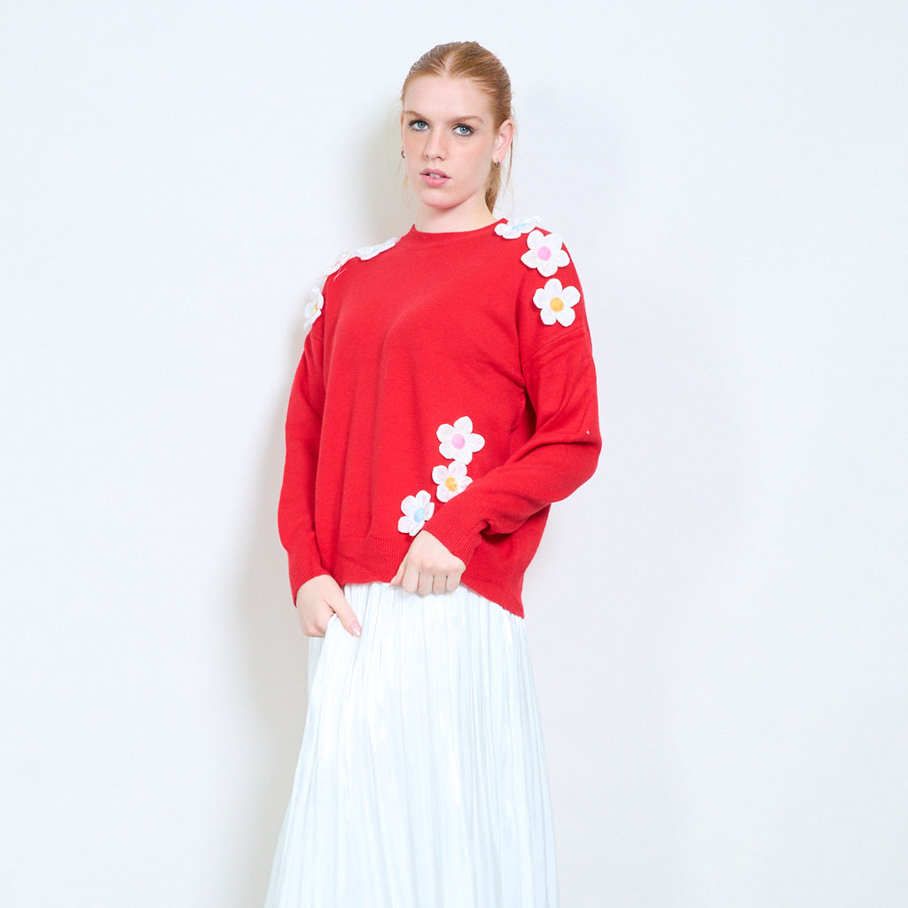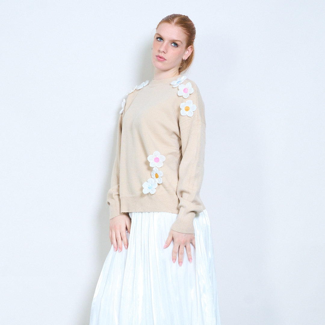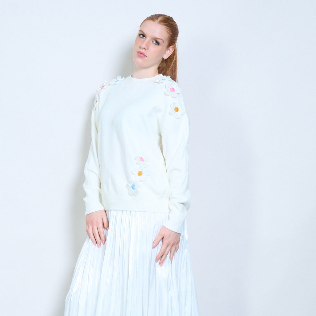 Floral απλικέ πολύχρωμο πουλόβερ μαργαρίτα με στρογγυλή λαιμόκοψη χονδρική