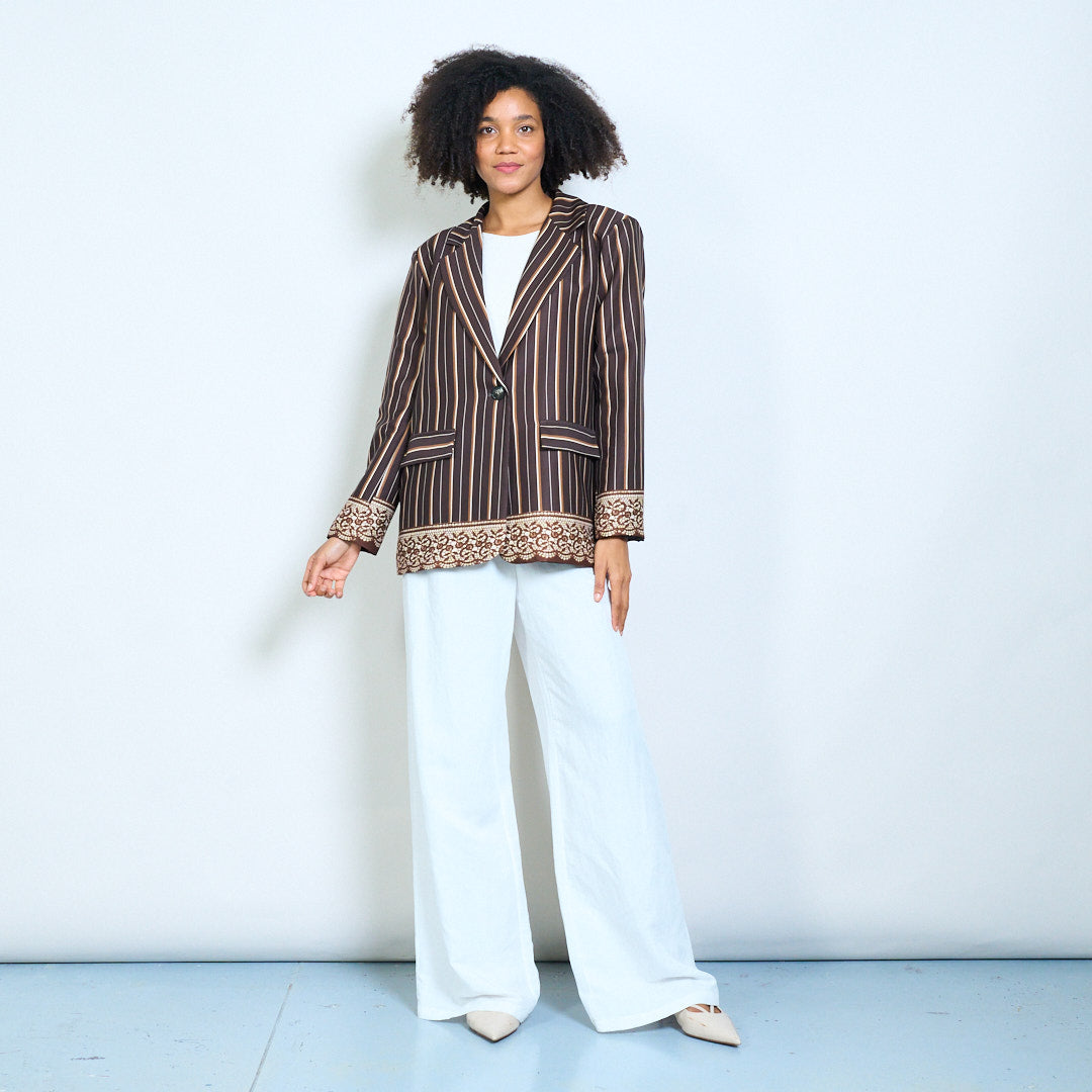 Ριγέ μονό κουμπί προσαρμοσμένο blazer με λεπτομέρεια δαντέλας χονδρικής