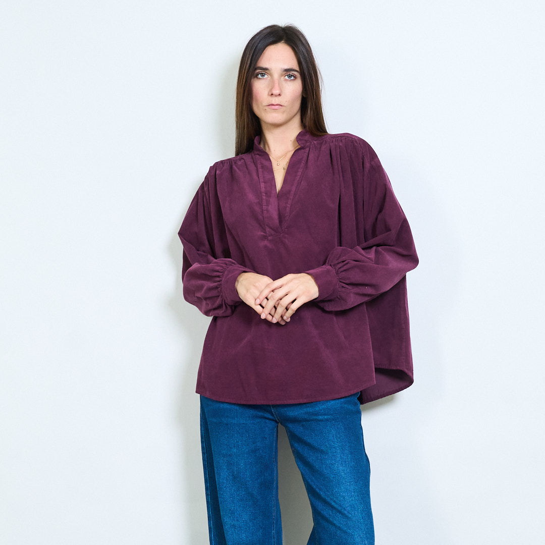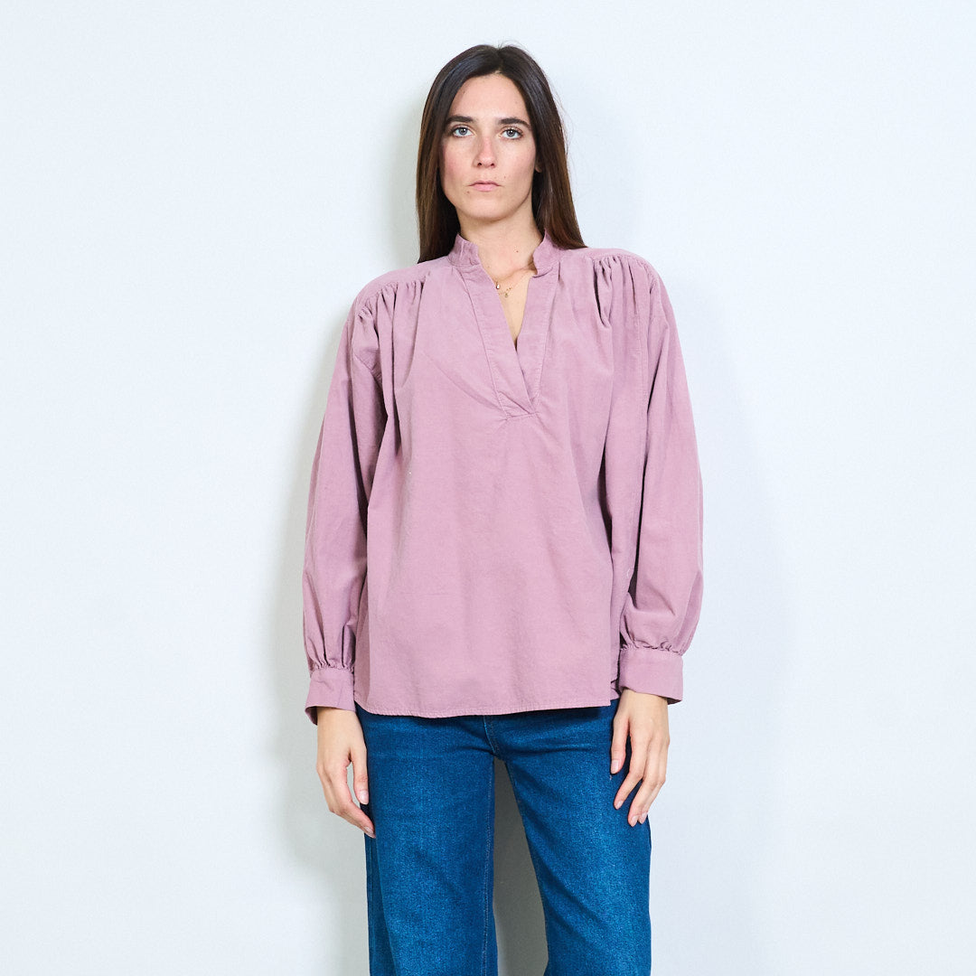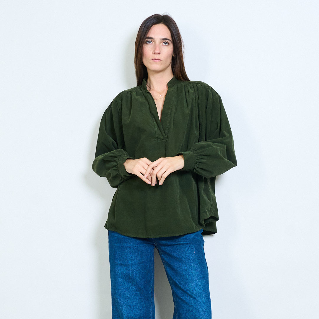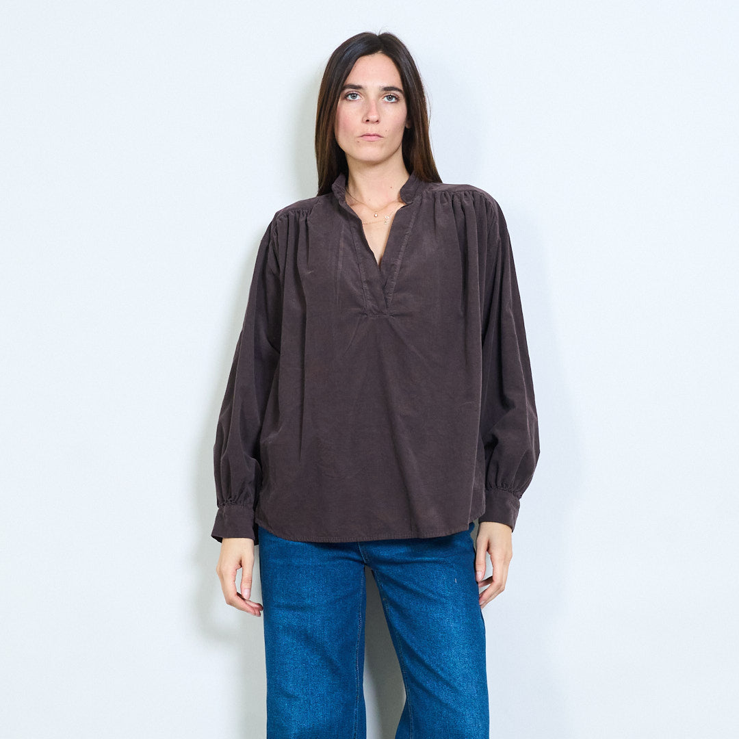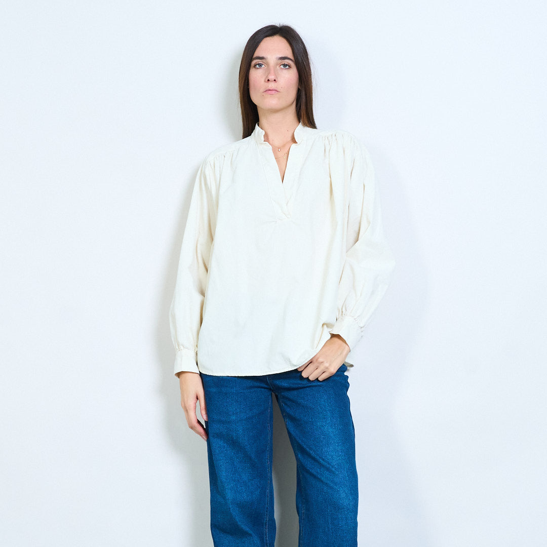 Χαλαρή προσαρμογή V-slit λαιμόκοψη Puff Sleeve Blouse Wholesale