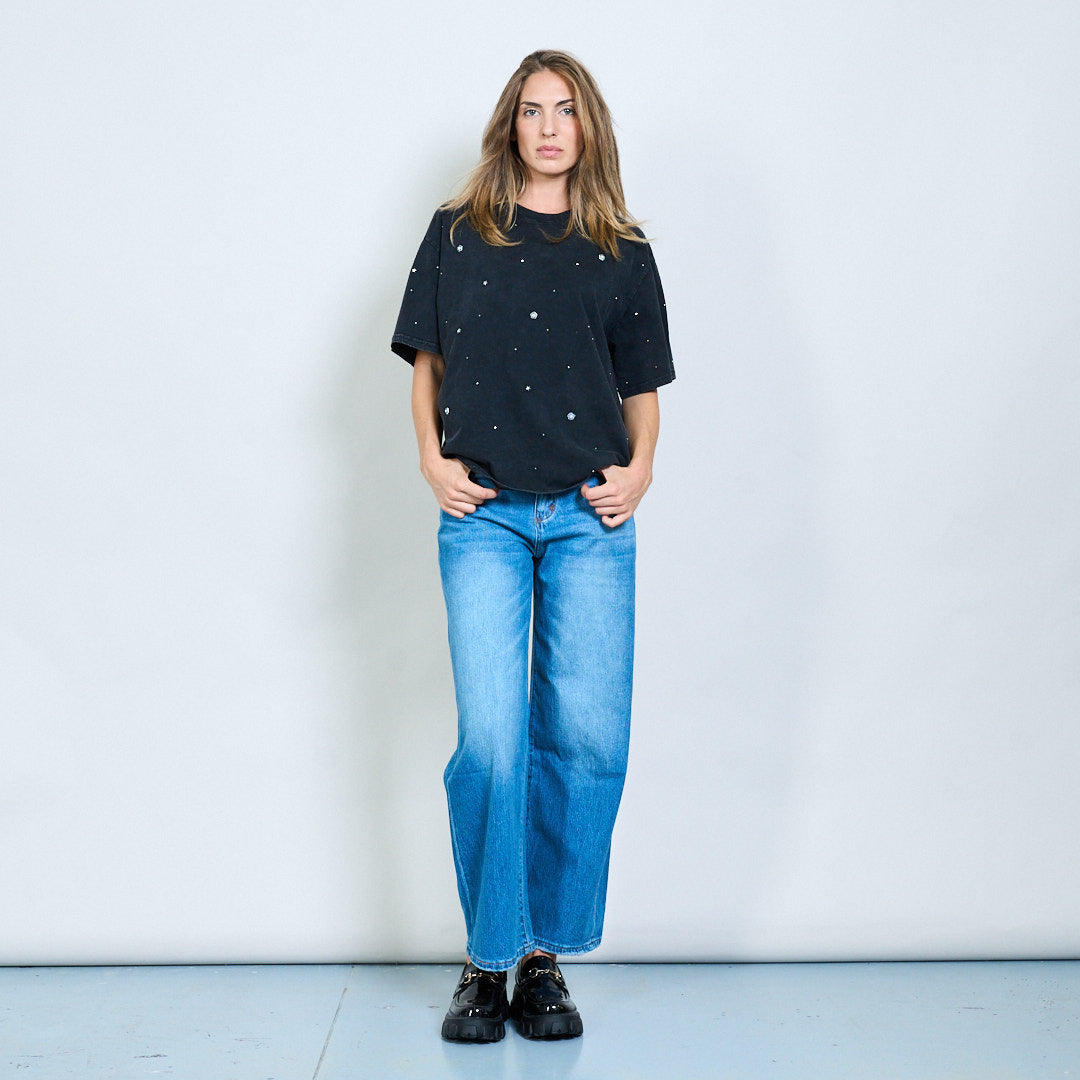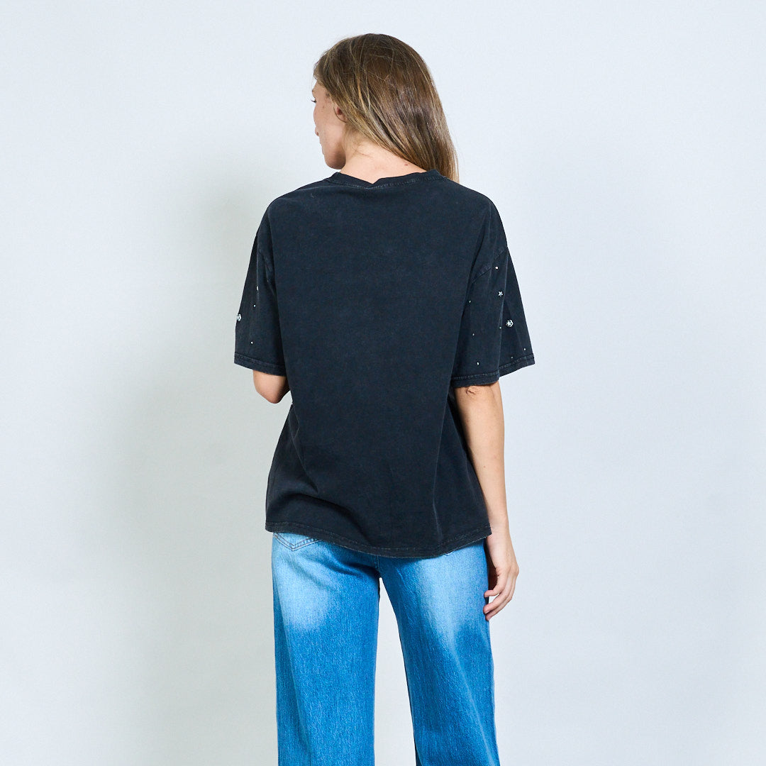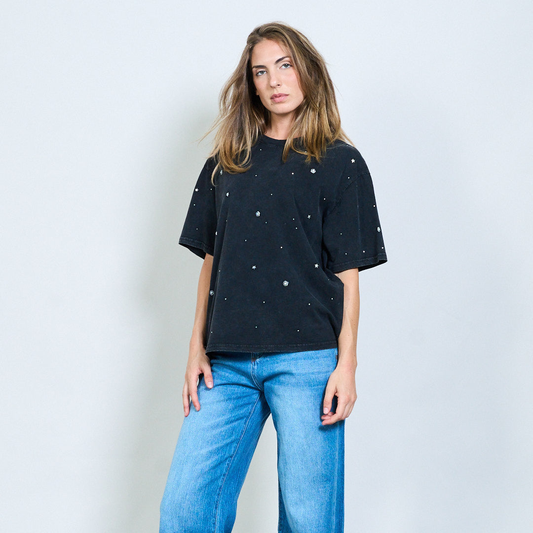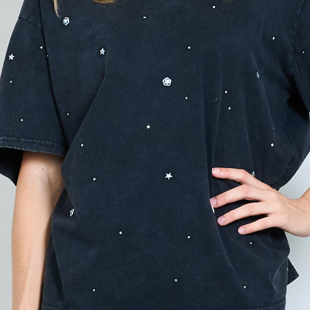 Αστέρι και στρας διακοσμημένο πλυμένο υπερμεγέθη χονδρικό μπλουζάκι