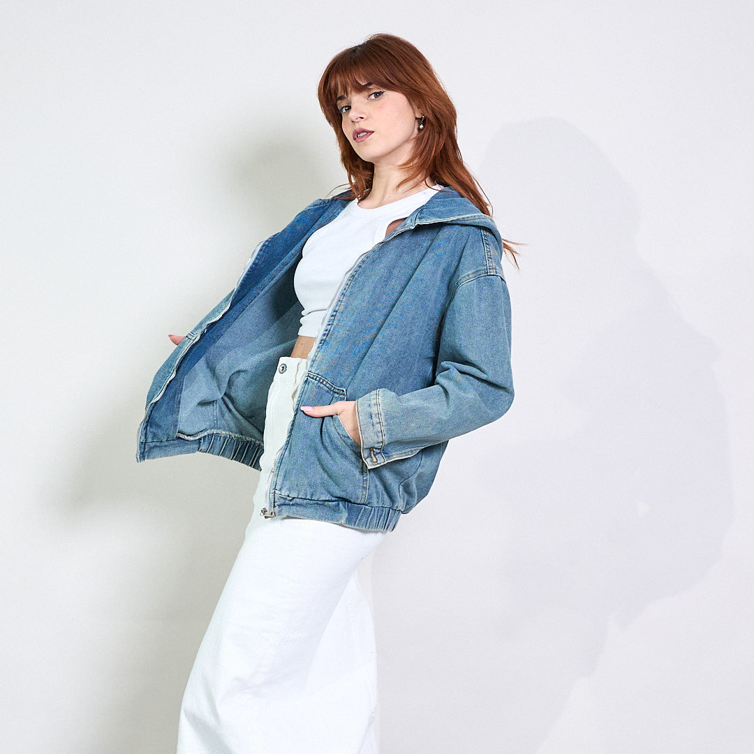 Πλυμένο φερμουάρ υπερμεγέθη σακάκι denim hoodie