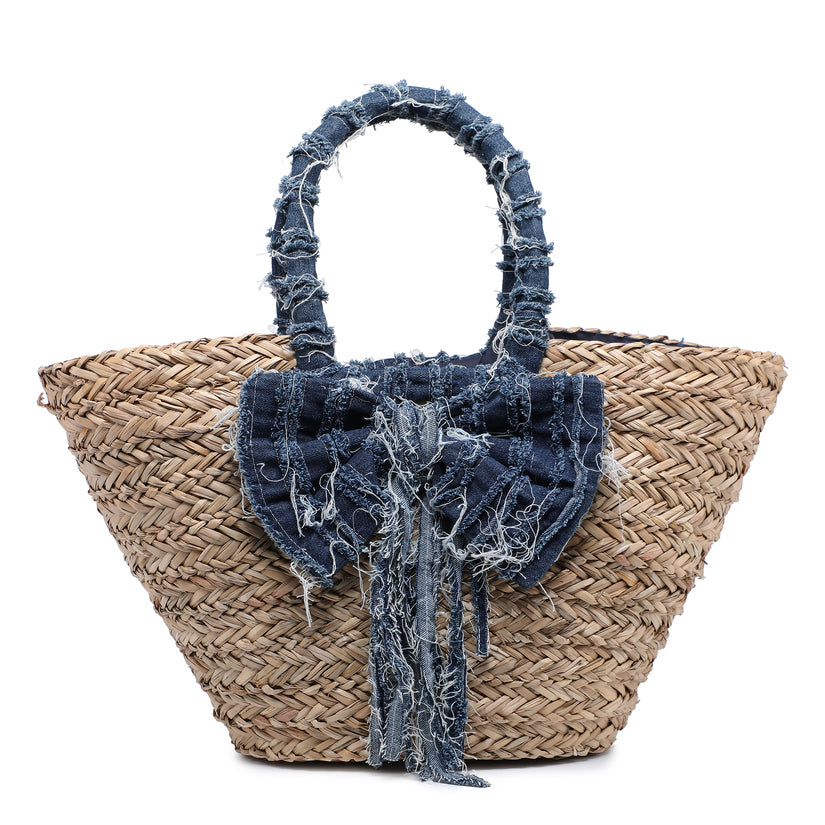 Bolso natural de paja con arco de mezclilla angustiado de gran tamaño y manijas envueltas al por mayor