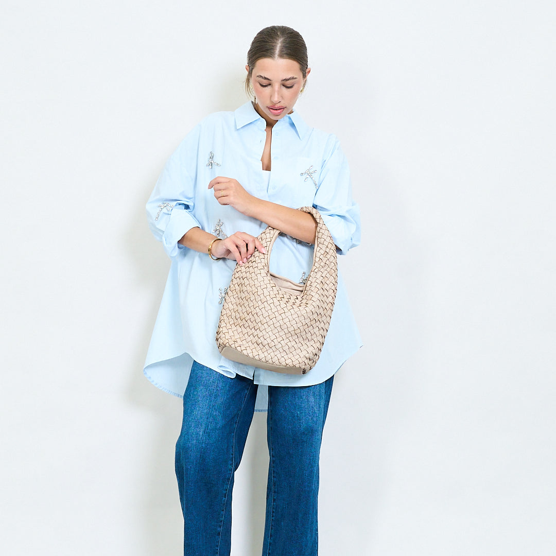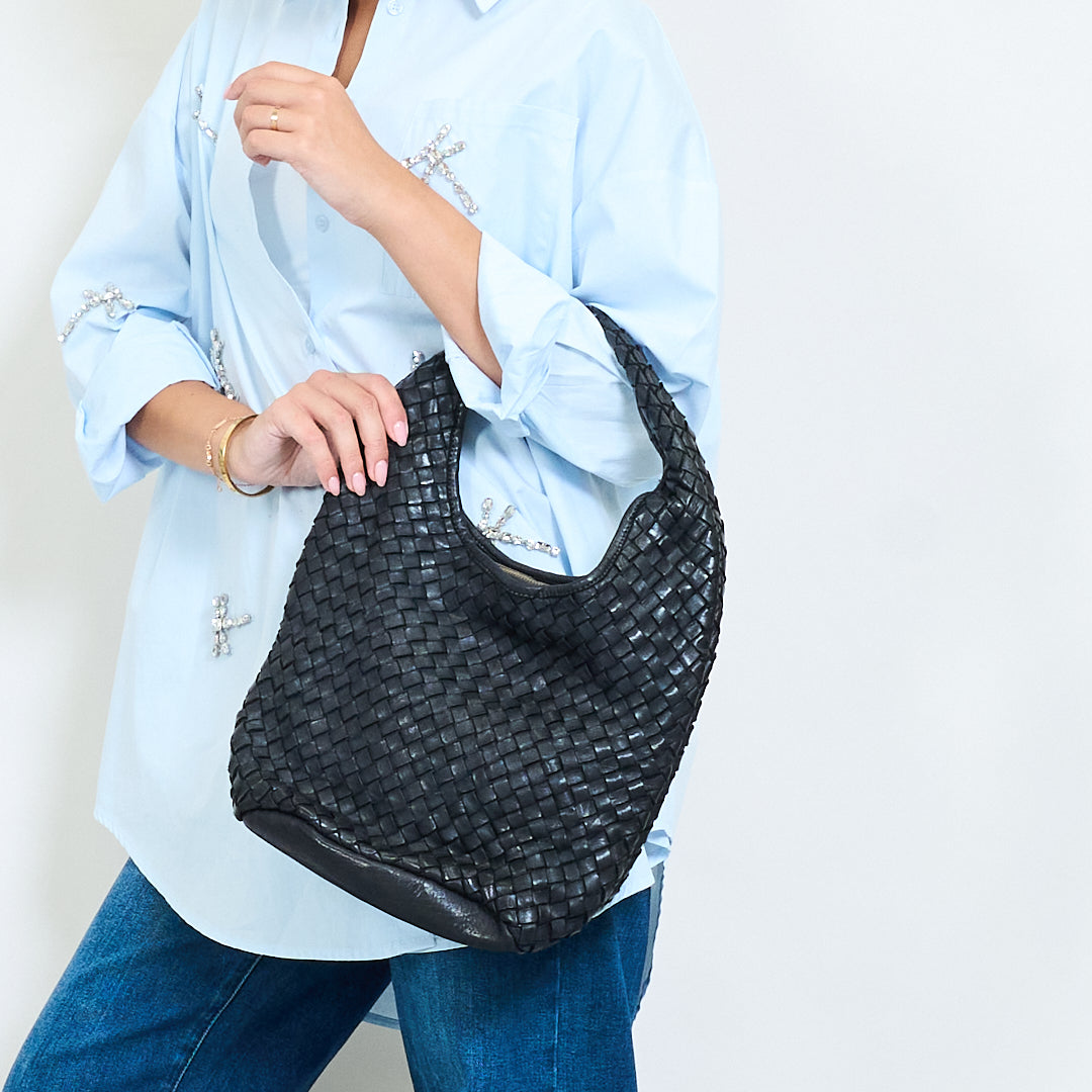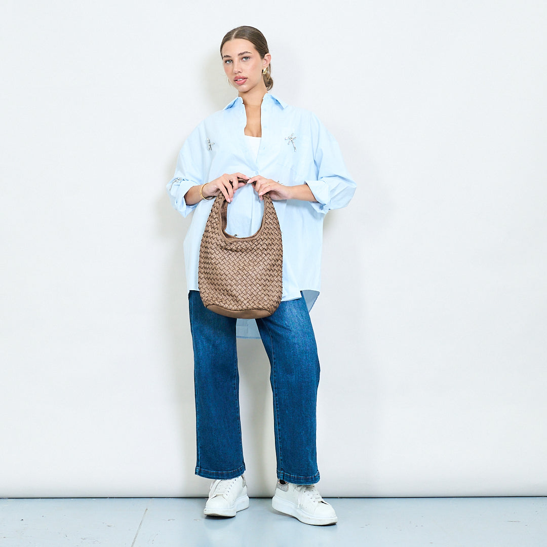 Bolsa de embarcación tejida estructurada con base de cuero de contraste al por mayor