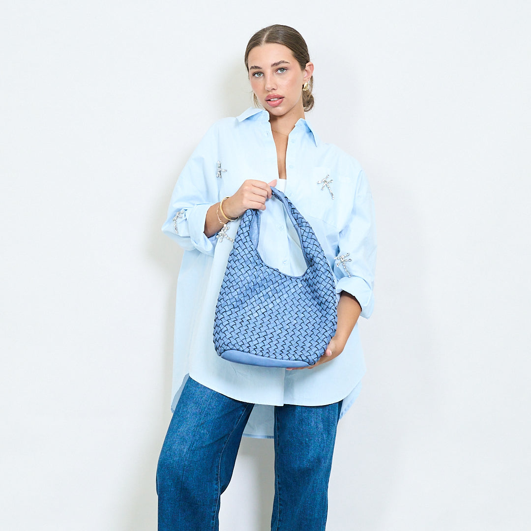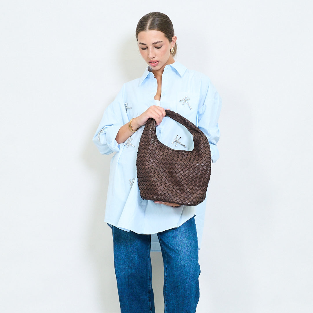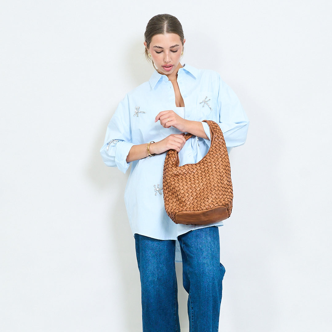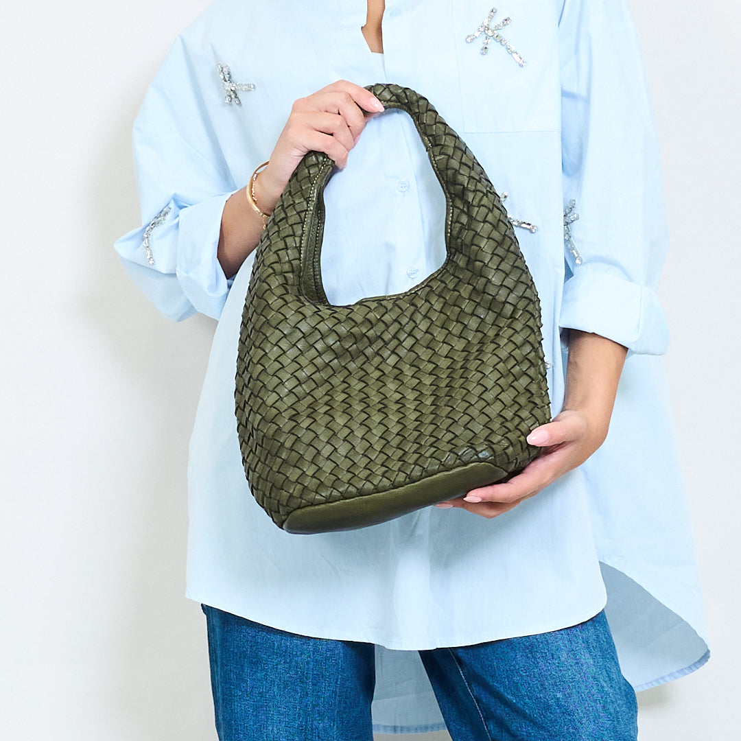 Bolsa de embarcación tejida estructurada con base de cuero de contraste al por mayor