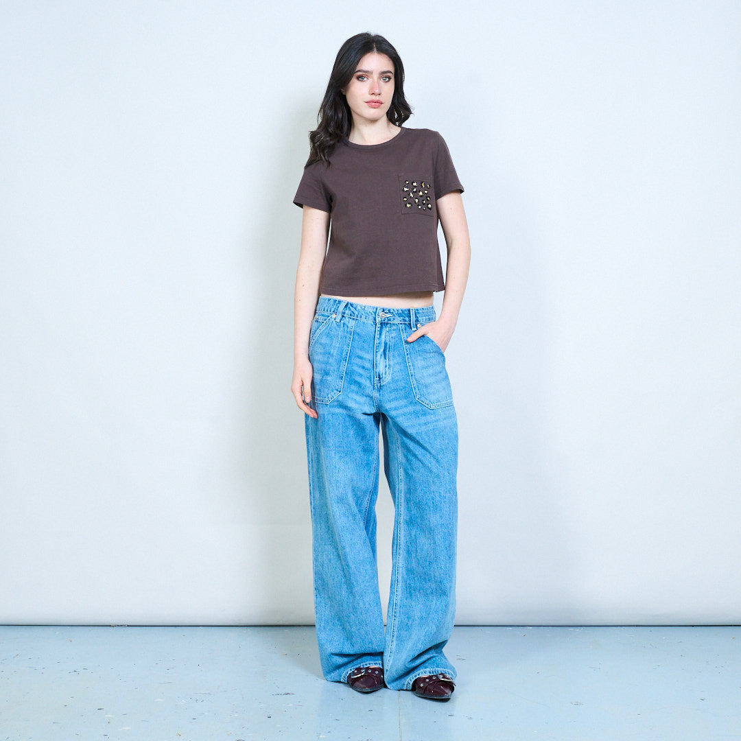 Camiseta de algodón recortada con bolsillo con estampado de leopardo al por mayor