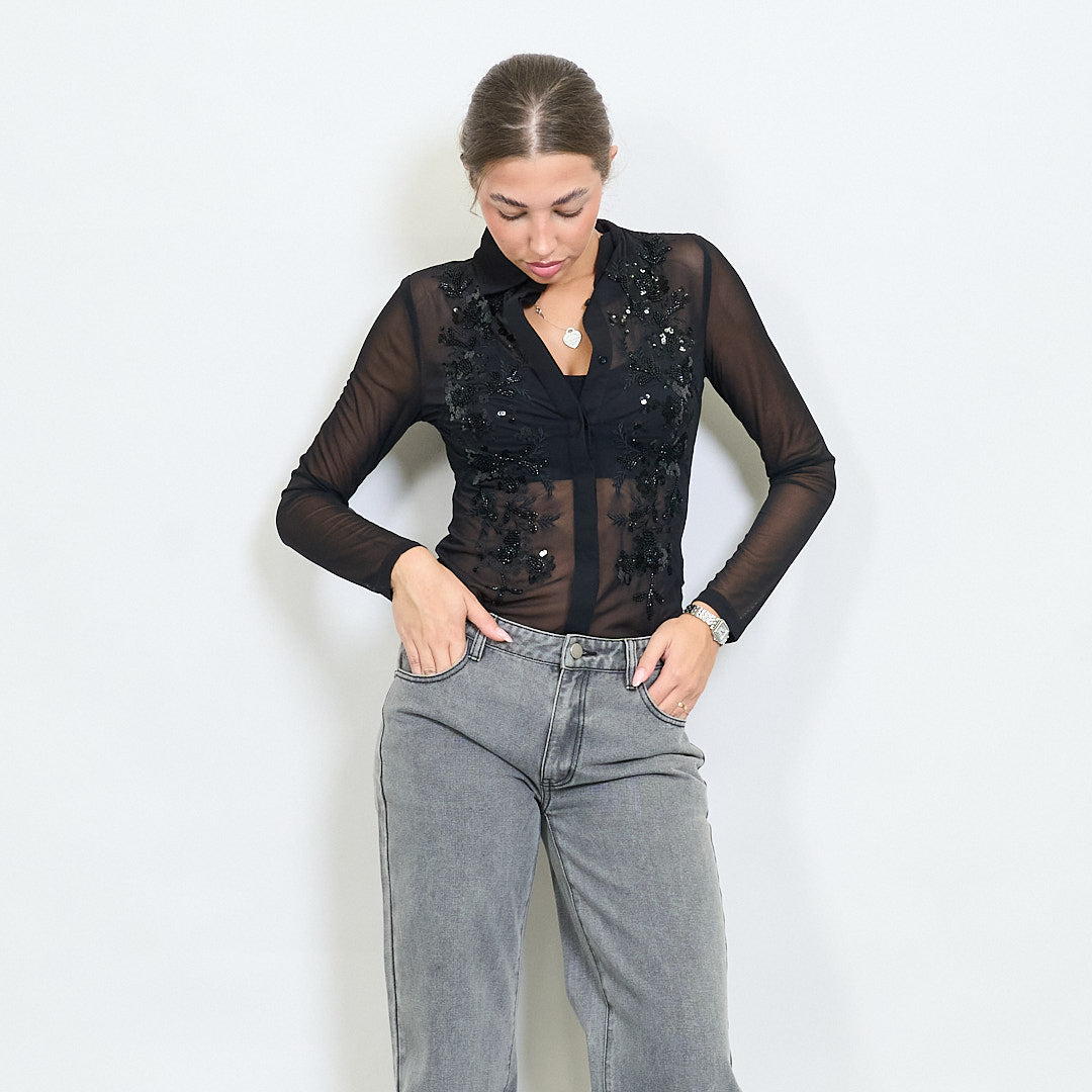 Bodysuit de malla con cuentas florales con cuello de camisa al por mayor