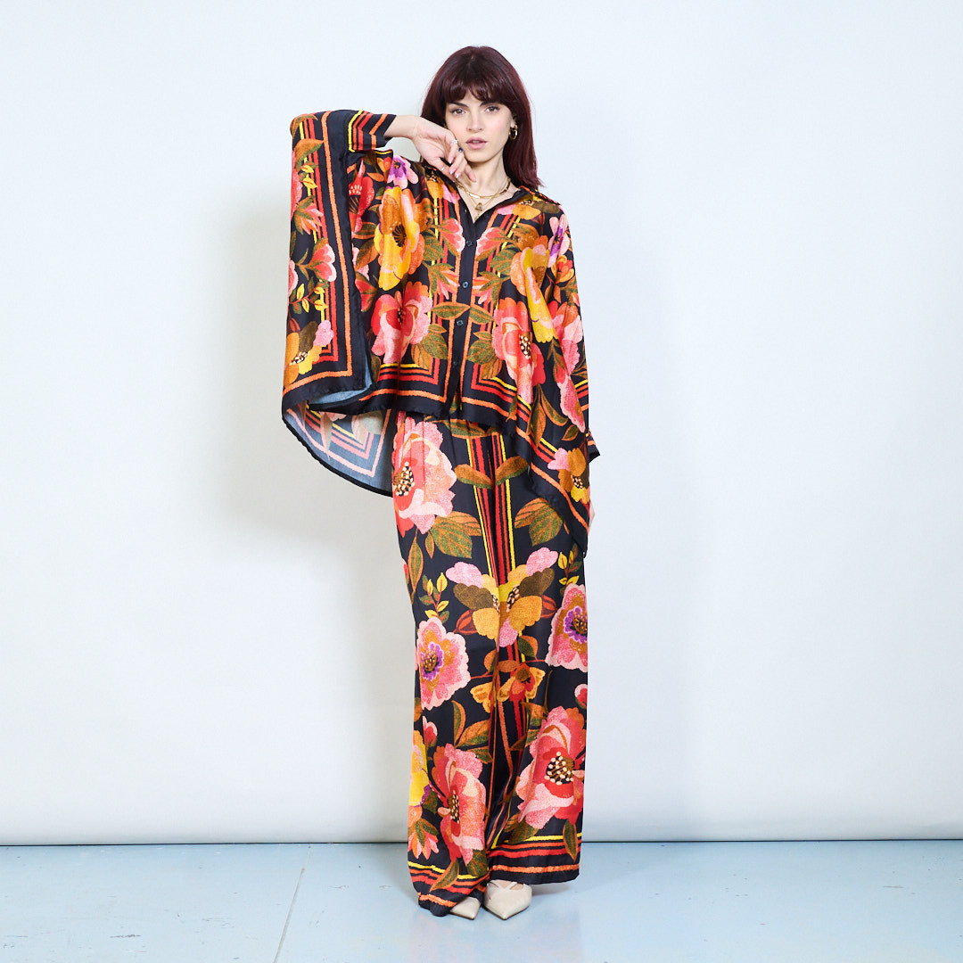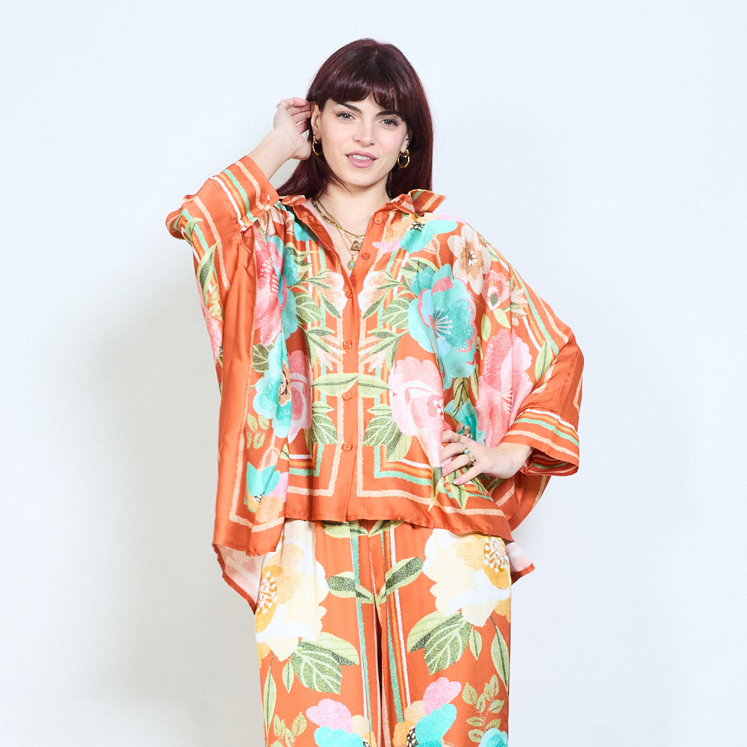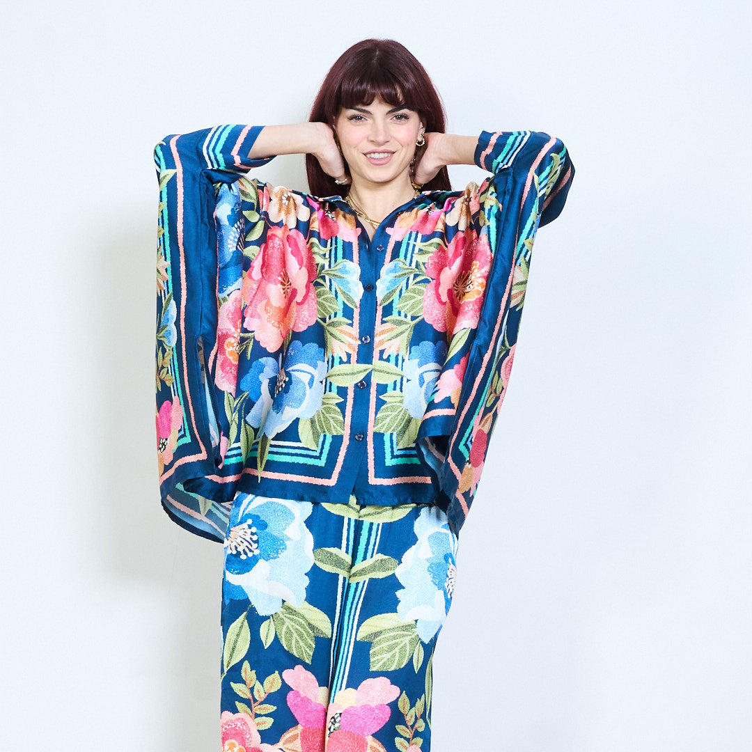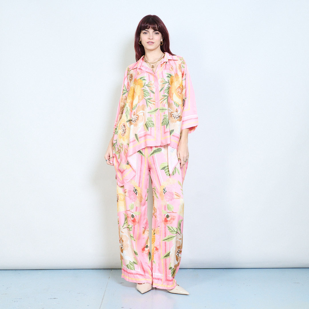Blusa con cuello y manga murciélago con estampado de rayas florales al por mayor