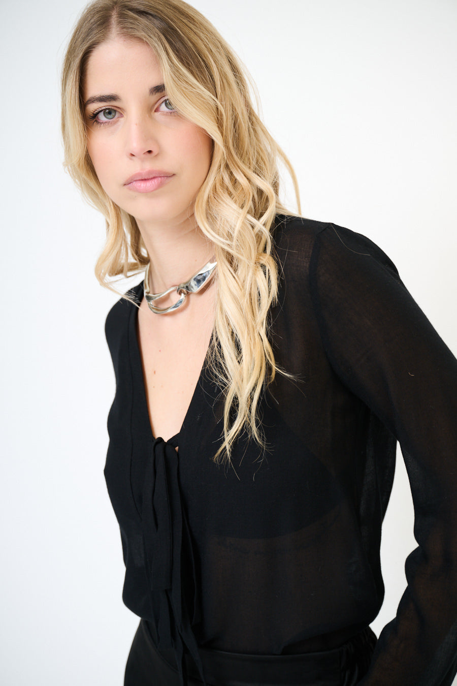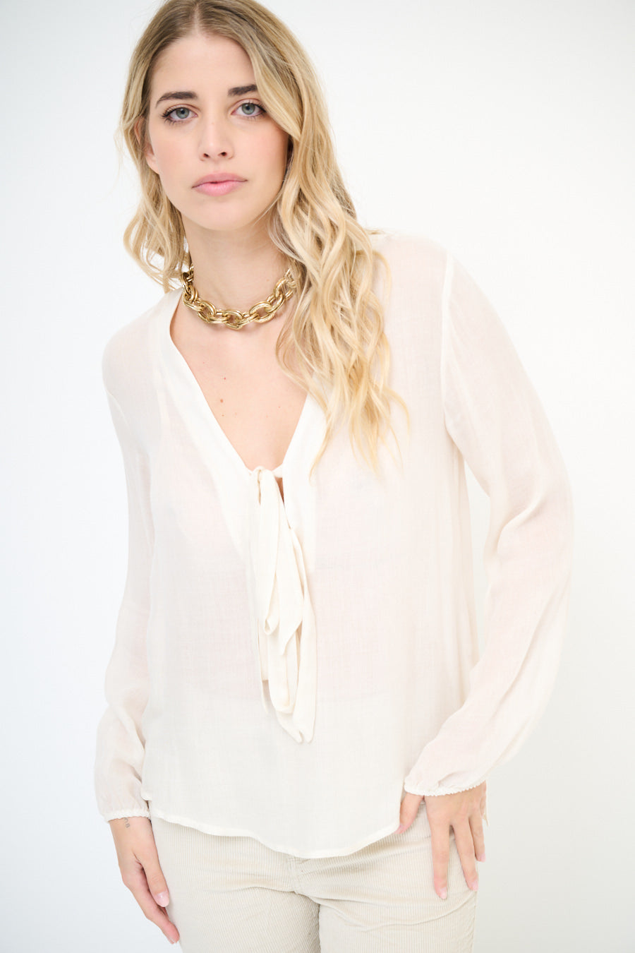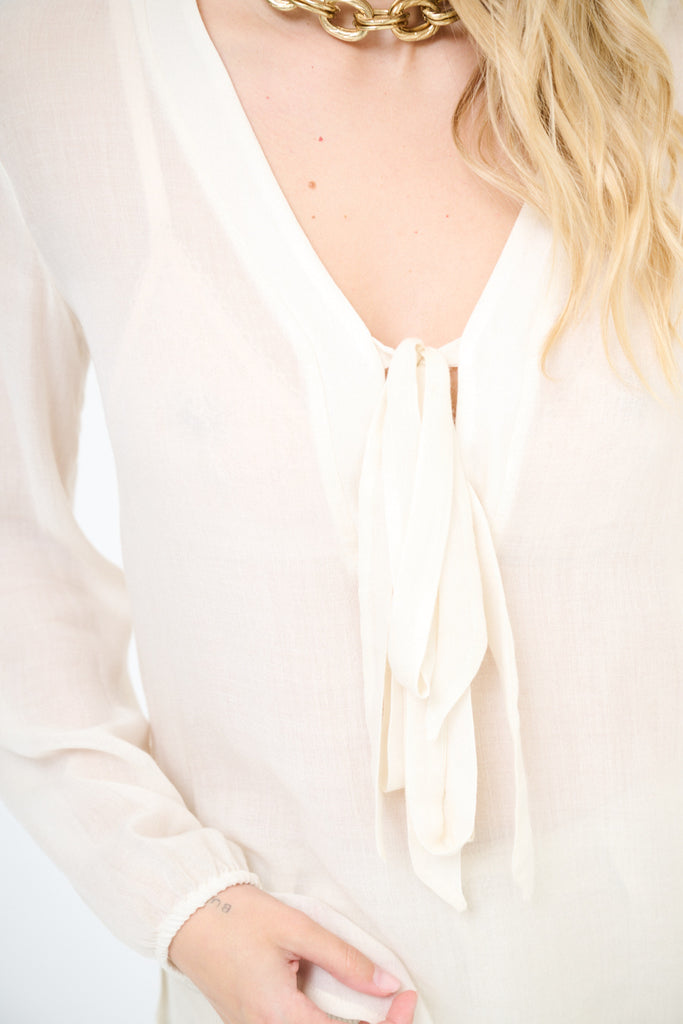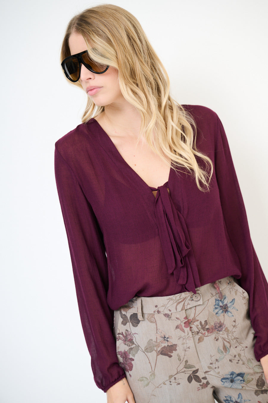 Blusa de gasa fluida con escote de pajarita al por mayor