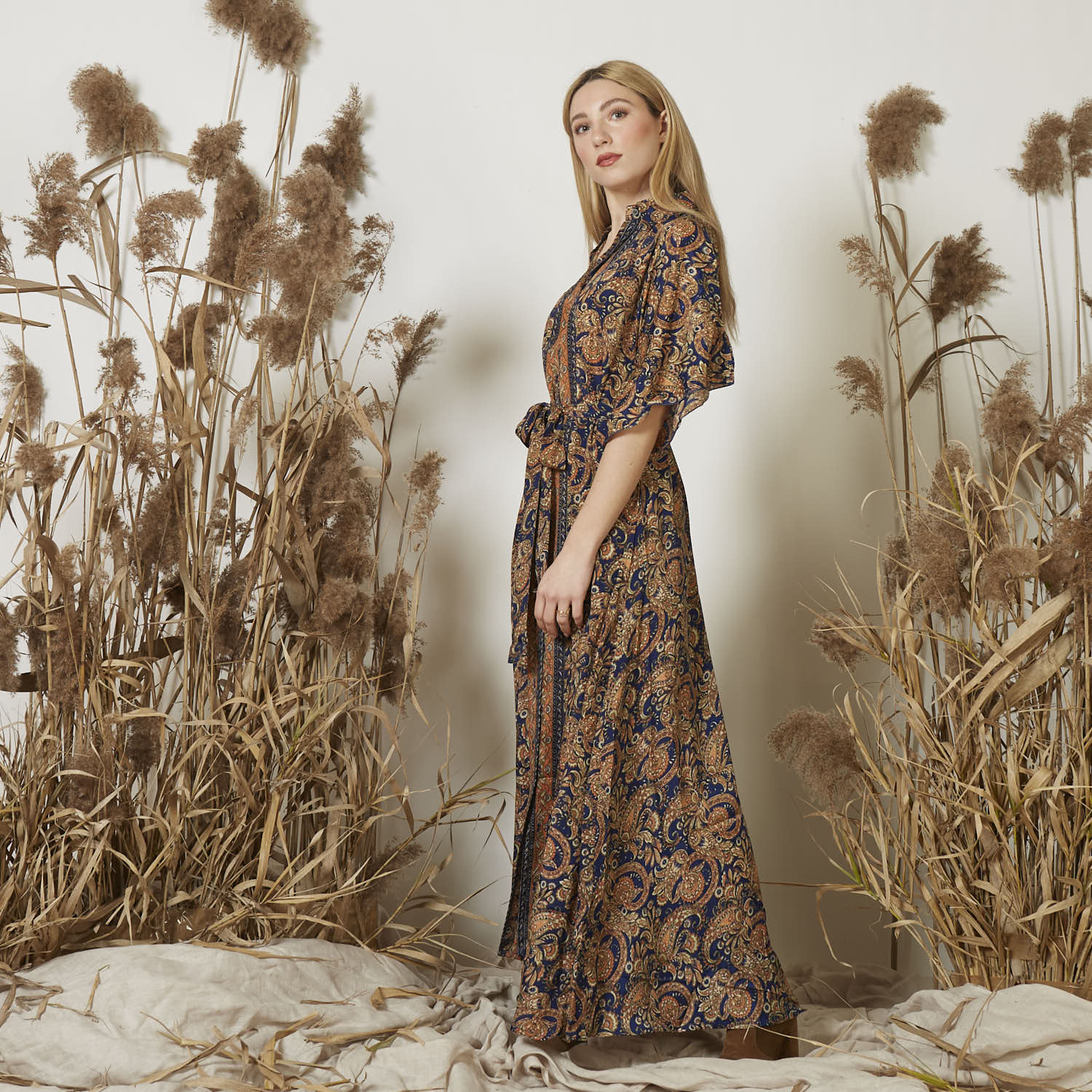 Vestido largo étnico estampado al por mayor en seda