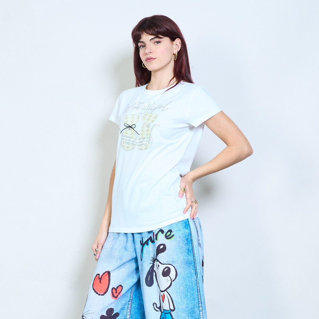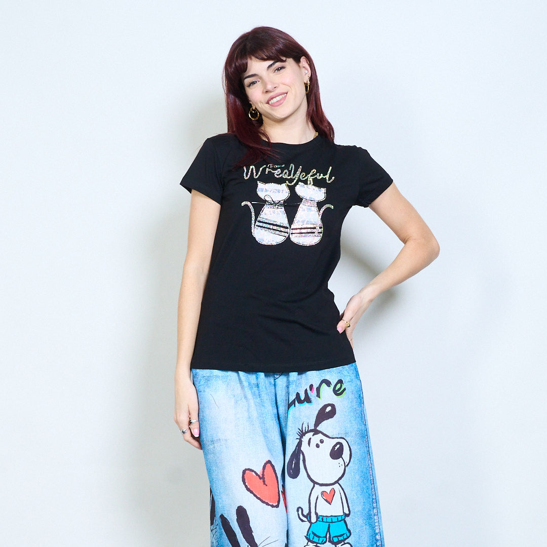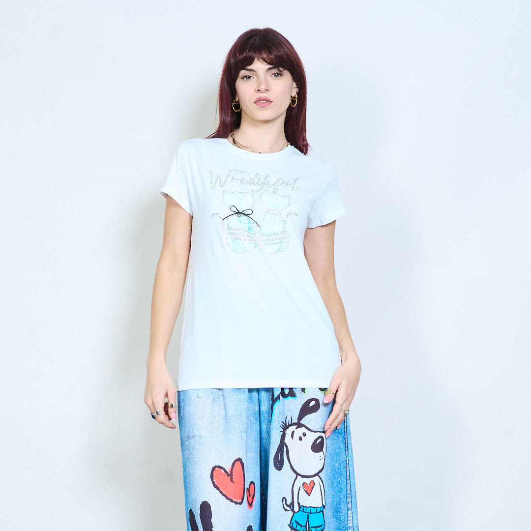 Animalia edit camiseta lentejuelas strass gráfico gato adornado al por mayor