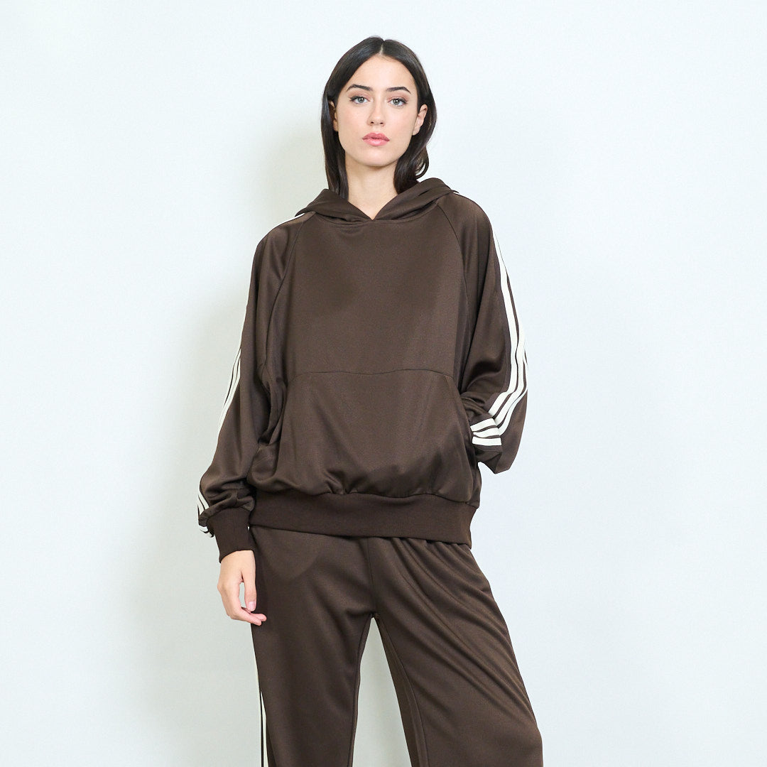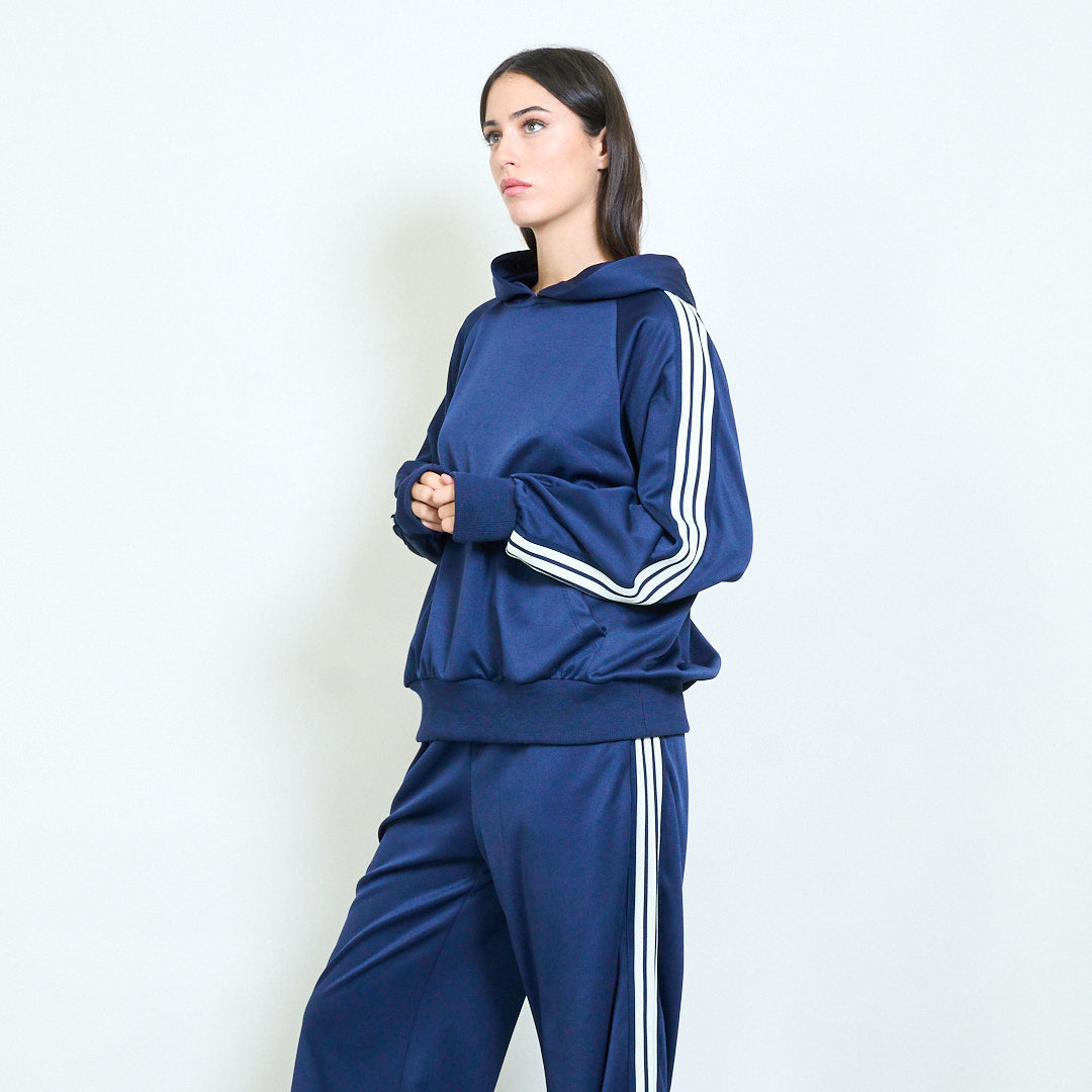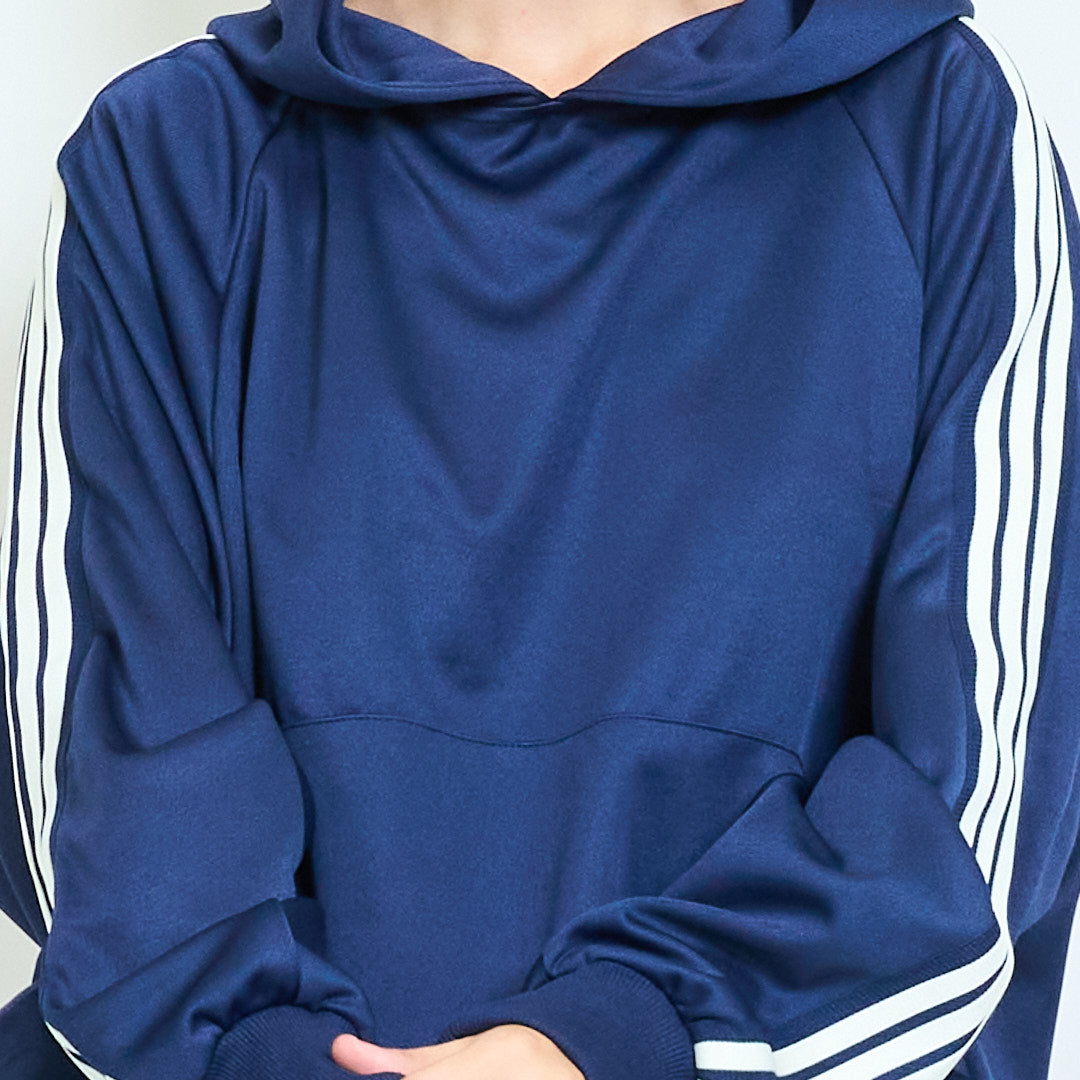 - Sudadera deportiva con capucha y detalles de rayas en contraste a lo largo de las mangas