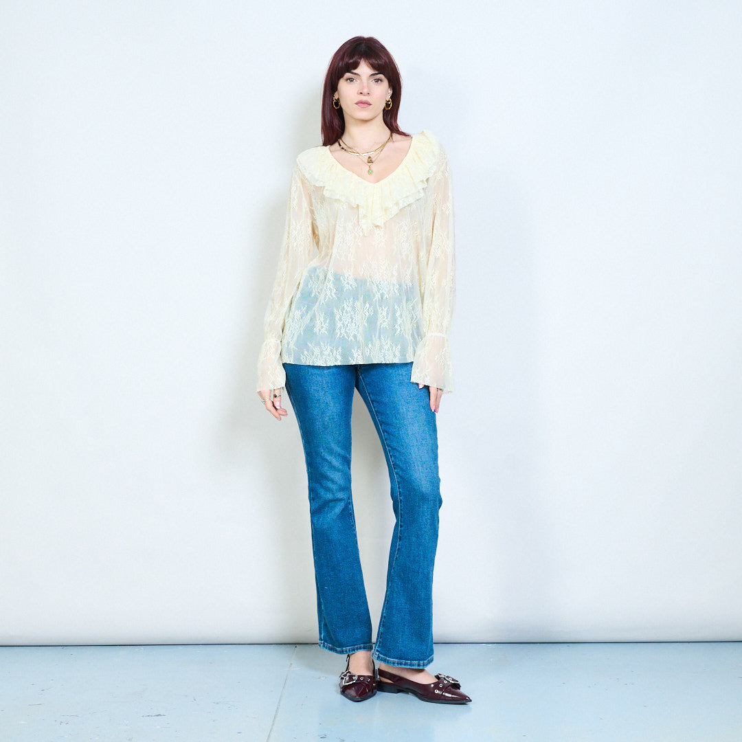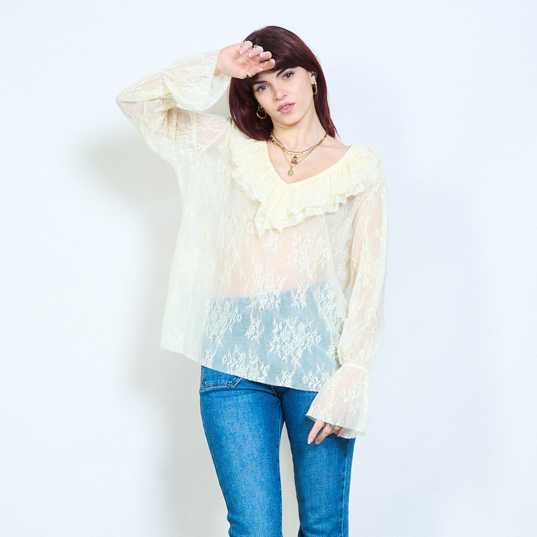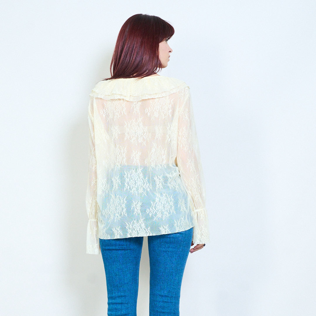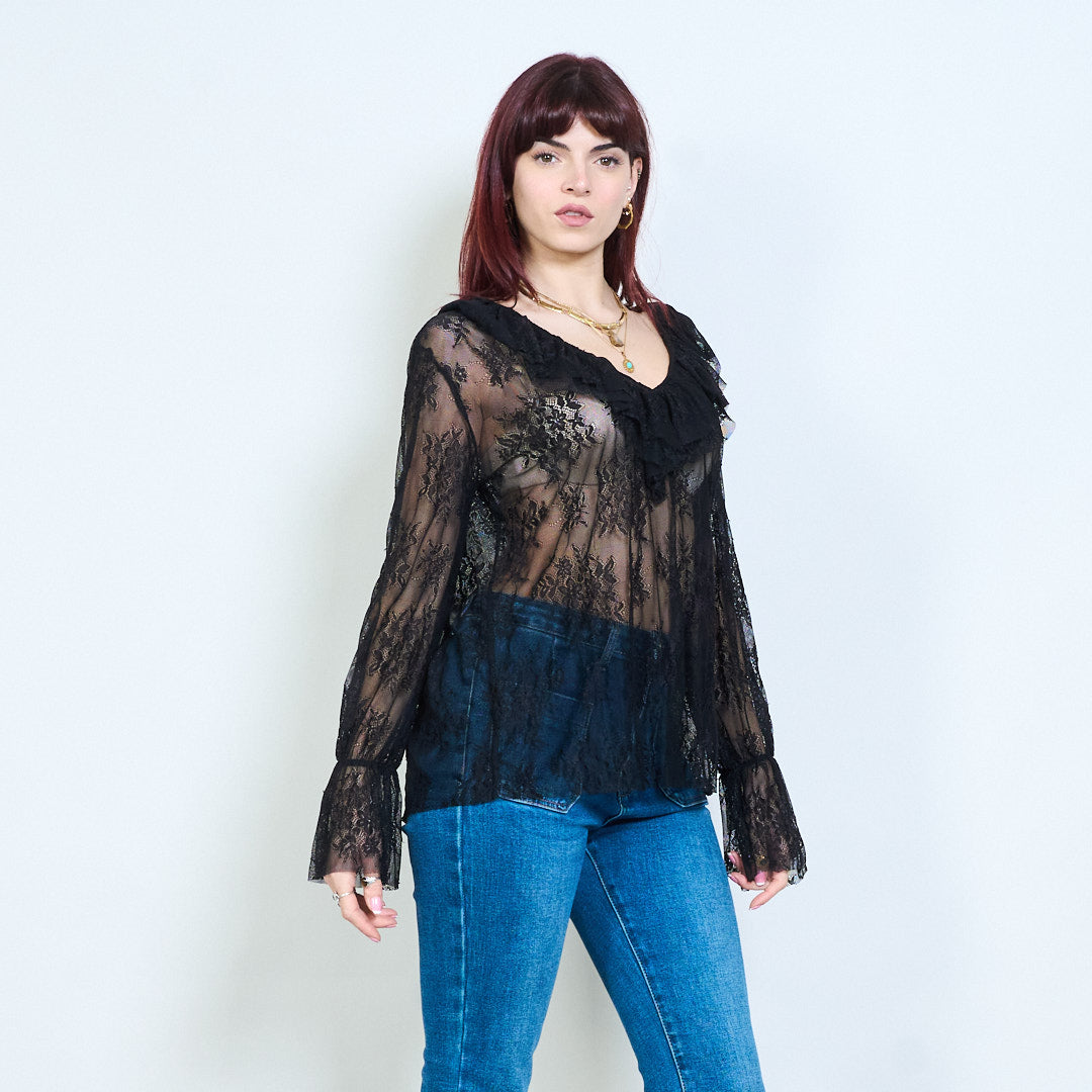 Blusa de manga larga plisada transparente de encaje floral al por mayor