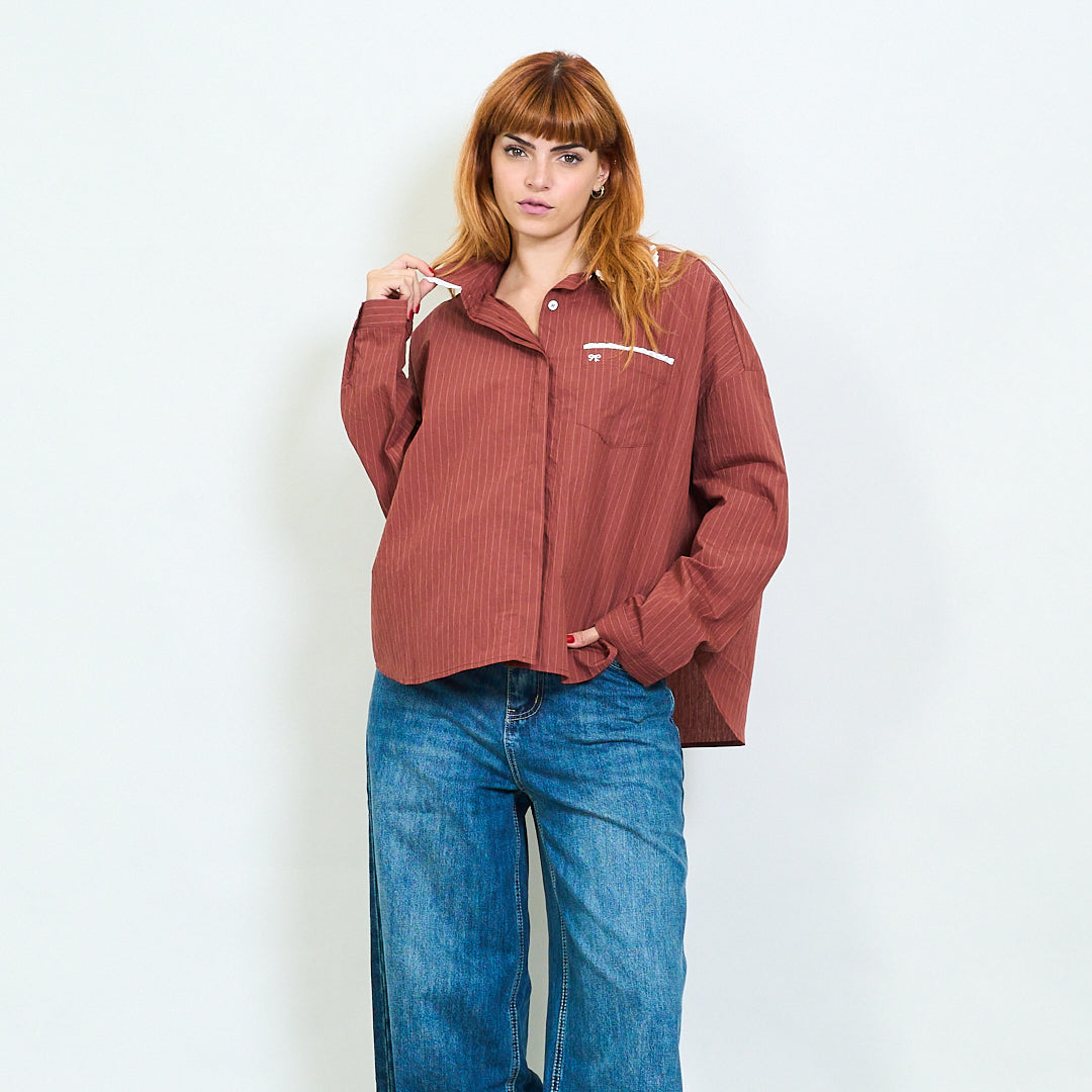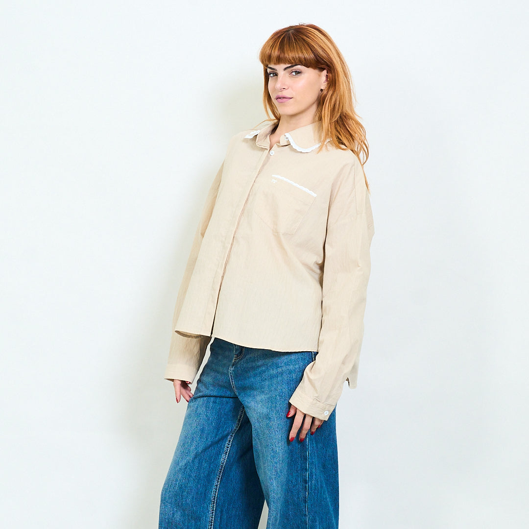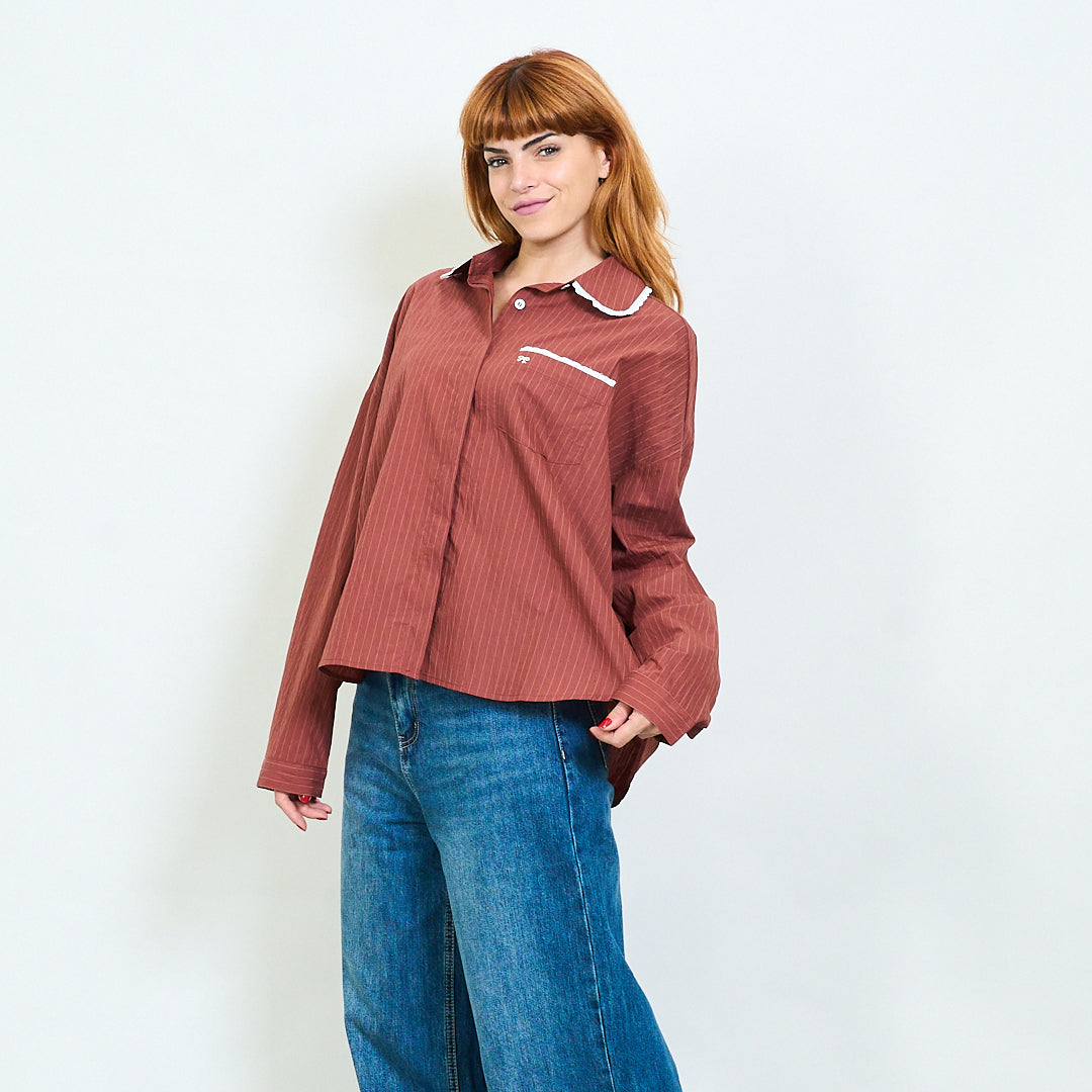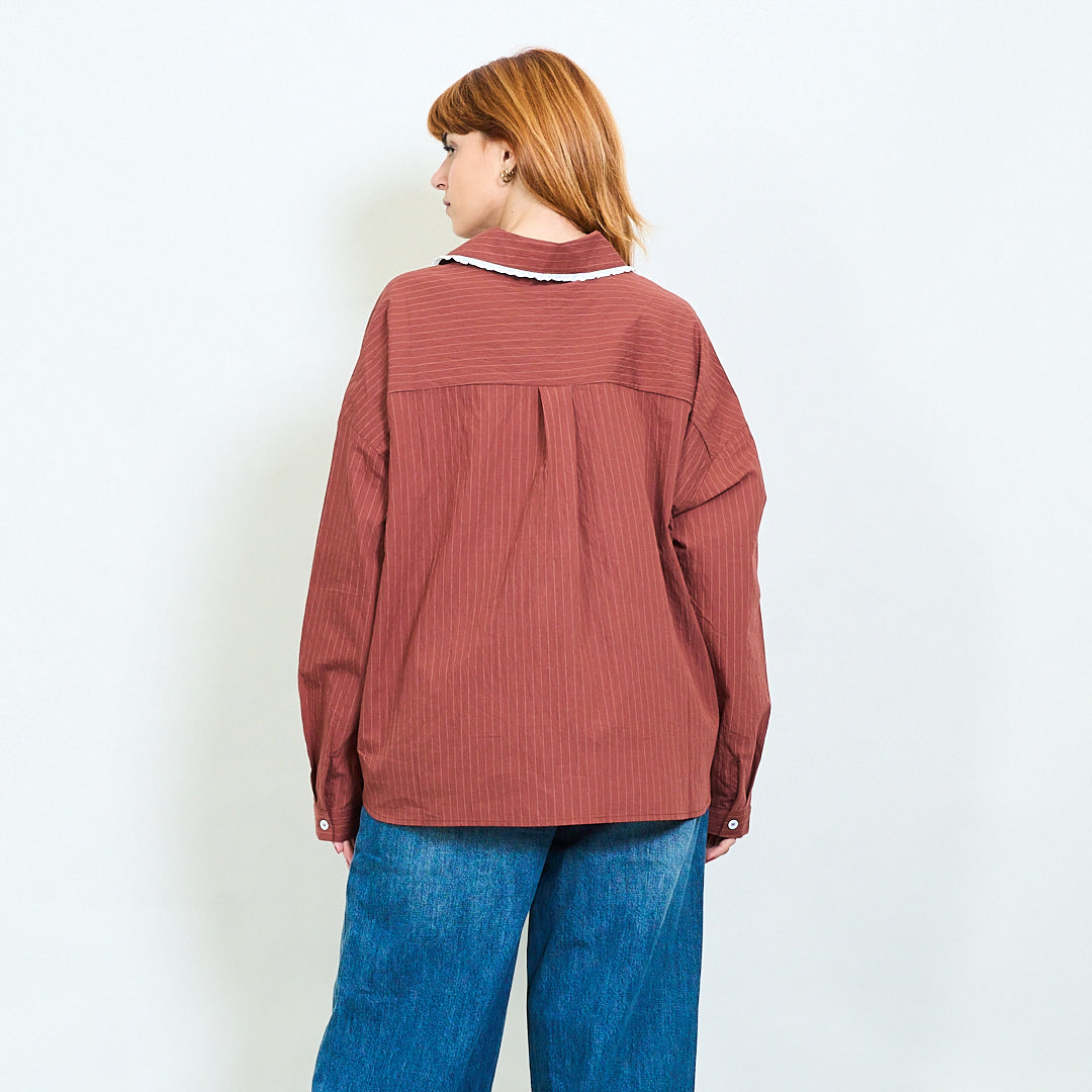 Blusa de rayas con collar de encaje y bolsillo para el pecho al por mayor