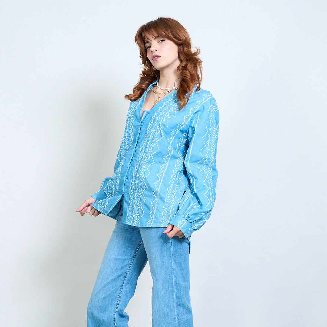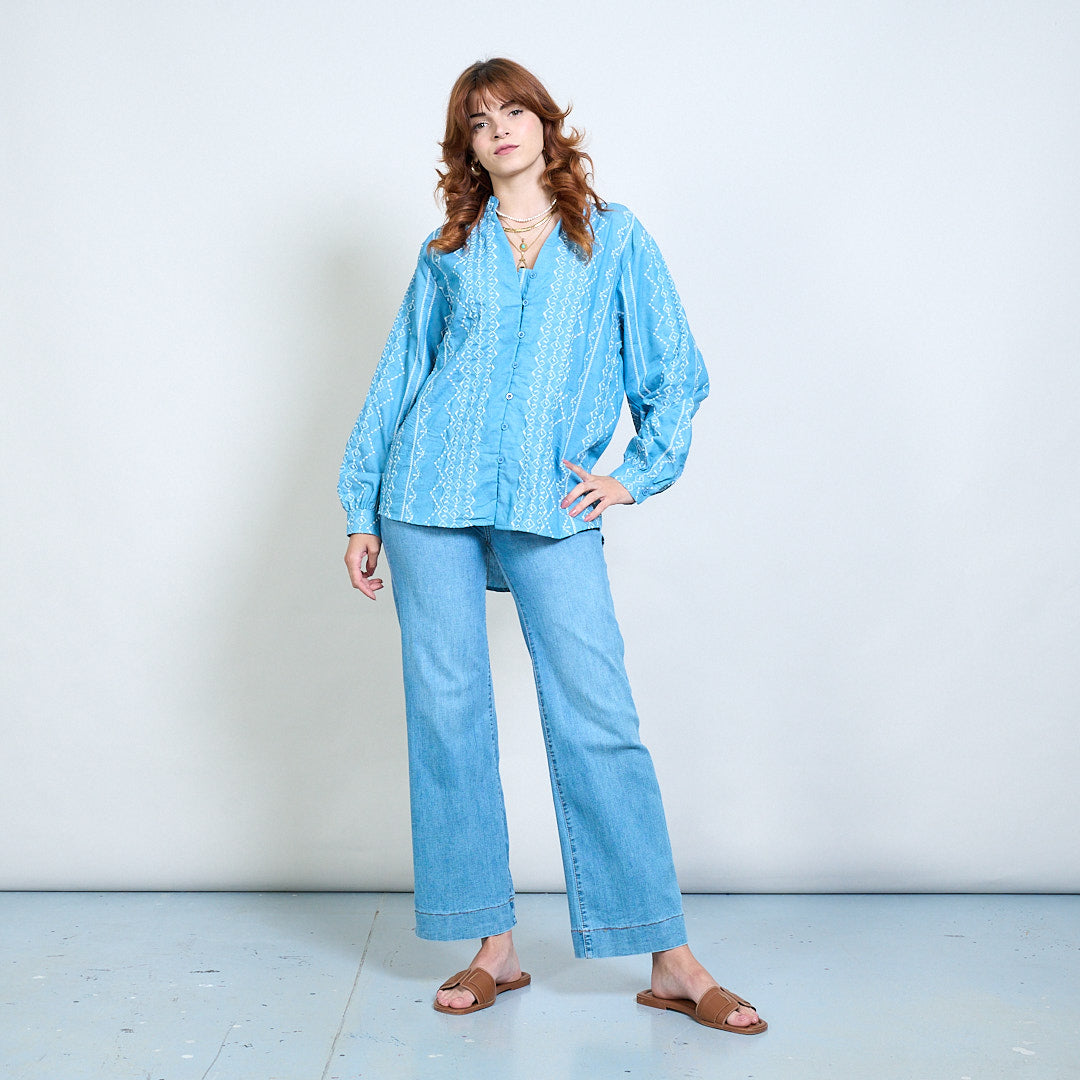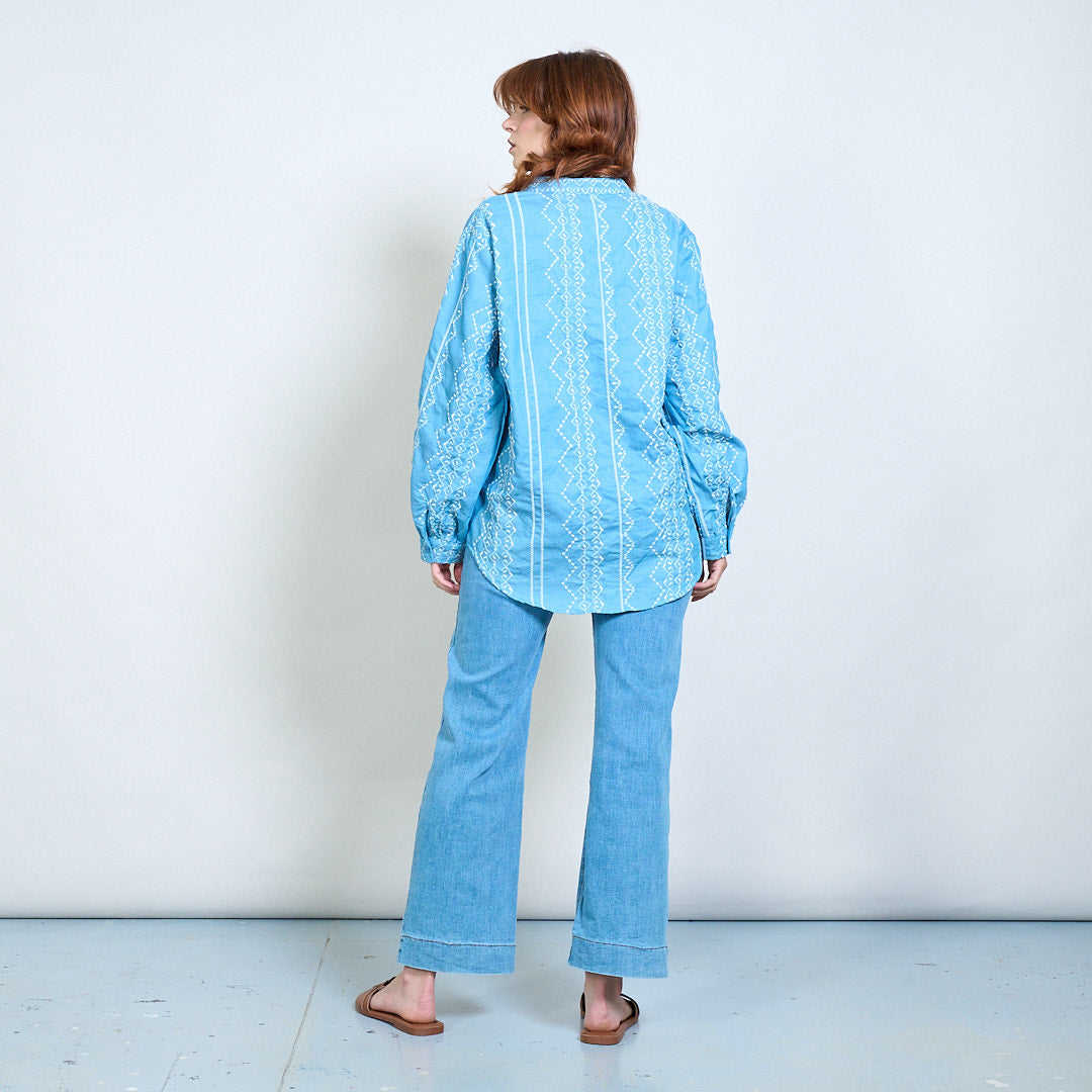 Camisa de la mezclilla de collar de mandarín bordado geométrico