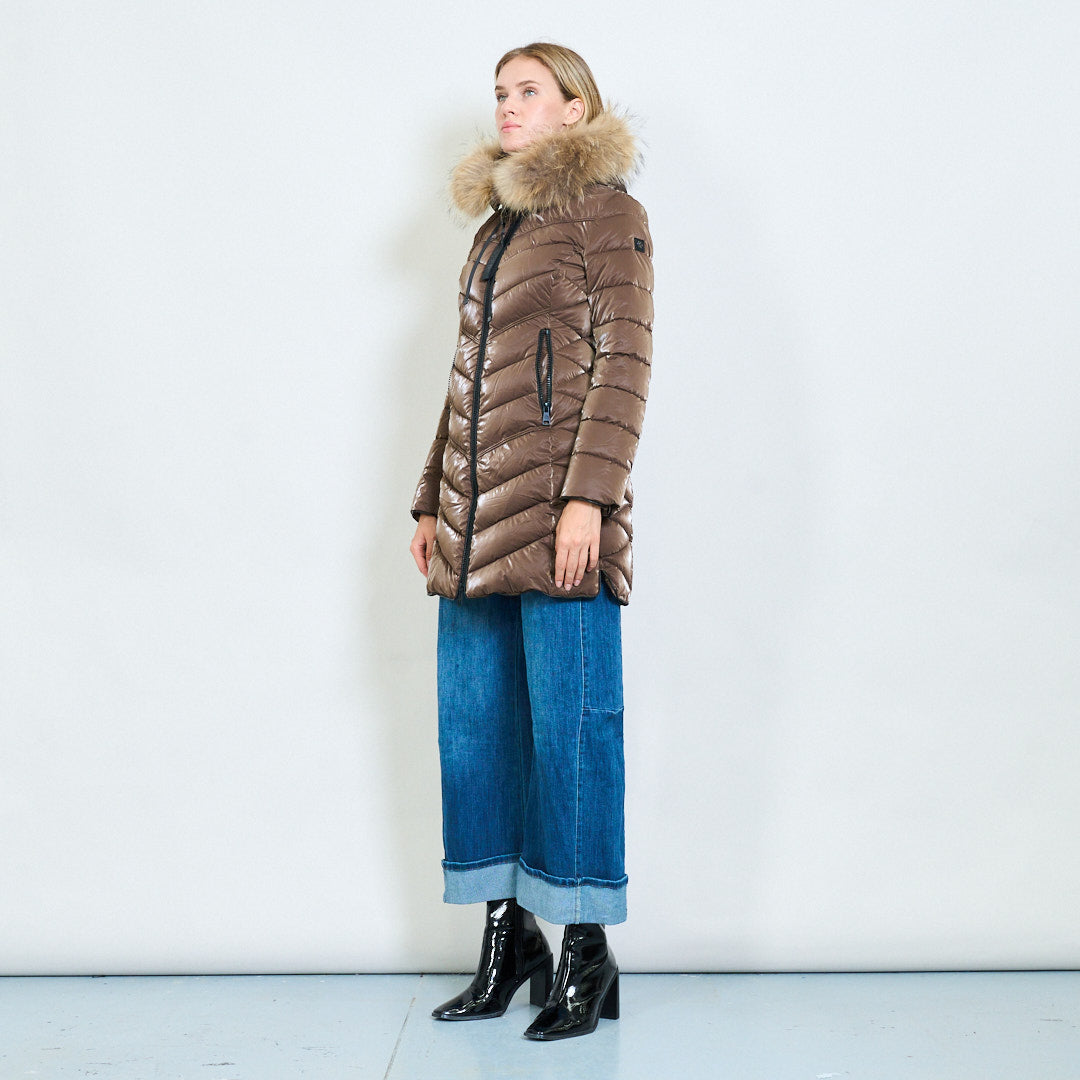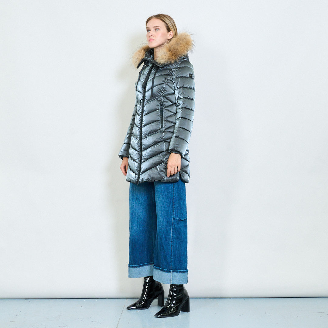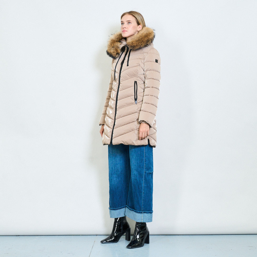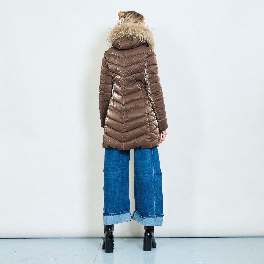 Capa acolchada de longitud media con moldura de capucha de piel sintética y contraste con cremallera al por mayor