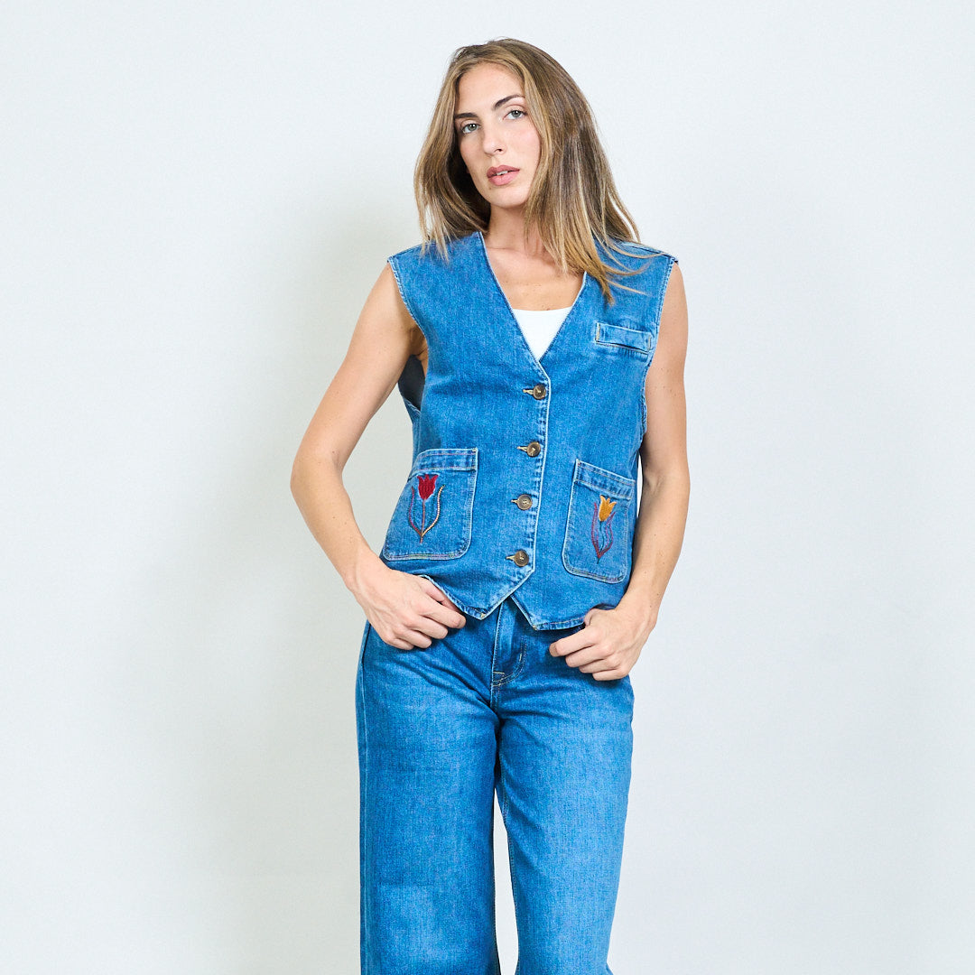 Chaleco de mezclilla con bolsillos bordados florales al por mayor